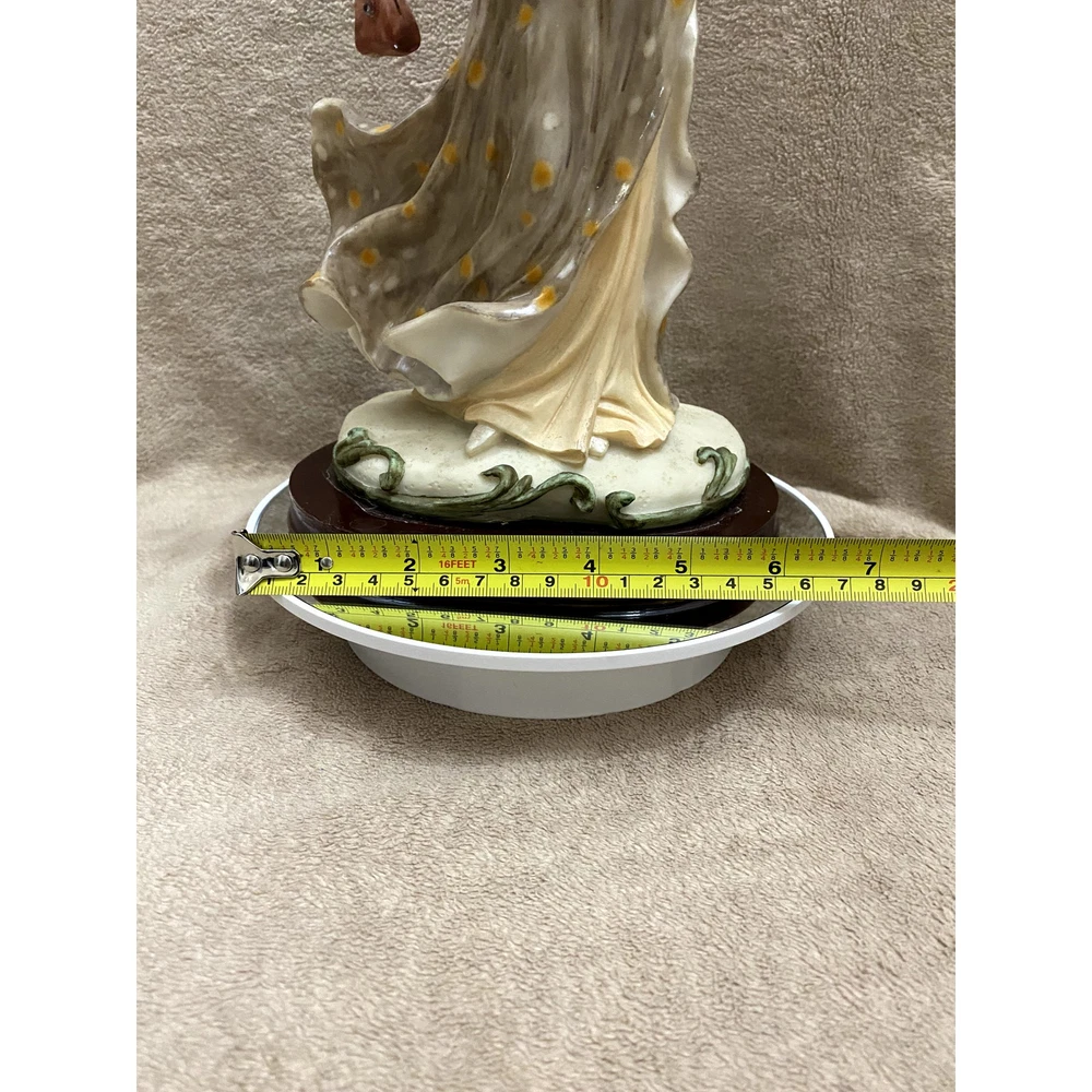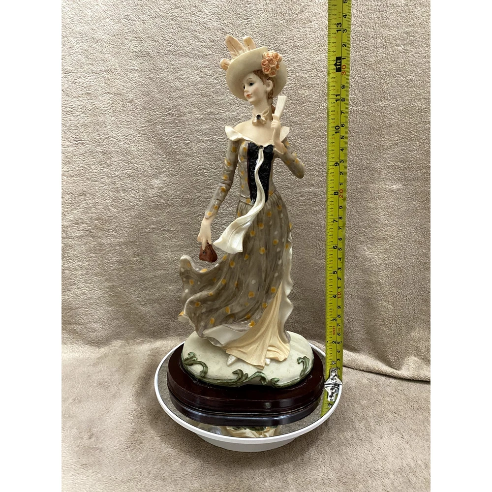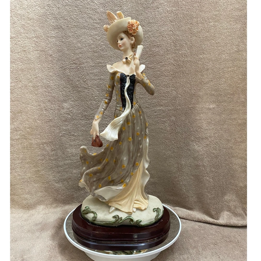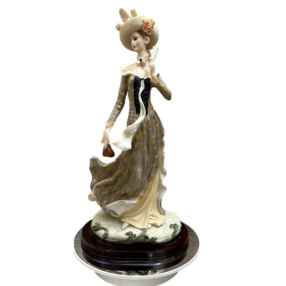 Casinelli Lareaux "Beautiful Lady" Figurine - Authentic Casinelli Lareaux collectible figurine titled "Beautiful Lady", crafted in the 1990s - Constructed from high-quality resin, featuring a woman adorned in a vibrant, multicolor dress and hat, elegantly holding a fan - Intricate detailing showcases the fine artistry typical of Casinelli Lareaux designs, making it a standout piece - Rests on a sturdy, dark wooden base measuring approximately 6” in width, enhancing the figurine's stability and aesthetic appeal - Includes a metal tag engraved with "Casinelli" on the base, affirming its authenticity - Overall dimensions: 13” in height, making it an impressive display piece for shelves, mantels, or tables - Origin: Marked with a "Made in China" sticker by manufacturer Lareaux, ensuring quality craftsmanship - Ideal for collectors of vintage figurines or those appreciating 90s era decorative arts - Condition: Handpicked; great condition; few to no discernible flaws but only what's consistent with age-wear like some scratches on the base; see photos as part of full description/condition; sold as is. This figurine, with its exquisite design and vibrant detailing, serves as both a charming collector's item and a delightful decorative piece for any home.