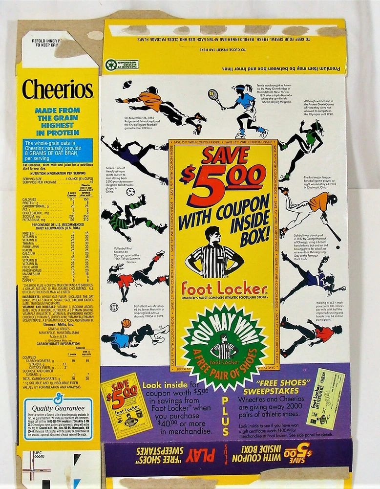 Vtg 1991 Cheerios Cereal Box Empty Big Foot Locker Coupon Advertisement Colorful Vtg 1991 Cheerios Cereal Box Empty Big Foot Locker Coupon Advertisement Colorful Here is a Vtg 1991 Cheerios Cereal Box Empty Big Foot Locker Coupon Advertisement Colorful. It's dated June 1991, it's in very good condition other than being broken down and flat, what you see is what you get, it's a large flat box, it's 16" long x 11" wide. Thanks for looking My pictures are part of the description. ALWAYS ENLARGE THE PHOTOS FOR BEST VISUAL DESCRIPTION. QUESTIONS OR CONCERNS? Please email with any you might have US Shipping is usually via USPS Mail. We strive to ship within one day, however sometimes life interferes. We will contact you if there is any problem whatsoever. We have owned a packaging and shipping business in the past and know how to properly package your item. Ebay is becoming a large part of our business, so if you are not happy with our service, please let us know prior to giving negative feedback. We will do what we can to rectify the situation. For breakable items, we prefer to ship via Priority. We will gladly combine shipping for multiple items. Please email us with any questions. Thanks for looking! Good luck. Listing and template services provided by inkFrog