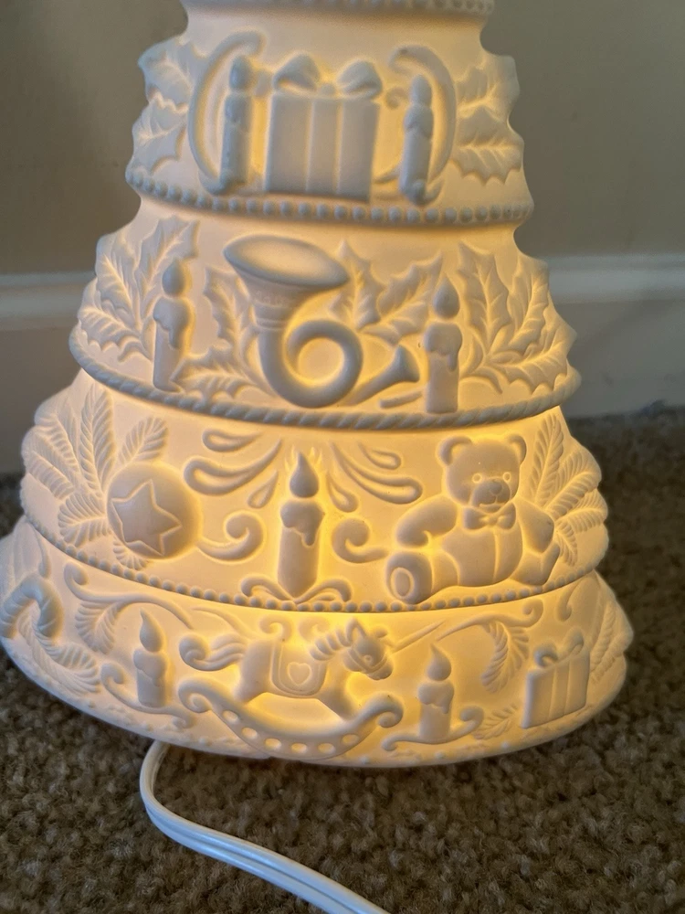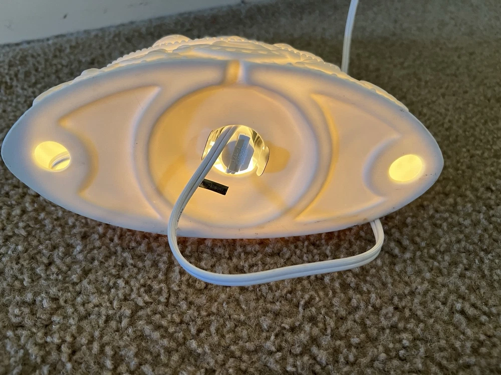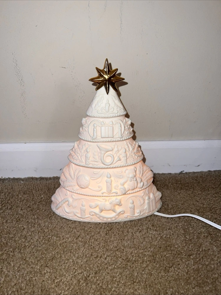 Adorn your space with the serene glow of this vintage 1998 White Christmas Tree Night Light. Designed as a delightful wall decor piece, it features a charming gold star porcelain bisque that exudes a timeless elegance. Perfect for creating a festive atmosphere in any room, this artificial tree serves as a subtle, yet enchanting, reminder of the holiday season all year long. Crafted with care, this unbranded night light is a testament to the holiday's lasting allure. Whether it's lighting up your nursery or adding a touch of whimsy to your living space, this porcelain tree is a sweet addition to your home decor collection, ready to bring a bit of Christmas cheer to your everyday. Used