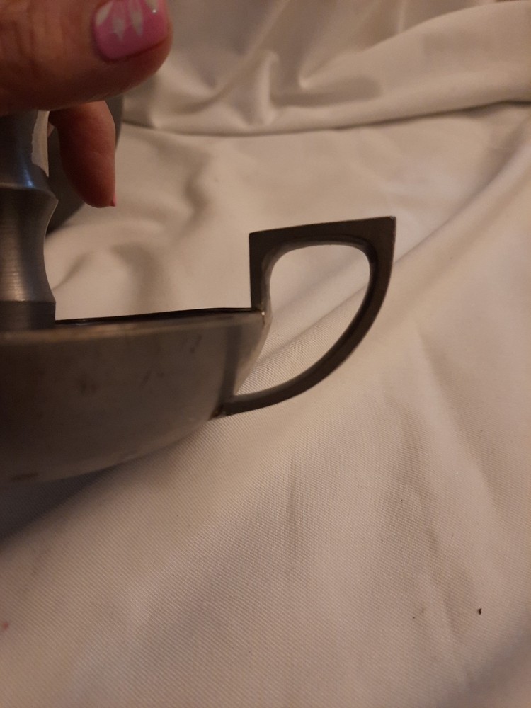 These vintage pewter taper candle holders are modeled after American Colonial chambersticks from the 18th or 19th century. Made in Hong Kong , they feature a gray color with a brushed finish and an all-over pattern. Suitable for all occasions, these small candle holders are perfect for adding a touch of Colonial style to any home decor. With handles for easy carrying, these candle holders are a charming and nostalgic addition to any collection.