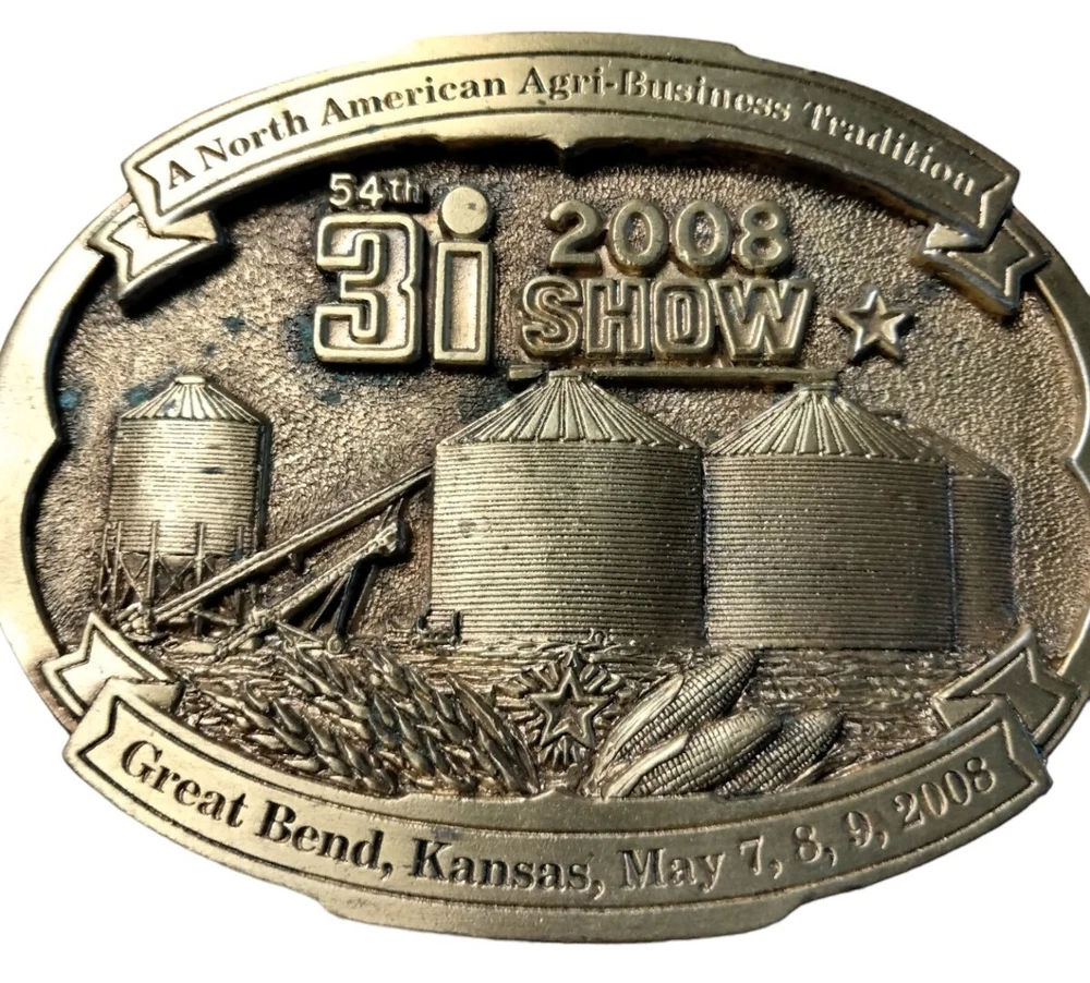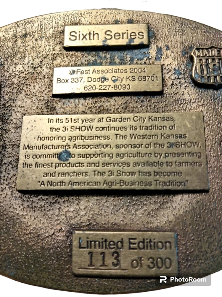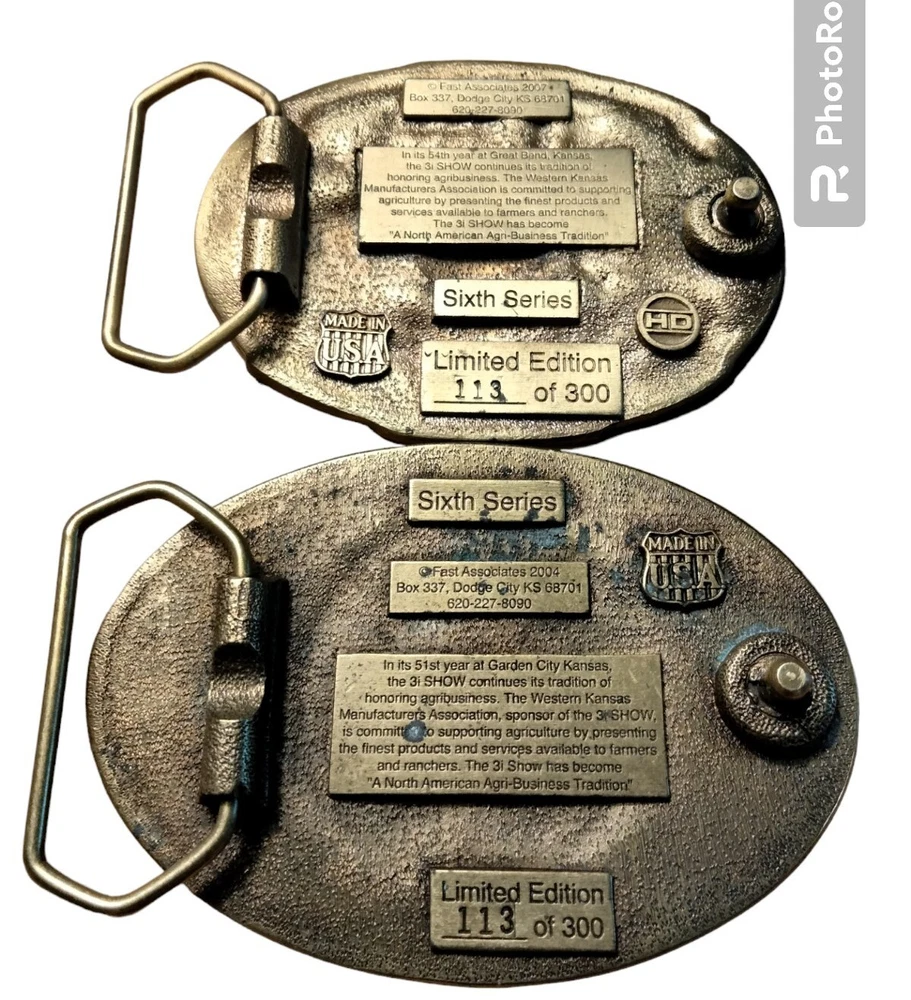 This vintage belt buckle set features two pieces with a North American Agri-Business Tradition theme. One has Garden City Kansas 2005 on it and is Ltd Edition 113 of 300 Sixth series. The other one is Great Bend Kansas 2008 6th in the series Ltd edition #113 of 300. Made by Siskiyou in the United States, The set is perfect for anyone who is a fans of farming and agriculture. Both belt buckles are being sold as one lot. The buckles have scratches and need cleaning.