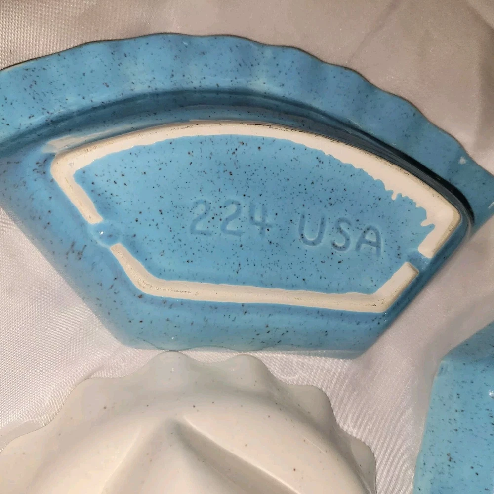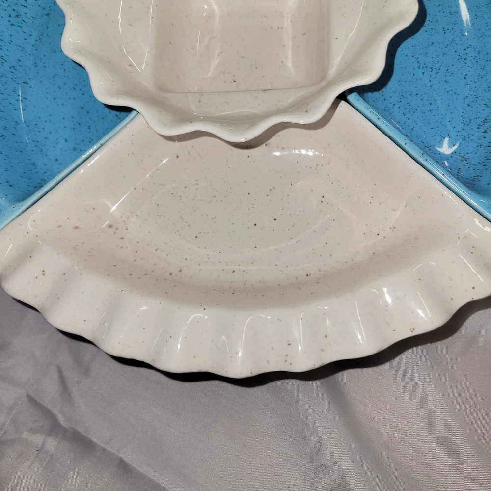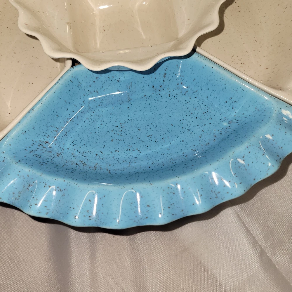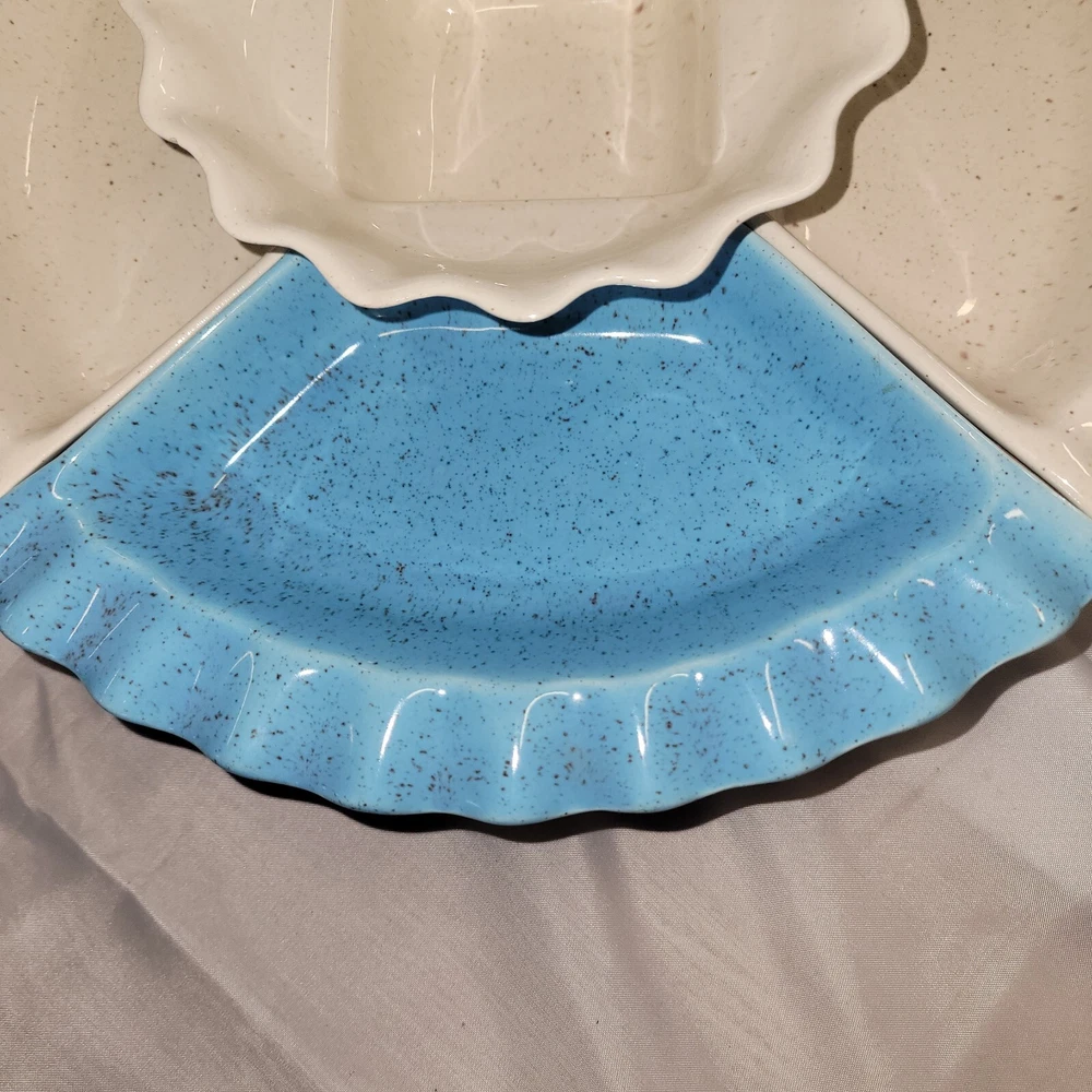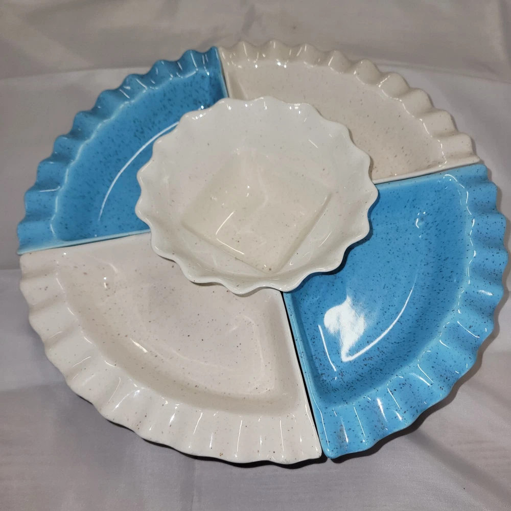 This absolutely gorgeous vintage six-piece Chip & Dip Bowl Set is from California Pottery, featuring a blue and white with brown speckles throughout design. The set includes a Lazy Susan, four trays, and a dip bowl, all revolving on a round tray. Made of ceramic in the Mid-Century Modern style, this original 1960s set is a unique addition to any serving collection.