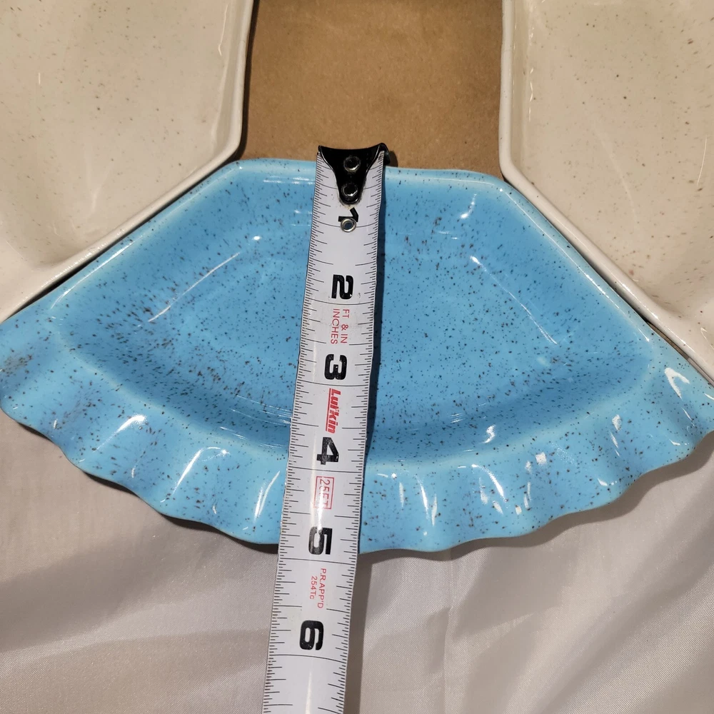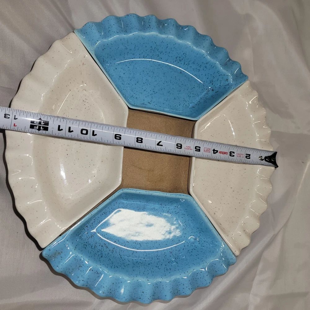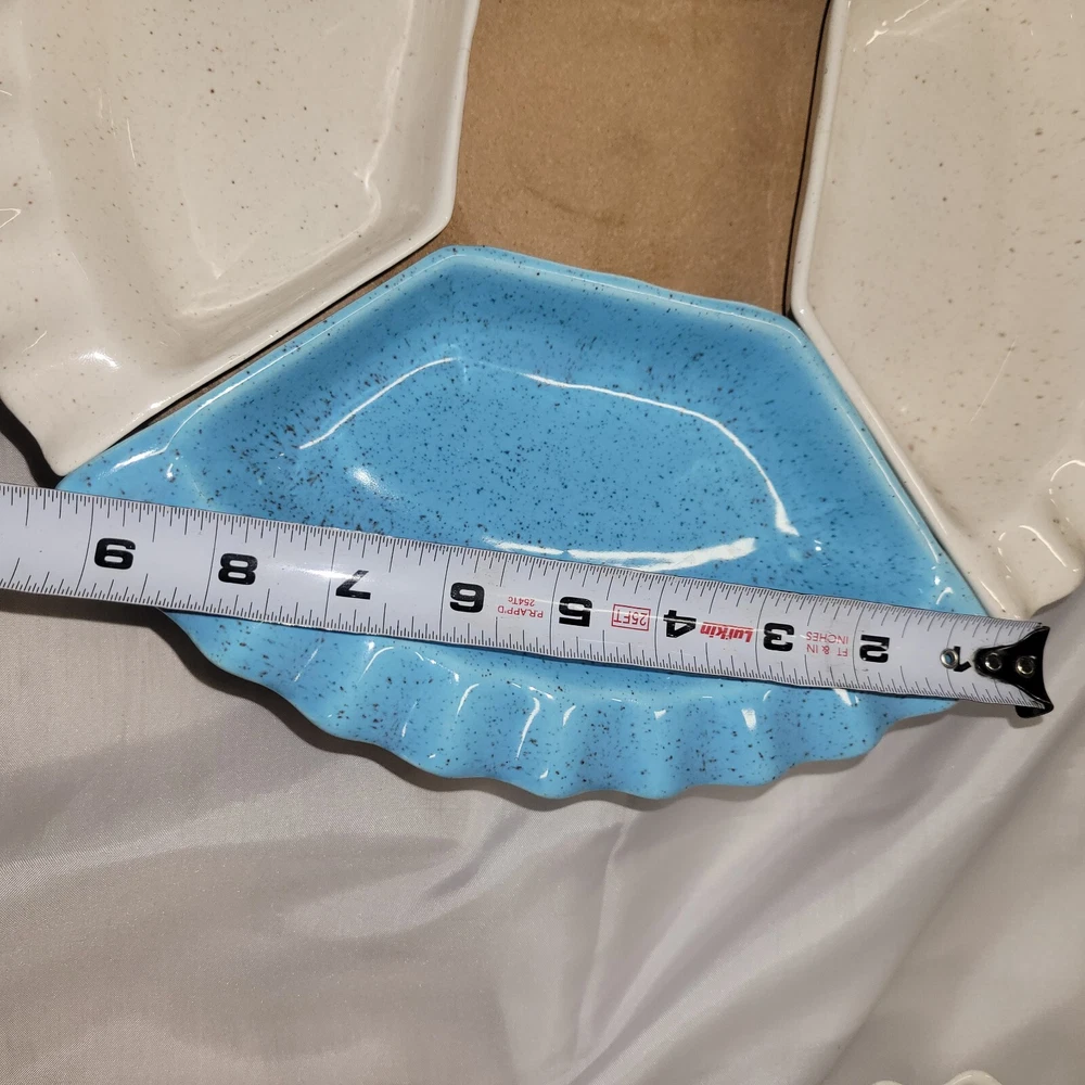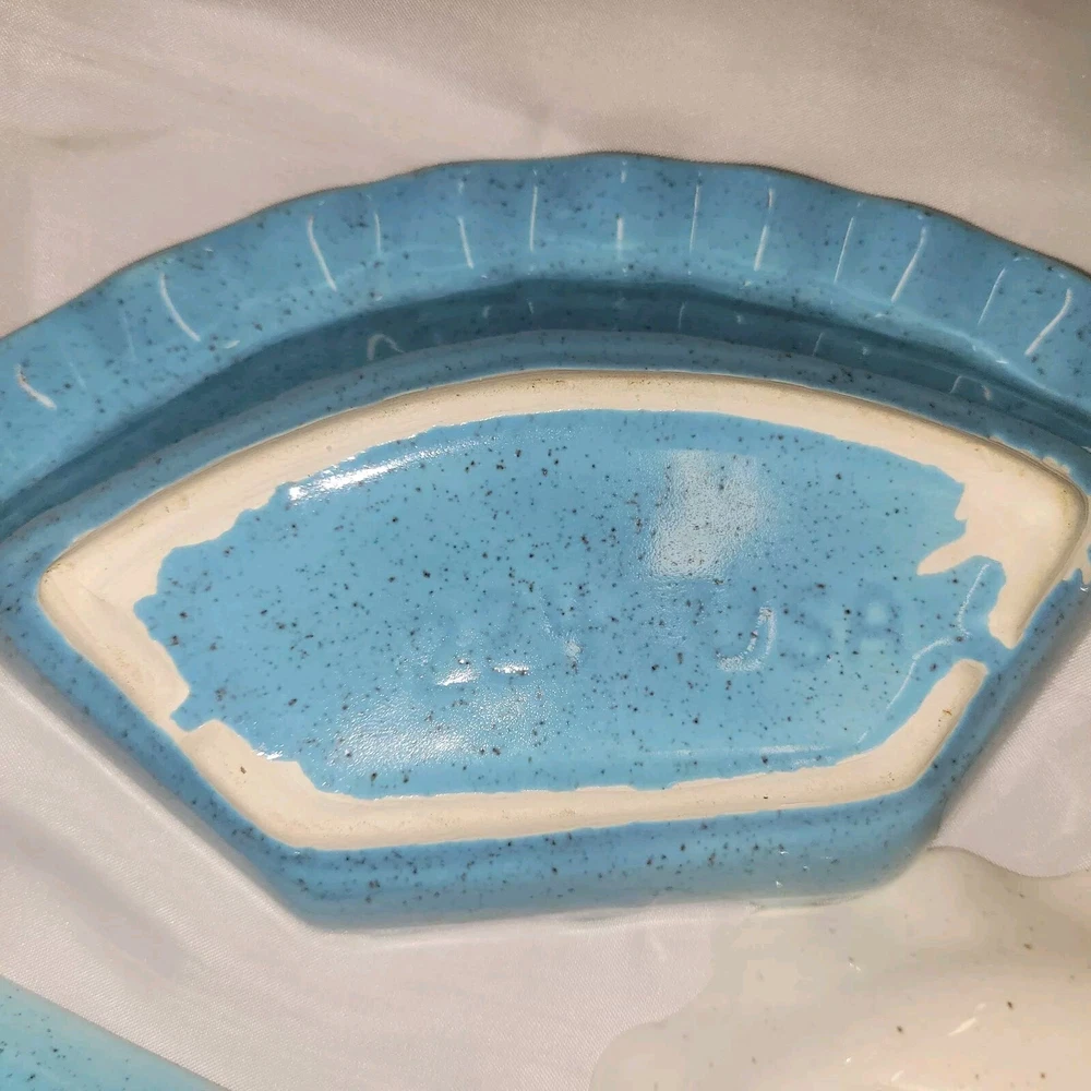 This absolutely gorgeous vintage six-piece Chip & Dip Bowl Set is from California Pottery, featuring a blue and white with brown speckles throughout design. The set includes a Lazy Susan, four trays, and a dip bowl, all revolving on a round tray. Made of ceramic in the Mid-Century Modern style, this original 1960s set is a unique addition to any serving collection.