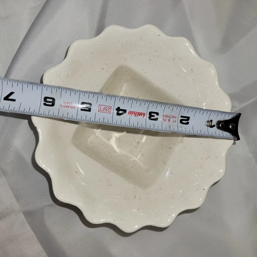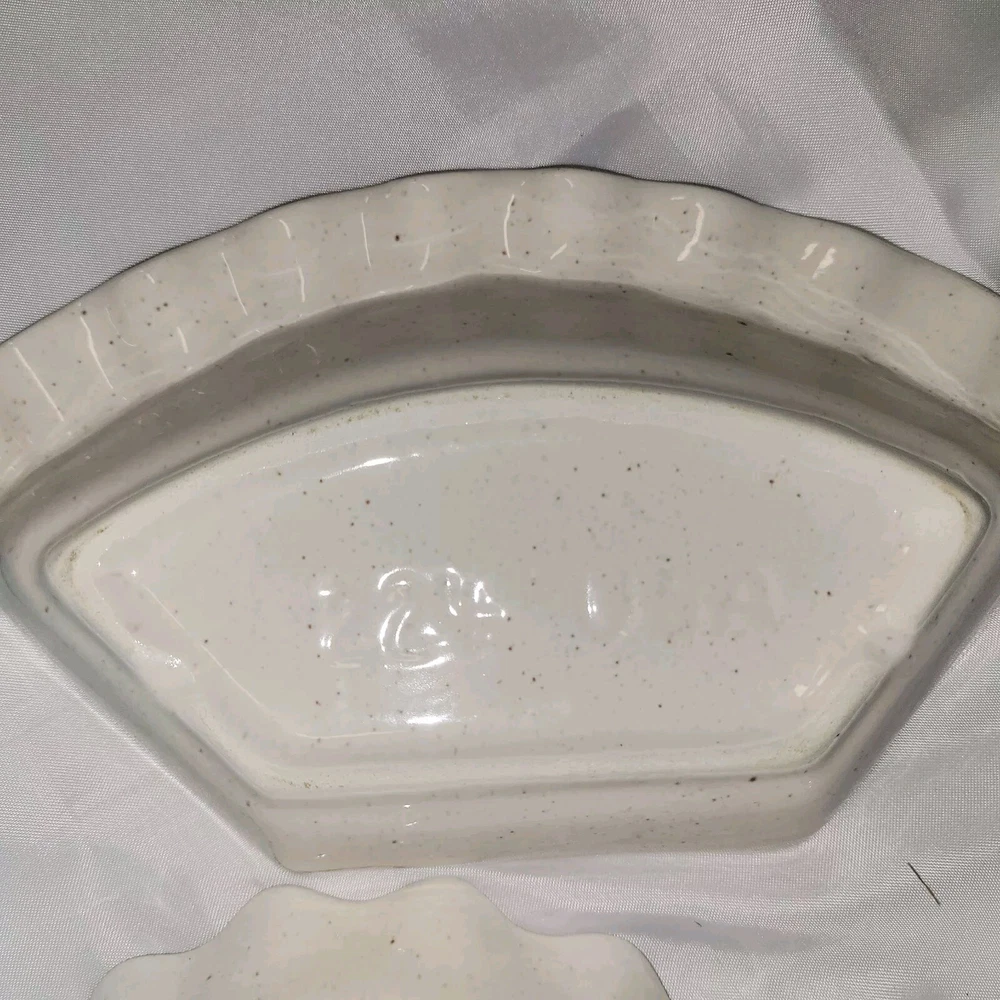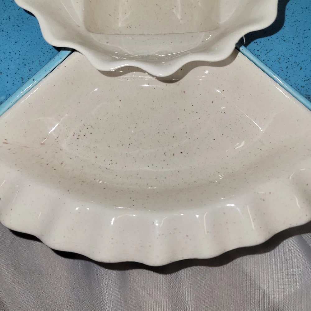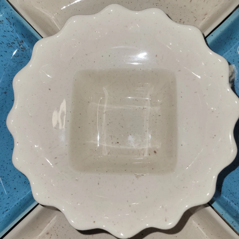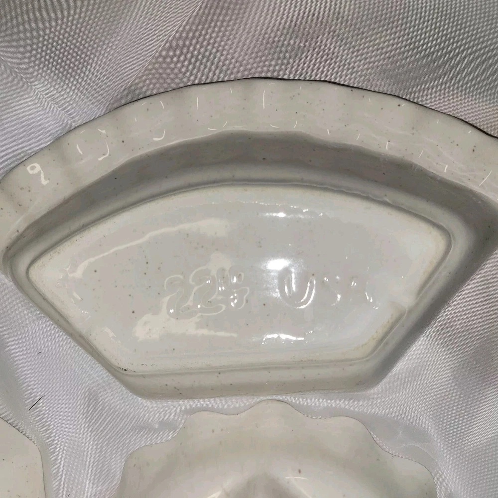 This absolutely gorgeous vintage six-piece Chip & Dip Bowl Set is from California Pottery, featuring a blue and white with brown speckles throughout design. The set includes a Lazy Susan, four trays, and a dip bowl, all revolving on a round tray. Made of ceramic in the Mid-Century Modern style, this original 1960s set is a unique addition to any serving collection.