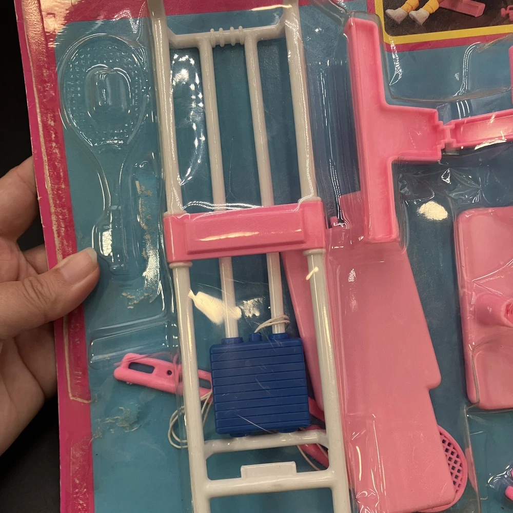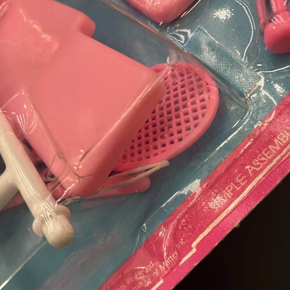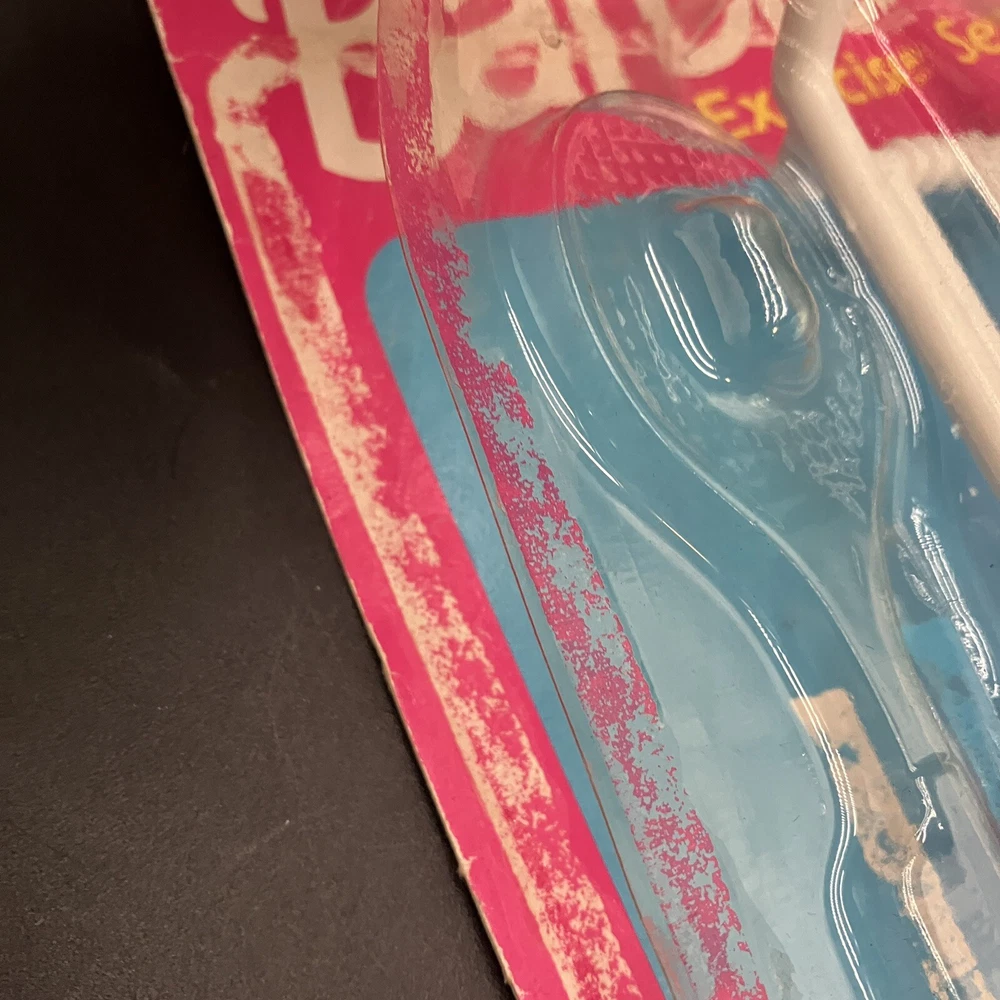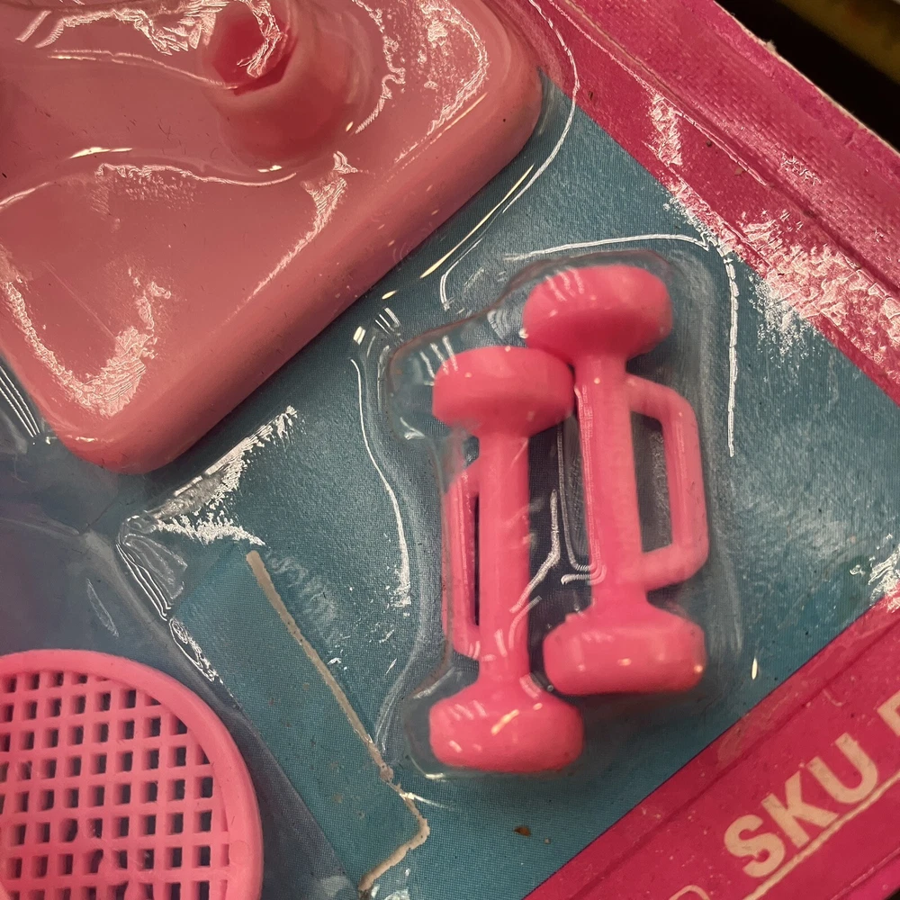 Step back in time with this rare vintage 90s Barbie exercise play set! This retro home gym set includes a tennis racket, dumbells, and an exercise set, perfect for fashion doll enthusiasts and collectors alike. The pink plastic furniture set is an original Mattel product, manufactured in 1990, and is compatible with 11 inch dolls. The set is an original and licensed reproduction, featuring assembly required for setup. The furniture type is an exercise set, and it is perfect for creating an exercise room for your Barbie doll. This Barbie accessory is a must-have for any vintage doll collector, and is sure to make a great addition to your collection. CONDITION: Pre-owned on original card, However, card adhesive has worn off over the years and toys inside have moved from original sealed state. Missing tennis balls as they probably rolled right out of the packaging without original owner realizing. I have been able to account that the rest of the parts are still on the card. ****SHIPS NEXT BUSINESS DAY****