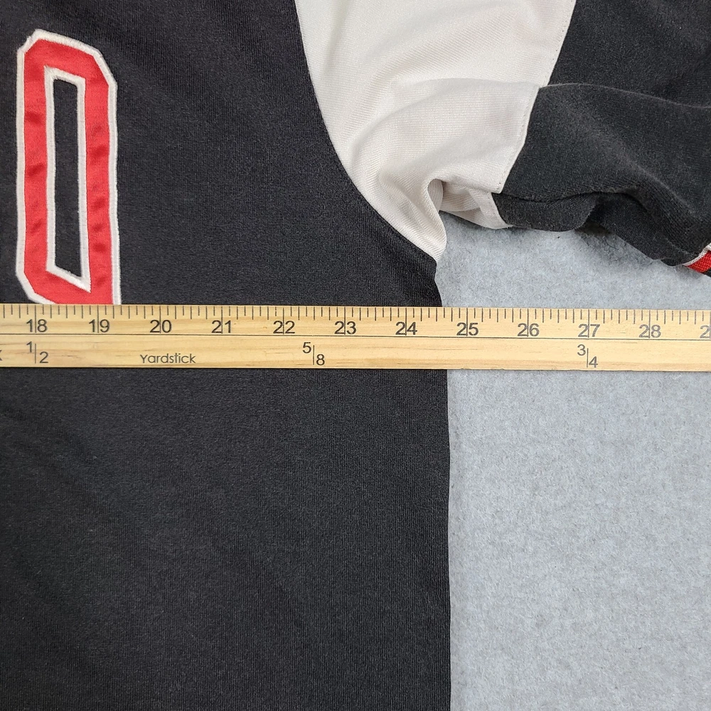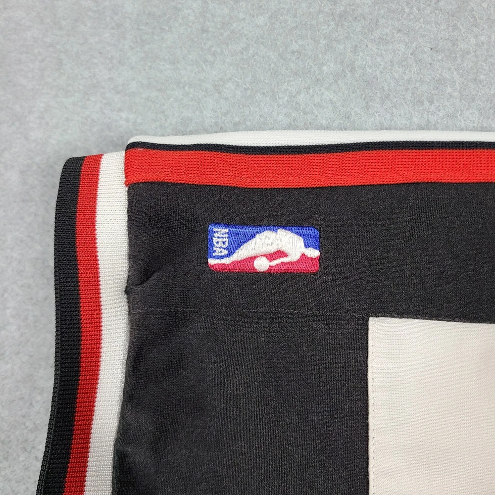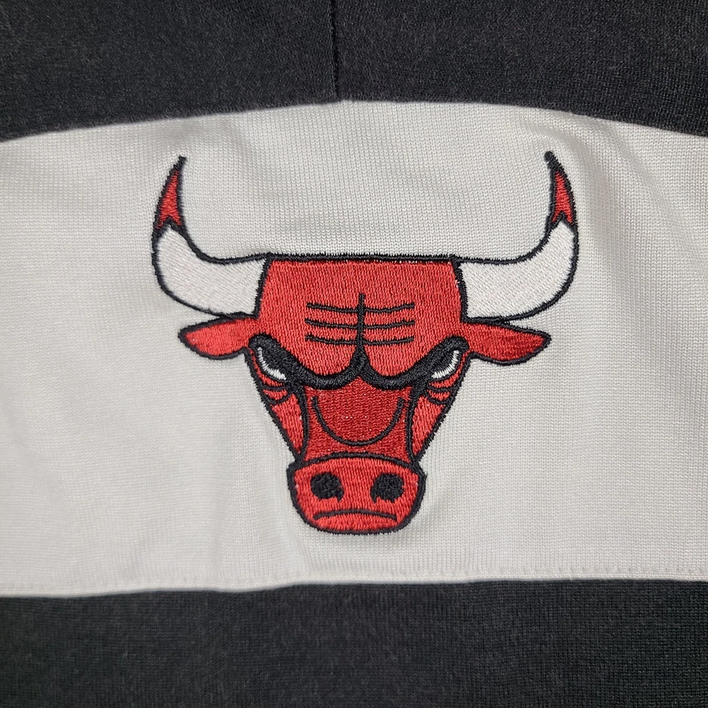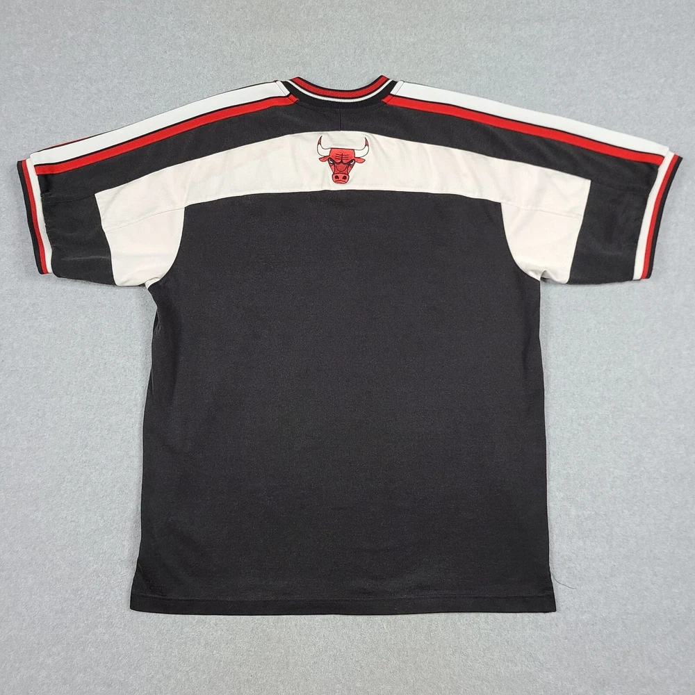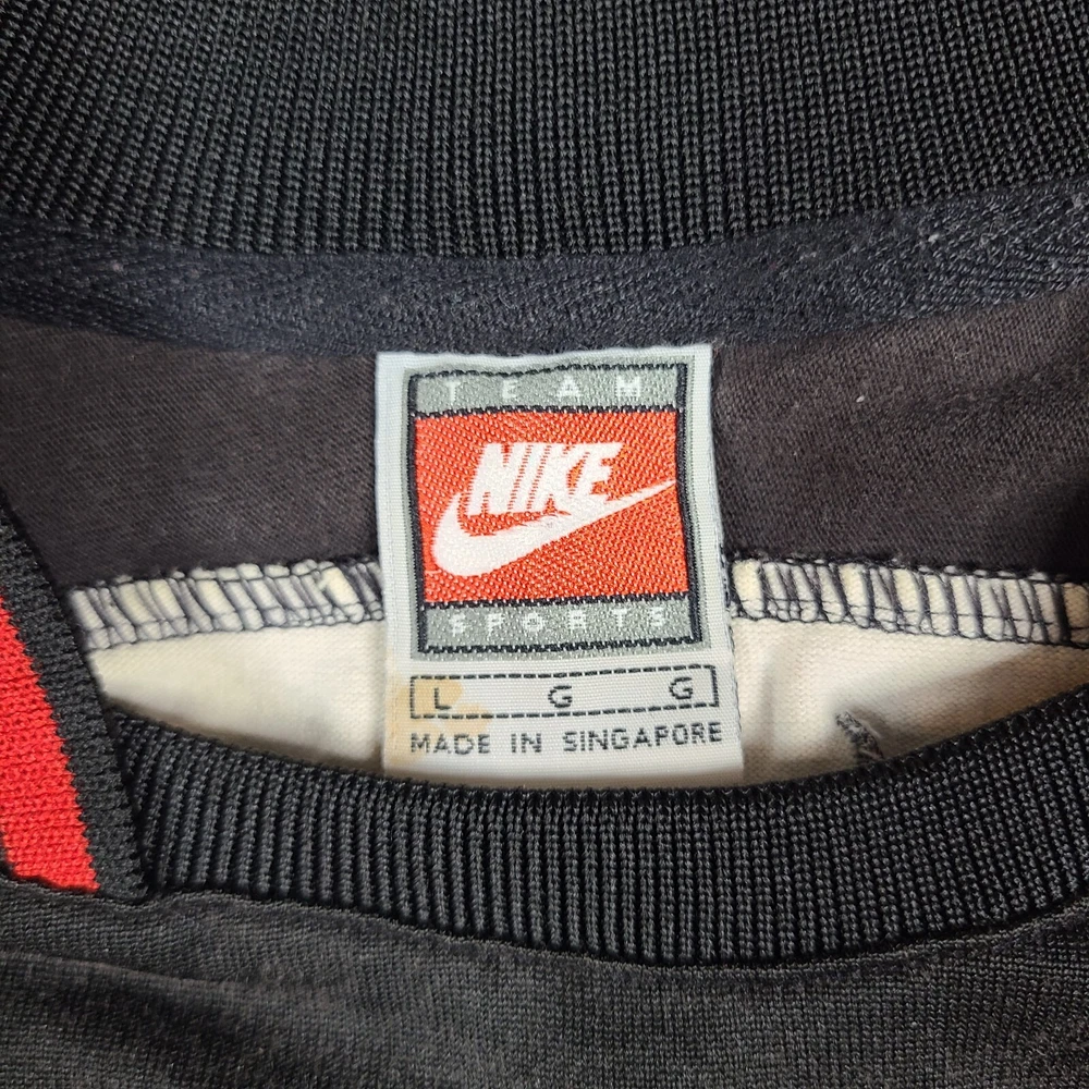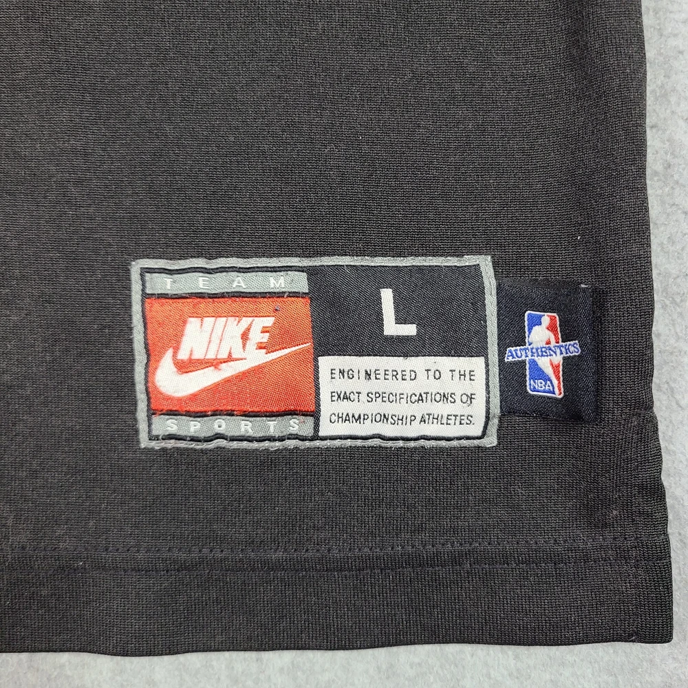 This vintage 90s Nike Chicago Bulls NBA warm-up jersey T-shirt features a classic design with the team's logo and Michael Jordan's name. The shirt is officially licensed by the NBA and made in Singapore. It's perfect for basketball fans who want to show their support for the Chicago Bulls during the regular season. The shirt is size L and black in color. Whether you're a collector or just a fan, this shirt is a must-have addition to your sports memorabilia collection.