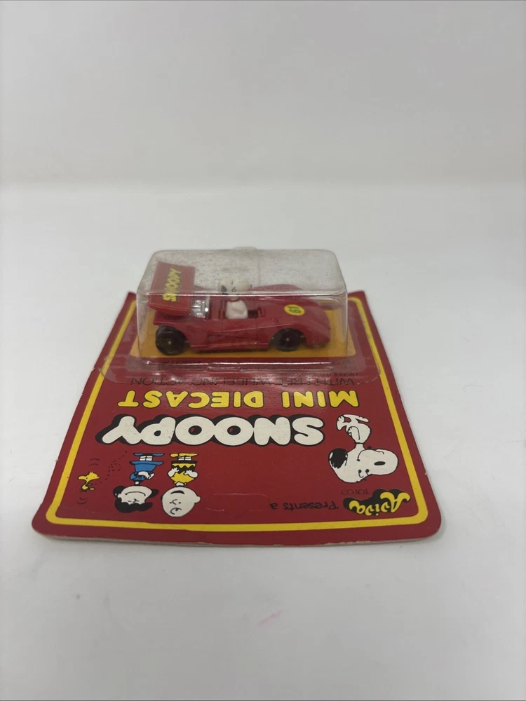 This vintage AVIVA Snoopy Mini Diecast from 1965 features Snoopy in a red race car. Made in Hong Kong, the diecast vehicle is multi-colored and approximately 1/64 scale, measuring 2.65 inches long. Suitable for all genders, this collectible piece is part of the SNOOPY Mini Diecast series.