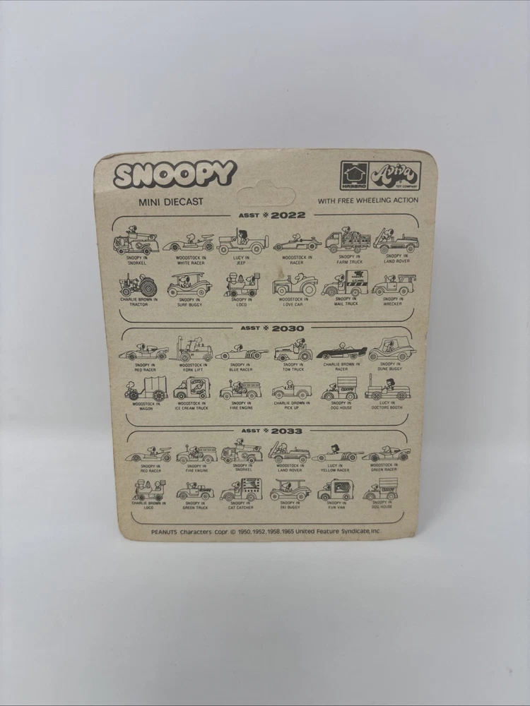 Country/Region of Manufacture: Hong Kong Vehicle Type: RED Racer Series: SNOOPY Mini Diecast Scale: Approximately 1/64 and 2.65 inches long Brand: AVIVA Material: Diecast Year of Manufacture: 1965 Color: Multi-Color Gender: All