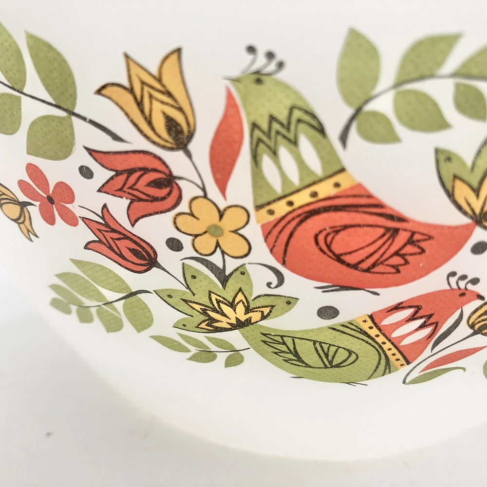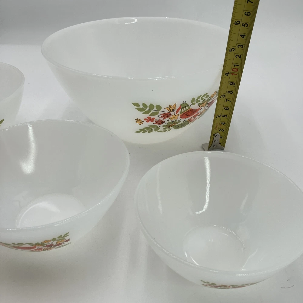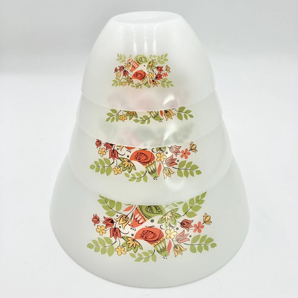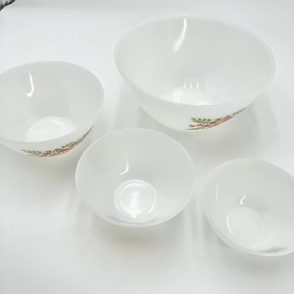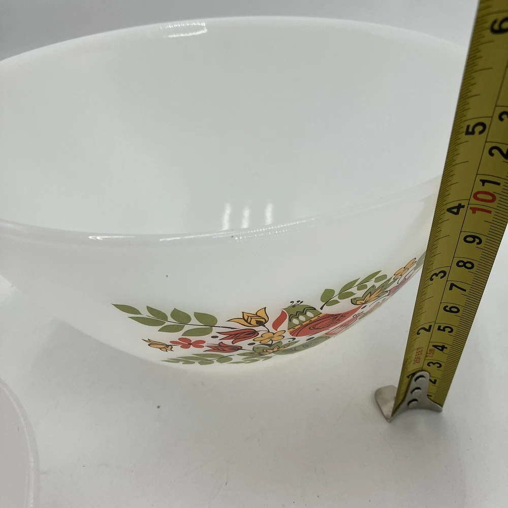 Add a touch of vintage charm to your dining table with this four-piece nesting bowl set from Arcopal France. The round bowls feature a delightful partridge bird pattern in multicolor and are made of high-quality milk glass. The set includes four bowls with a diameter of 9 inches, perfect for serving salads, fruits, or desserts. This mid-century modern style bowl set is an original piece from the 1960s and is perfect for all occasions. The set is easy to clean and maintain, and it is recommended to hand wash only. This Arcopal France bowl set is a great addition to any vintage dinnerware collection and is sure to impress your guests. CONDITON: No chips, cracks, damage. No dish washer damage. Has some very light scuffing due to previous usage. ****SHIPS NEXT BUSINESS DAY****