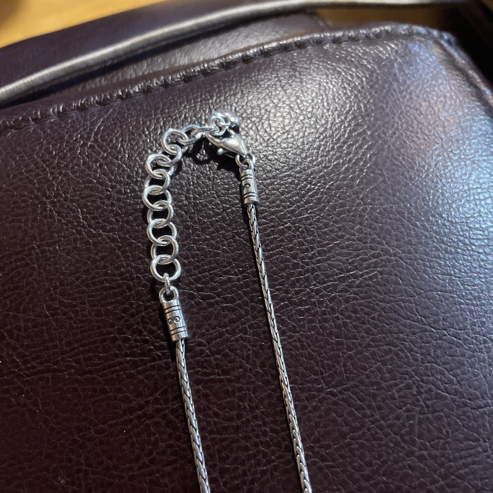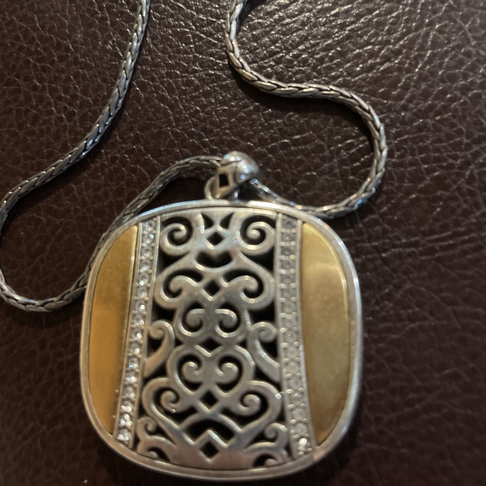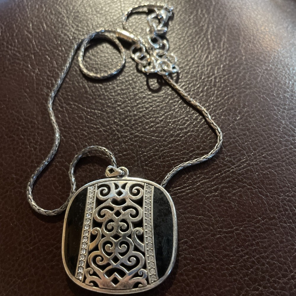 The Vtg BRIGHTON Shadow Play Reversible Black Gold Silver Crystal Pendant Necklace is a stunning piece of jewelry featuring a reversible design in black, gold, and silver tones. The necklace is adorned with 32 white/colorless crystals and is made of silver plated metal with a lobster closure. It has a 21 inch spiga/wheat chain and is perfect for special occasions like engagements, weddings, and birthdays. The pendant style and adjustable features make it a versatile and stylish accessory for any woman looking to add a touch of beauty to her outfit.