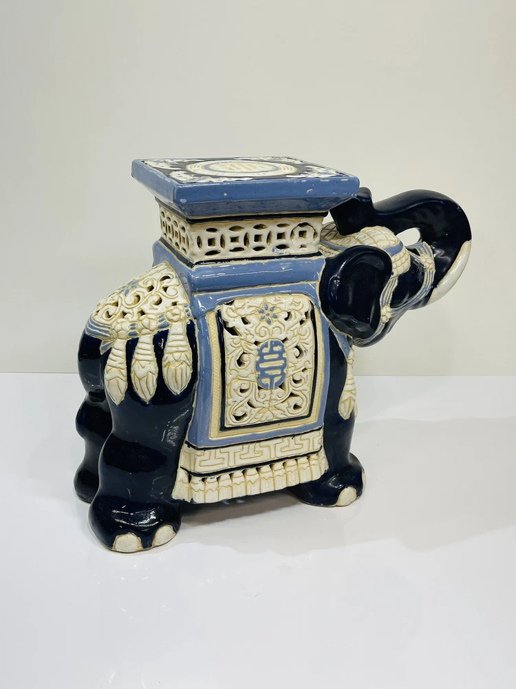 Vtg Blue Glazed Ceramic Elephant | Chinese Garden Stool | Pedestal | Side table. Measuring 20 inches long by 15 inches high and about 9 inches wide. It weighs just under 15 pounds.. it does show some signs of age such as crazing And some small imperfections in the glaze. There is a chip in the glaze on the tusk and a small one on the snout, as well as one on the dark blue line in the center of the elephant all three imperfections are shown in the last photos. Having just shipped one , It will be double boxed insured and signature confirmation added to insure safe delivery..