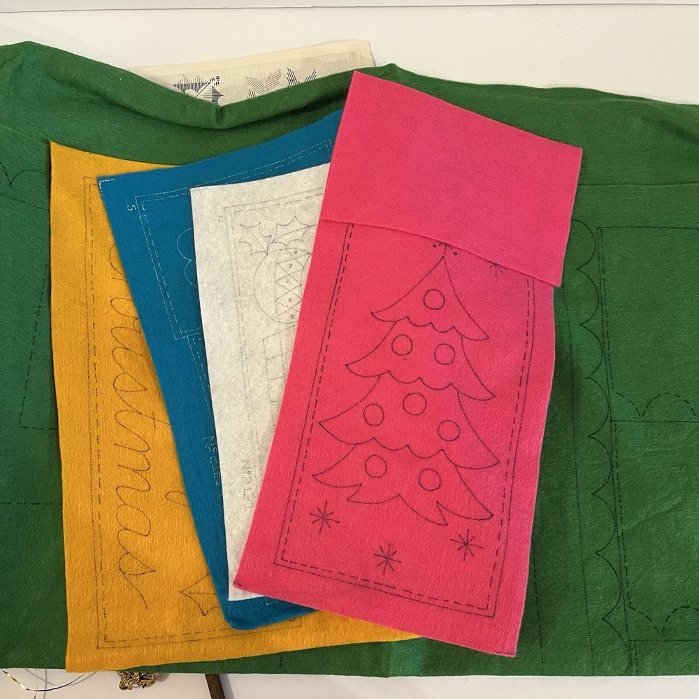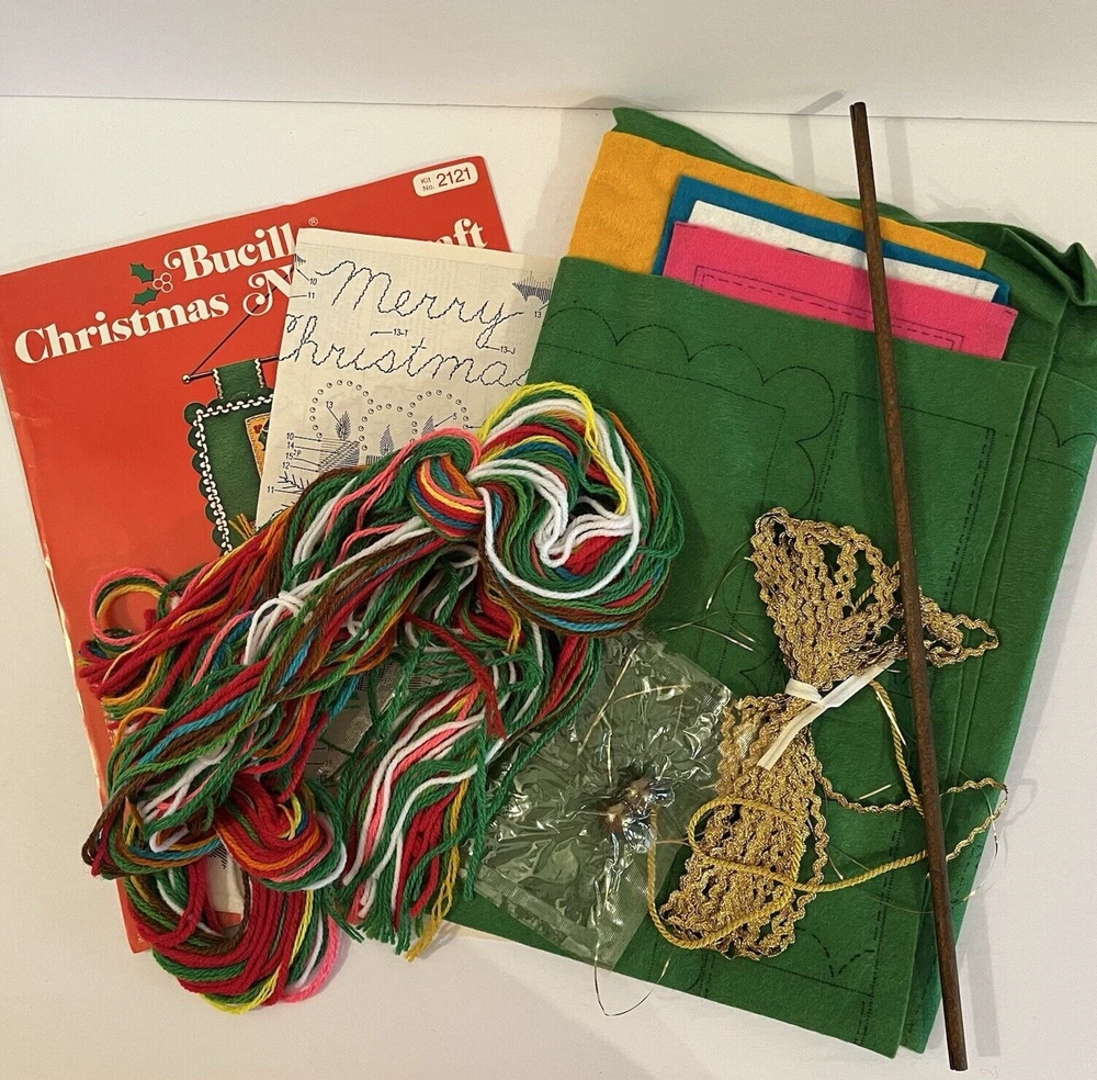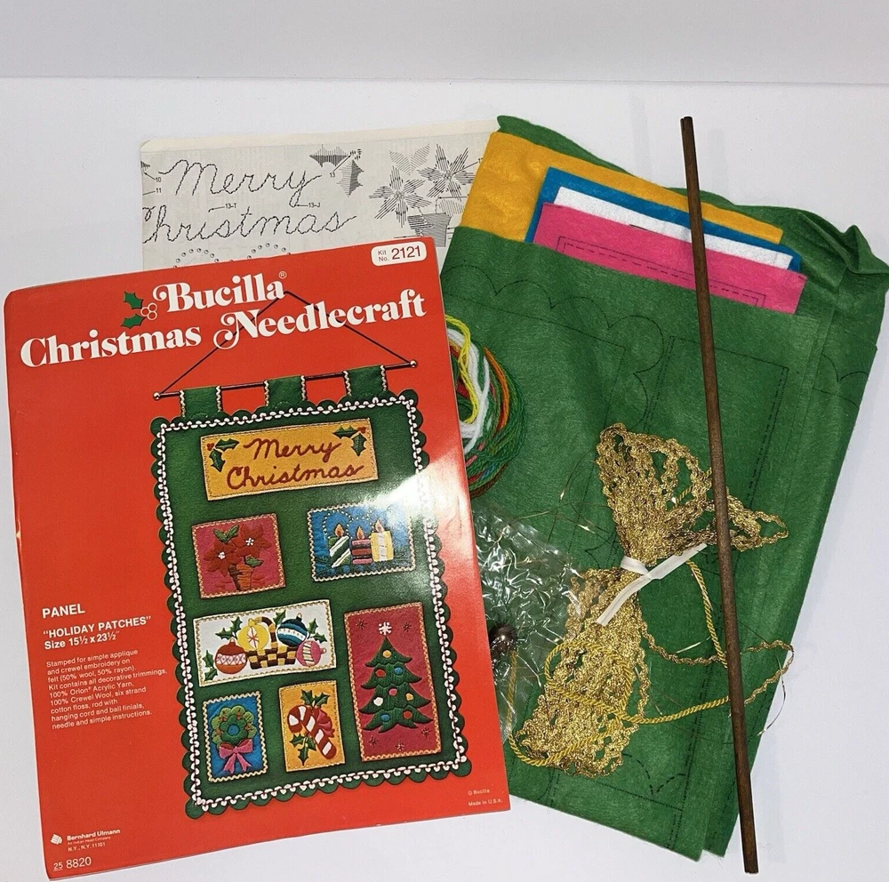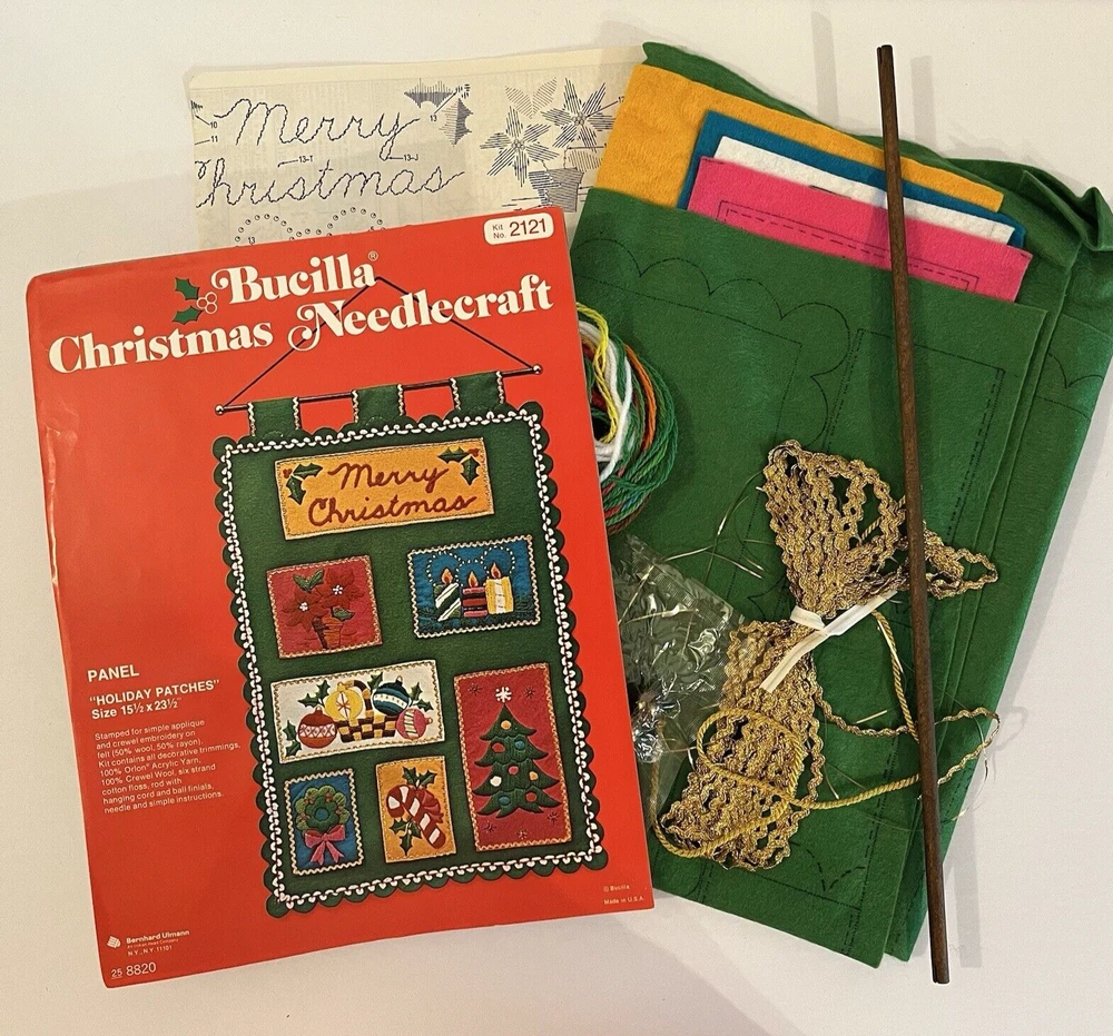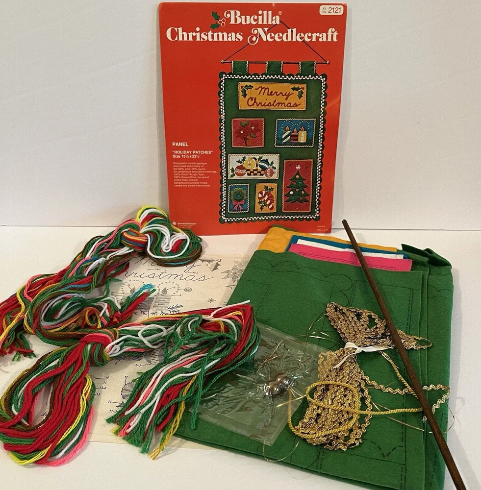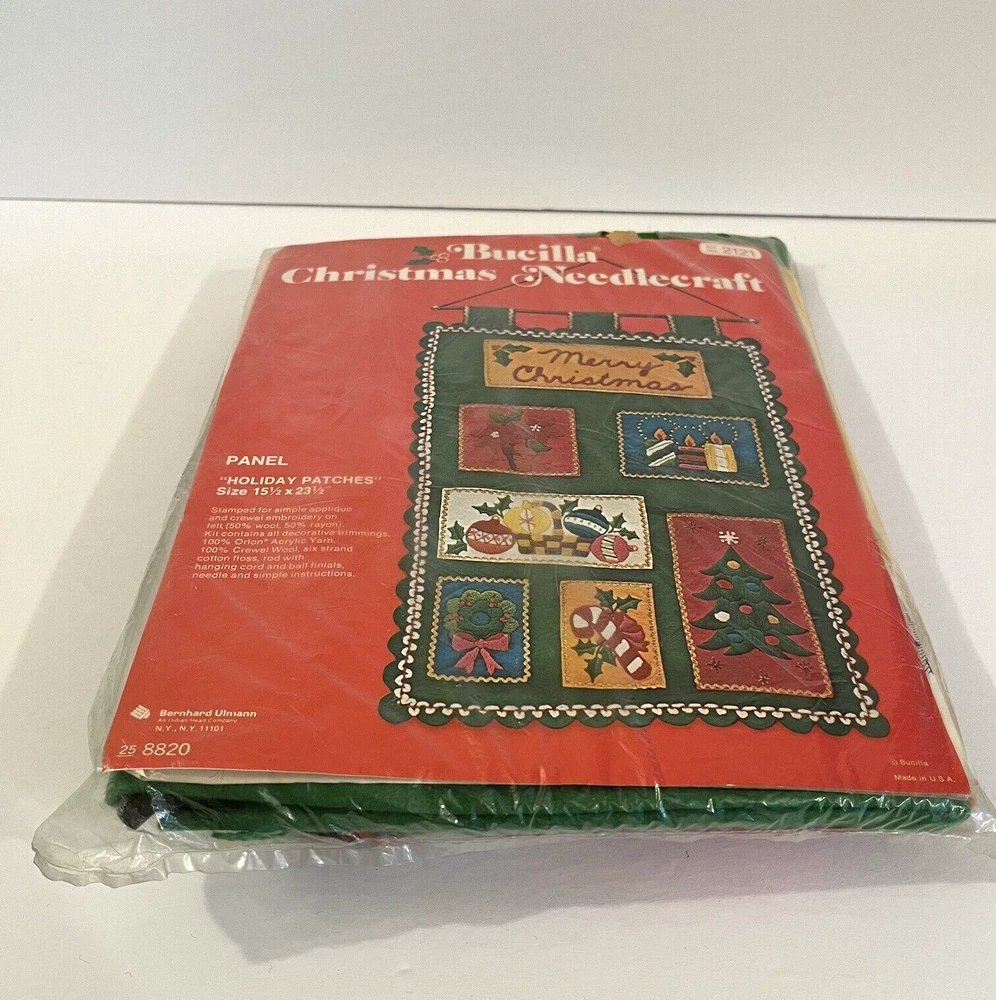 Vintage Bucilla Christmas Needlecraft Kit "Holiday Patches," #2121. Holiday banner/panel/wall hanging kit from the 1970s. Banner measures 15.5" x 23.5". Open package. Complete. Contents are undamaged. Some storage wear on package itself.