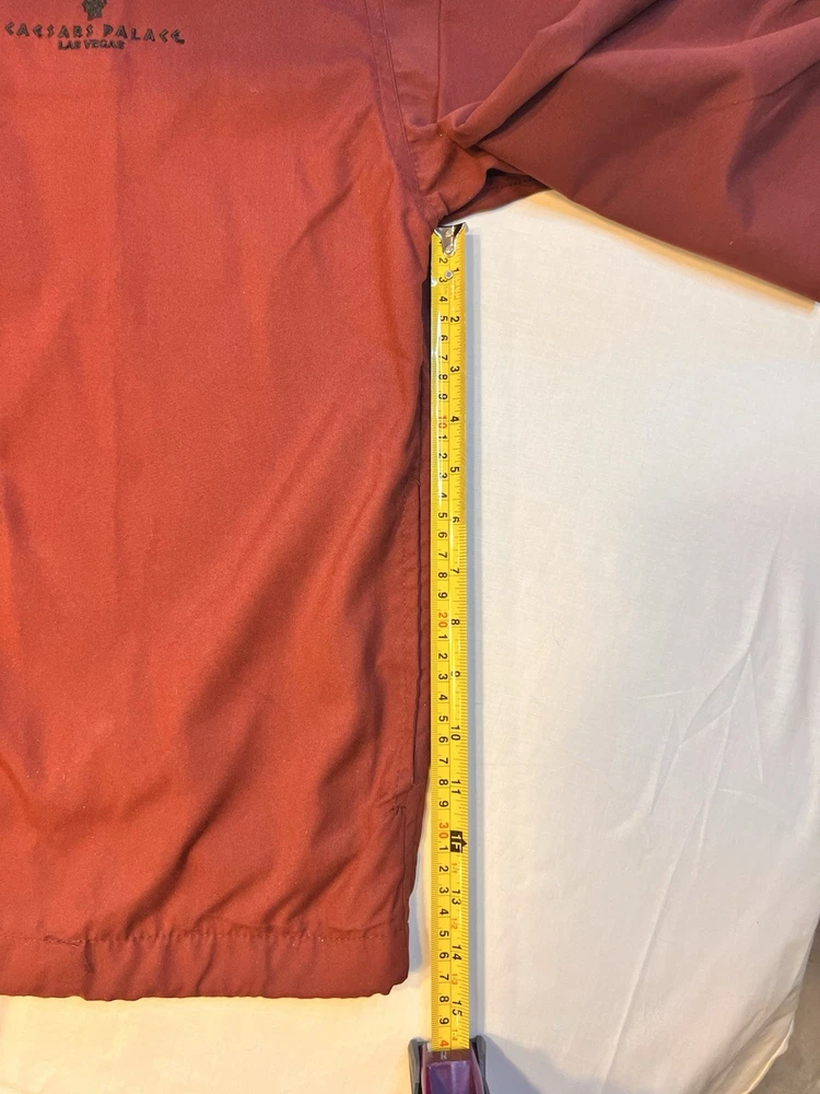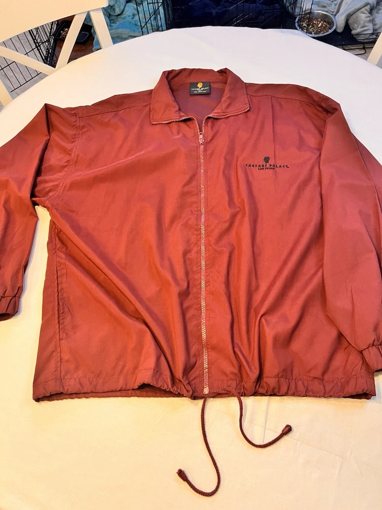 This vintage Caesars Palace jacket in size XL is a maroon windbreaker featuring a zip front closure and lightweight polyester material. Perfect for a Las Vegas casino theme, this jacket also includes pockets for added functionality. The retro design captures the essence of 90s Vegas style, making it a unique and stylish addition to any man's wardrobe. CONDITION: Pre-owned - Great Clean Condition Please look at all photos as they are part of the Description (make sure you want it). The photos are of the actual item you are purchasing. No Refunds, No Guarantee, Items are sold "AS IS" and No Returns are accepted unless otherwise listed with condition. If it’s not in the photo’s It’s not included, Only have what’s in the photo’s. This does not include hangers, stands, tiered trays, or any items used to display products. I attempt to take quality photo's of the "actual Item, Please be aware the lighting, monitor settings & other factors can affect colors. All measurements are approximate. Please Ask any Questions before you purchase!!! Please check out my other listings - New items are listed daily! Add me to your favorite Sellers list for quick access to new listings!! Quick Shipping - items are shipped same day as payment, latest day after Thank you