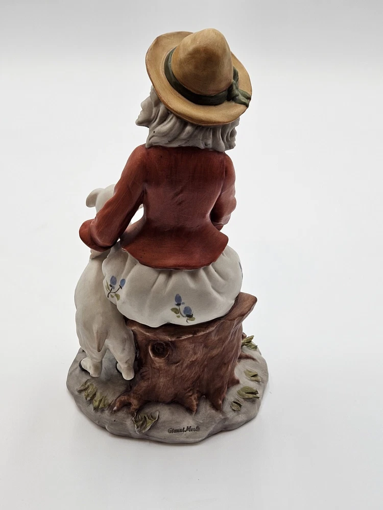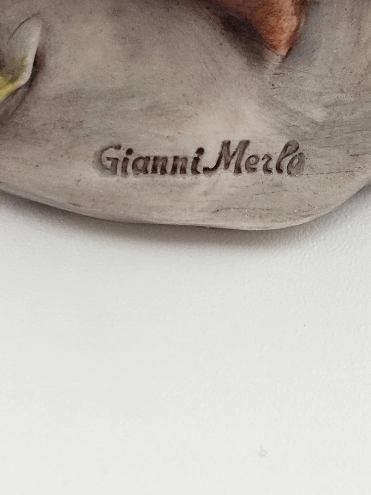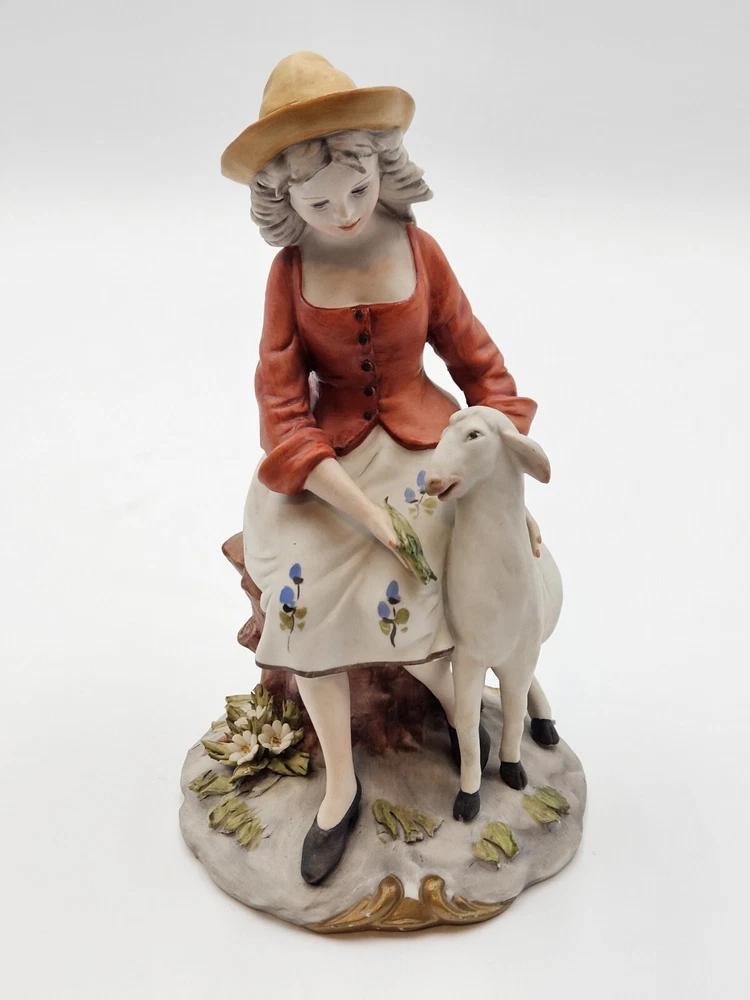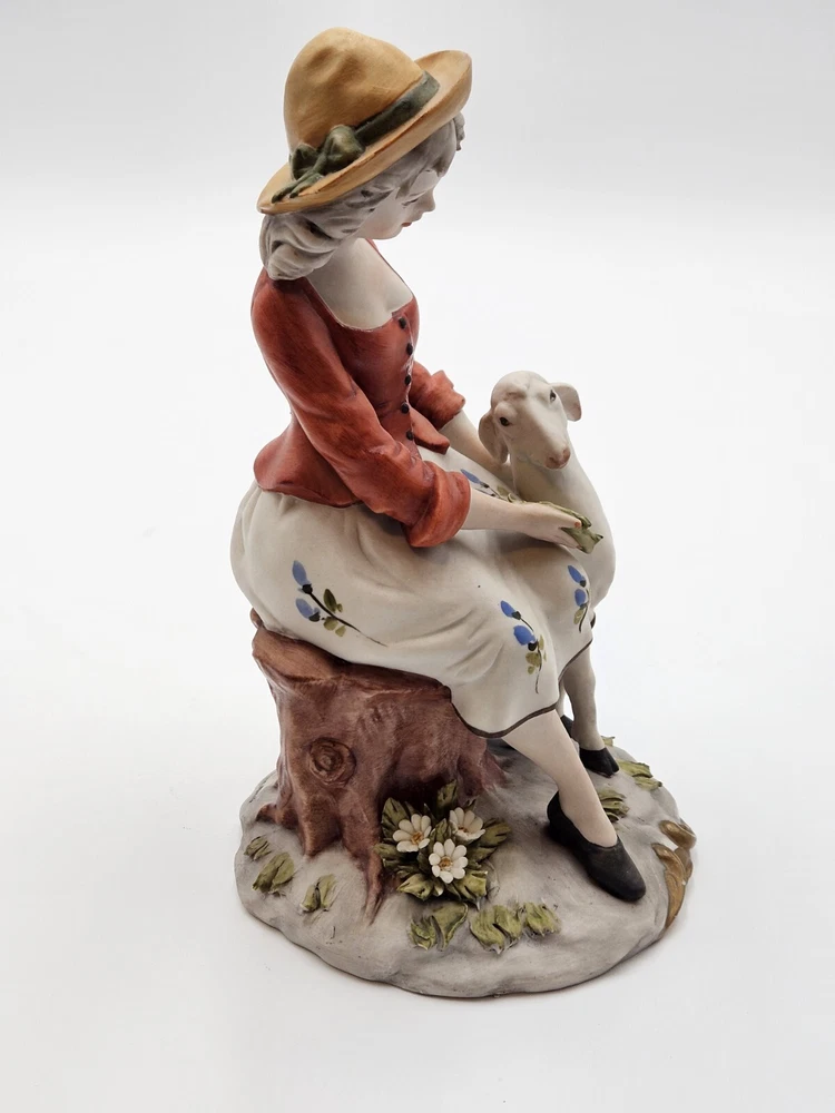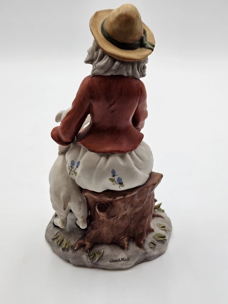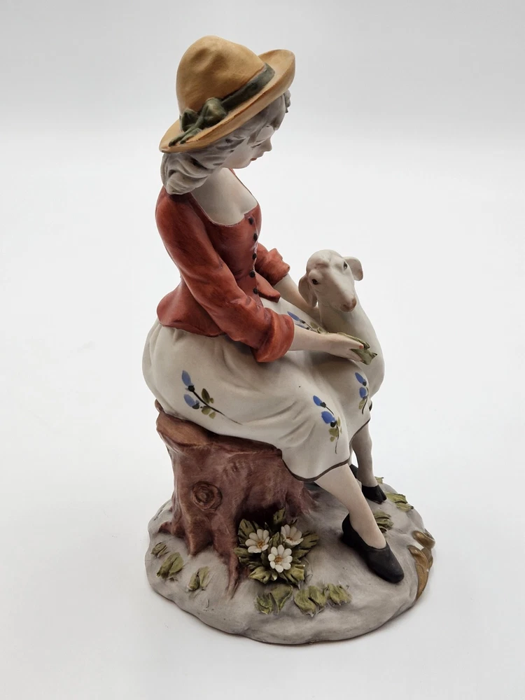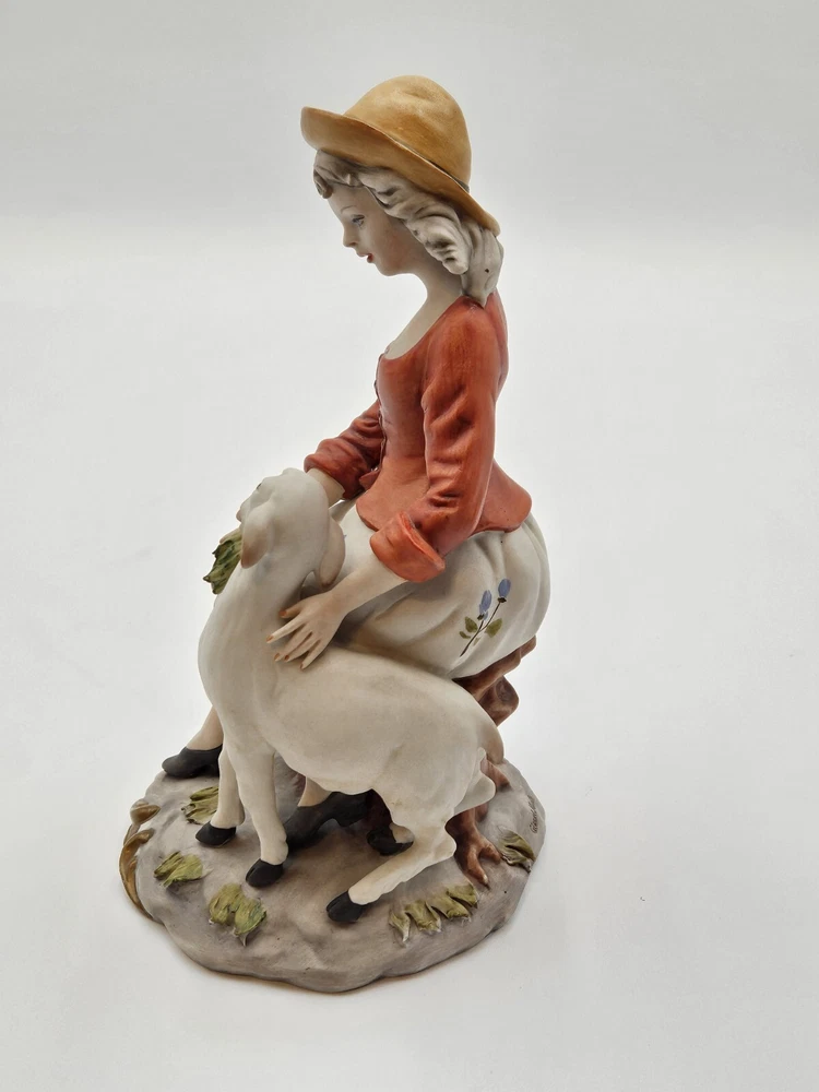 This beautiful figurine depicts a woman holding a lamb, with intricate details and vibrant colors that make it a great addition to any room. The piece is signed by the artist, Gianni Merlo, adding to its value and uniqueness. Crafted from porcelain and measuring 7.75 inches in length ,4.5 in wide this original Capidomonte figurine is a medium-sized piece that can be displayed in various settings and occasions. It features a lovely hat with flowers, adding to the charm of the piece. Whether you're a collector or just looking for a special gift, this figurine is sure to impress.
