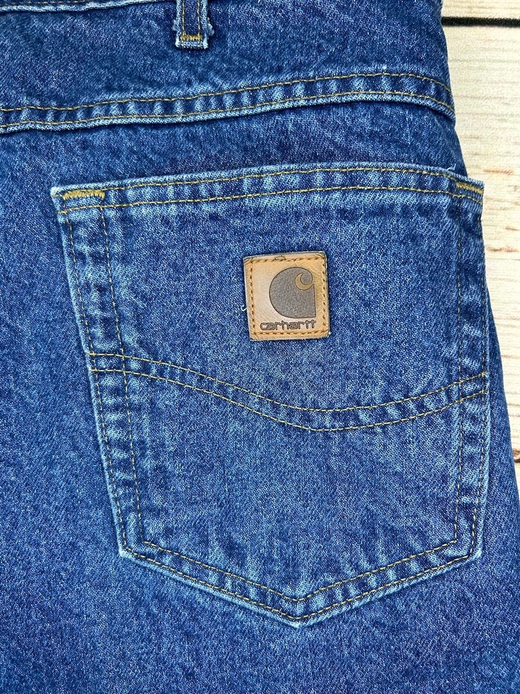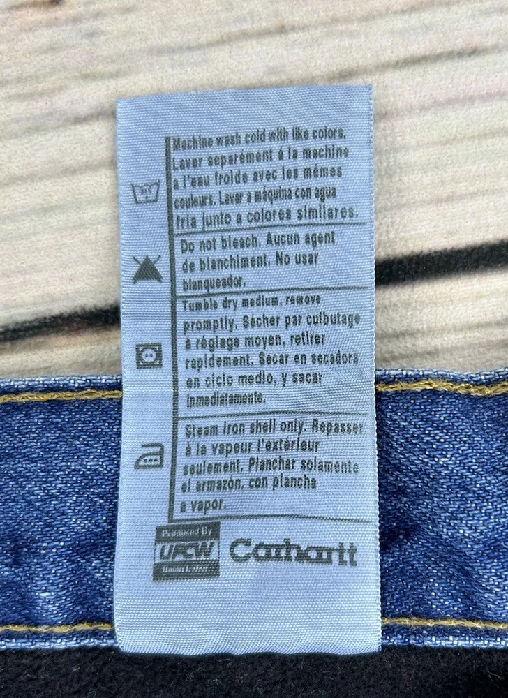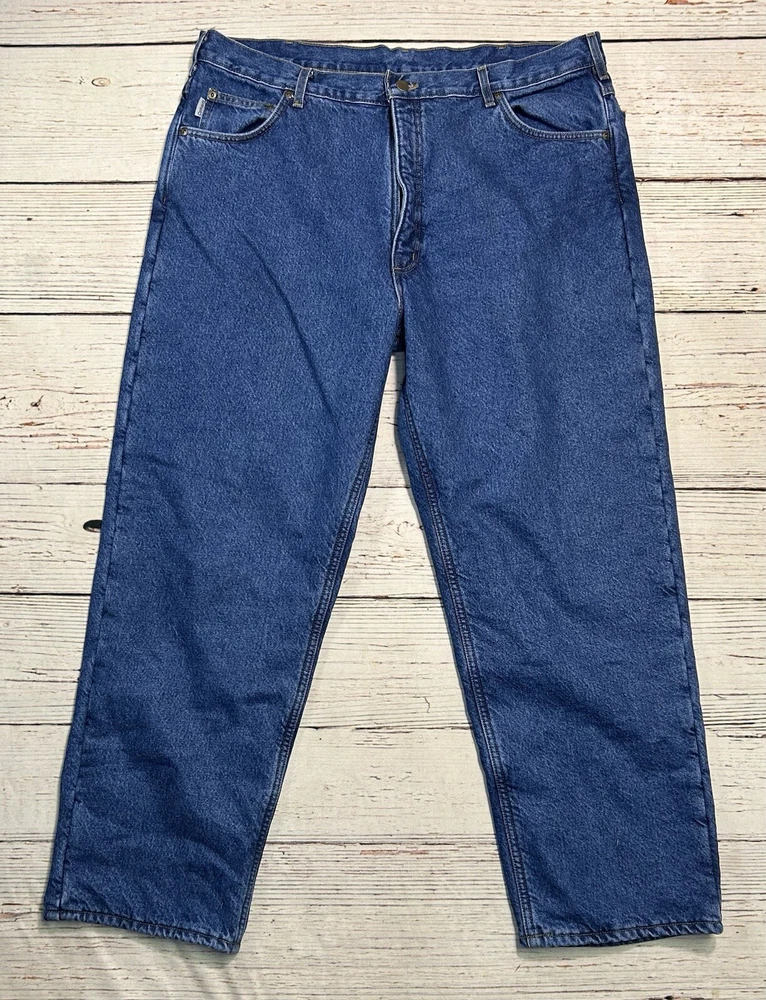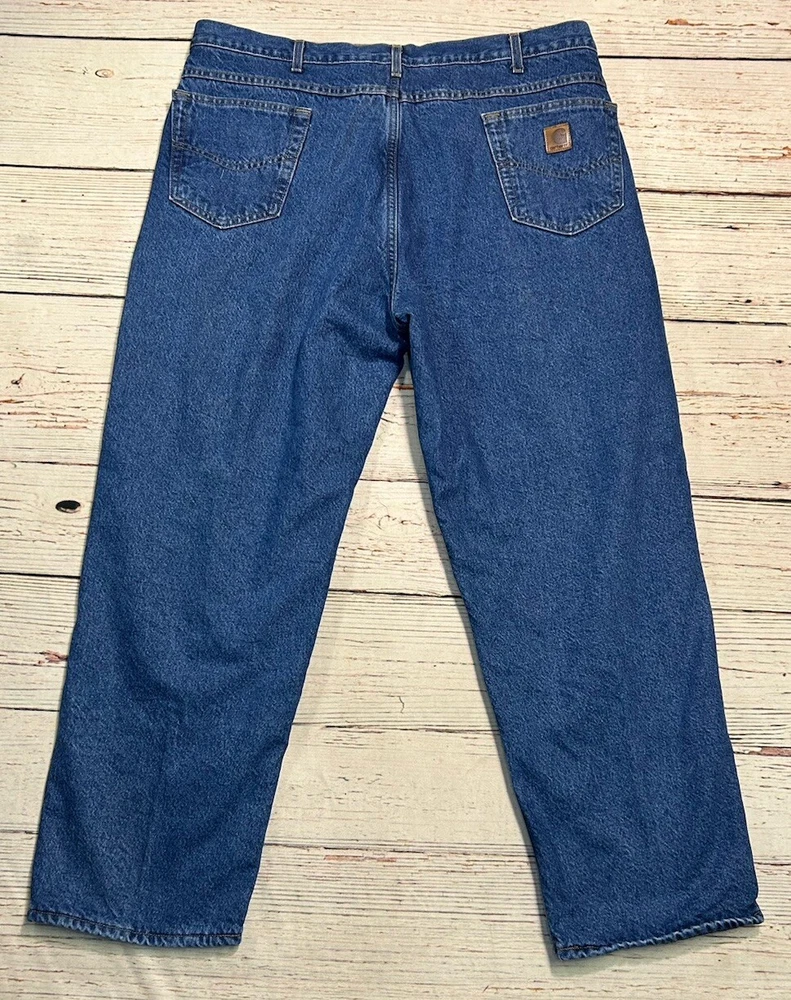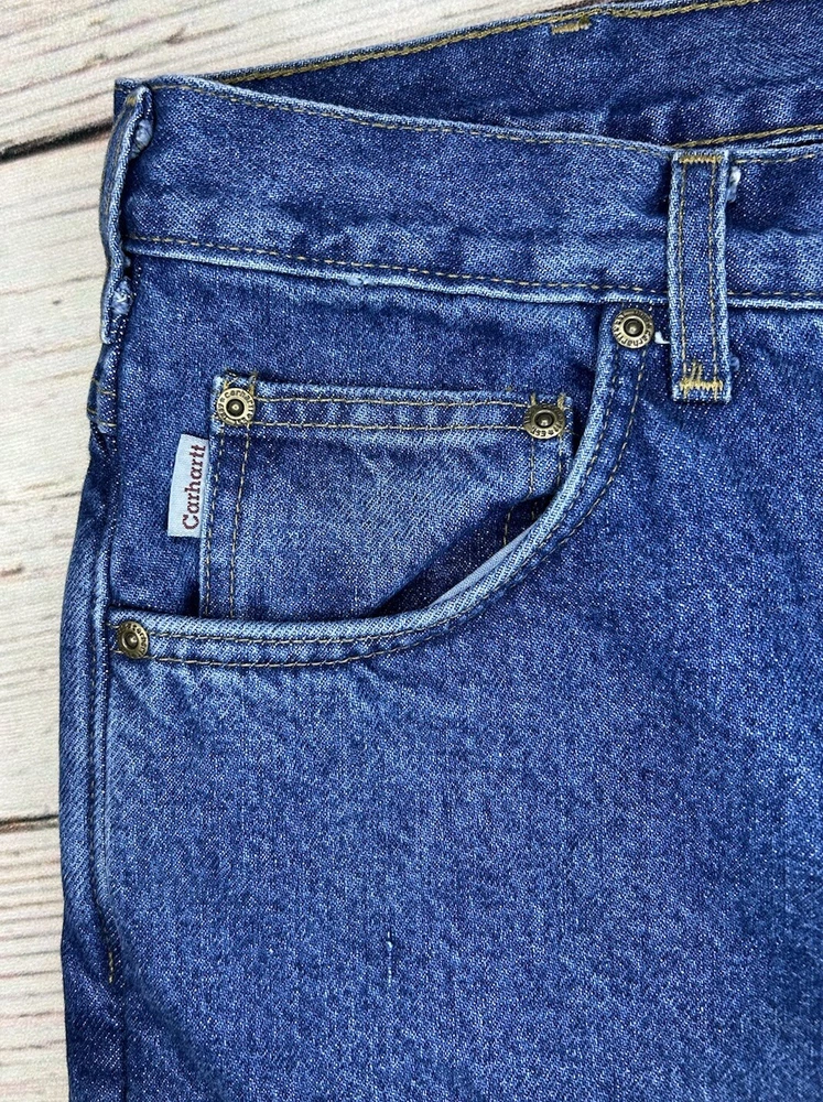 This pair of Carhartt jeans is a vintage gem for men who appreciate high-quality and classic outdoor wear. The jeans are made in the USA, with a denim fabric type and a medium wash that gives them a unique and timeless look. They feature a 5-pocket design with a zip and button closure, and a high rise of greater than 12 inches for added comfort. The jeans are lined with fleece and have a breathable fabric wash, making them perfect for winter, fall, and spring seasons. They are easy to care for and machine washable, ensuring that they will last for years to come. The Carhartt brand is known for its durable and functional clothing, making these jeans ideal for outdoor activities, hiking, or even workwear. See pictures for condition and measurements for size.