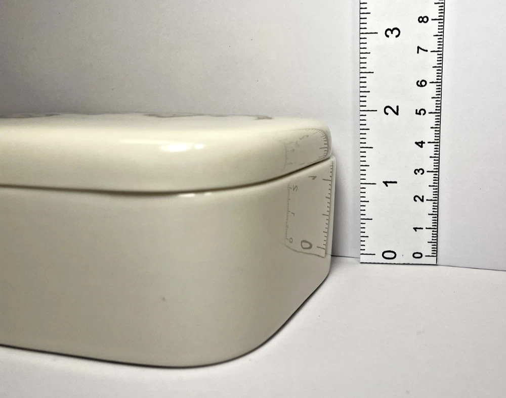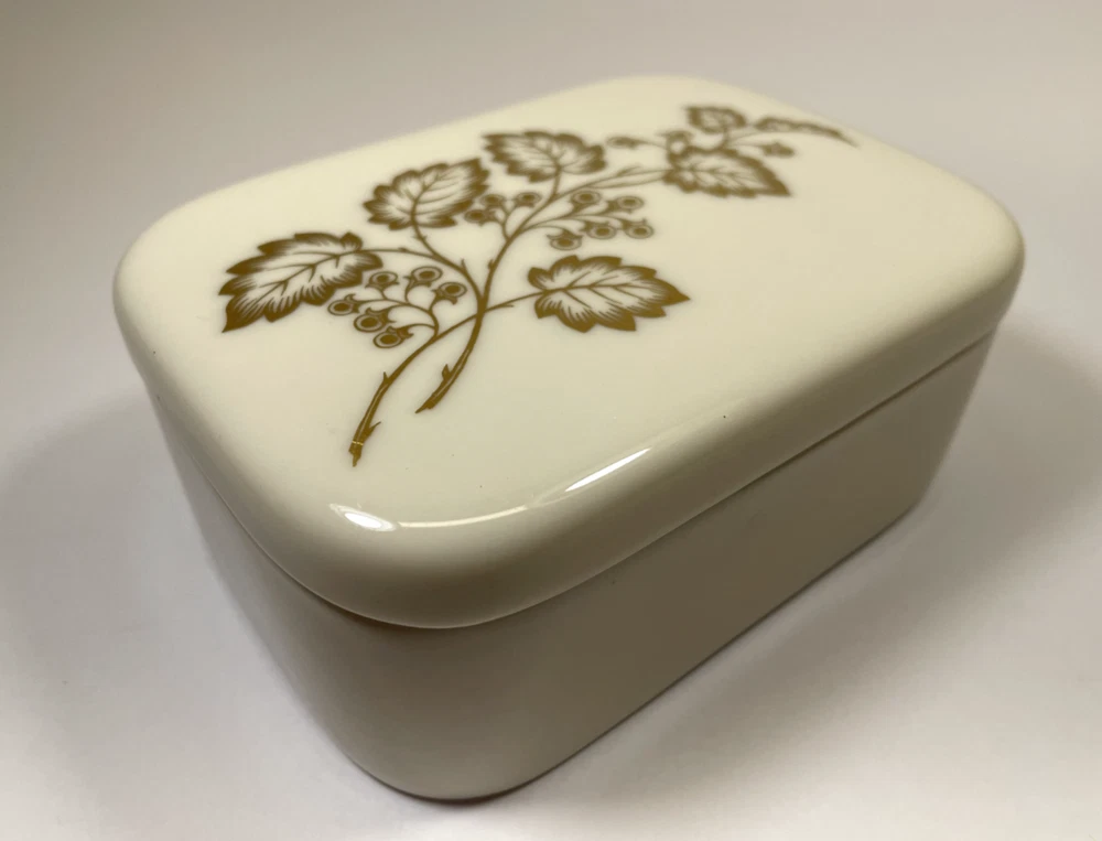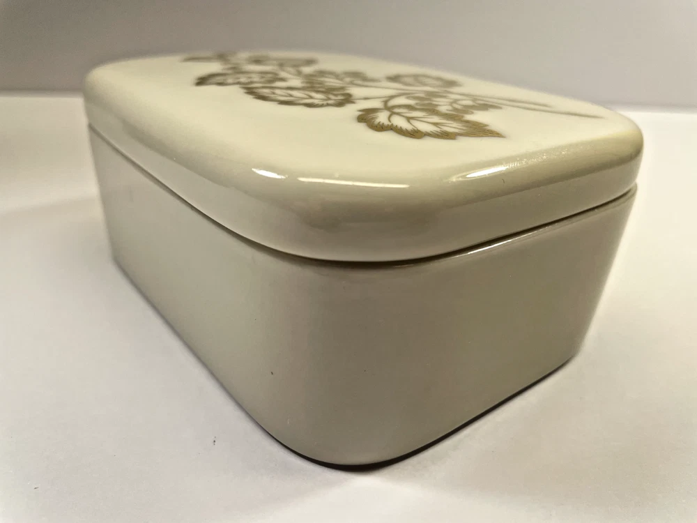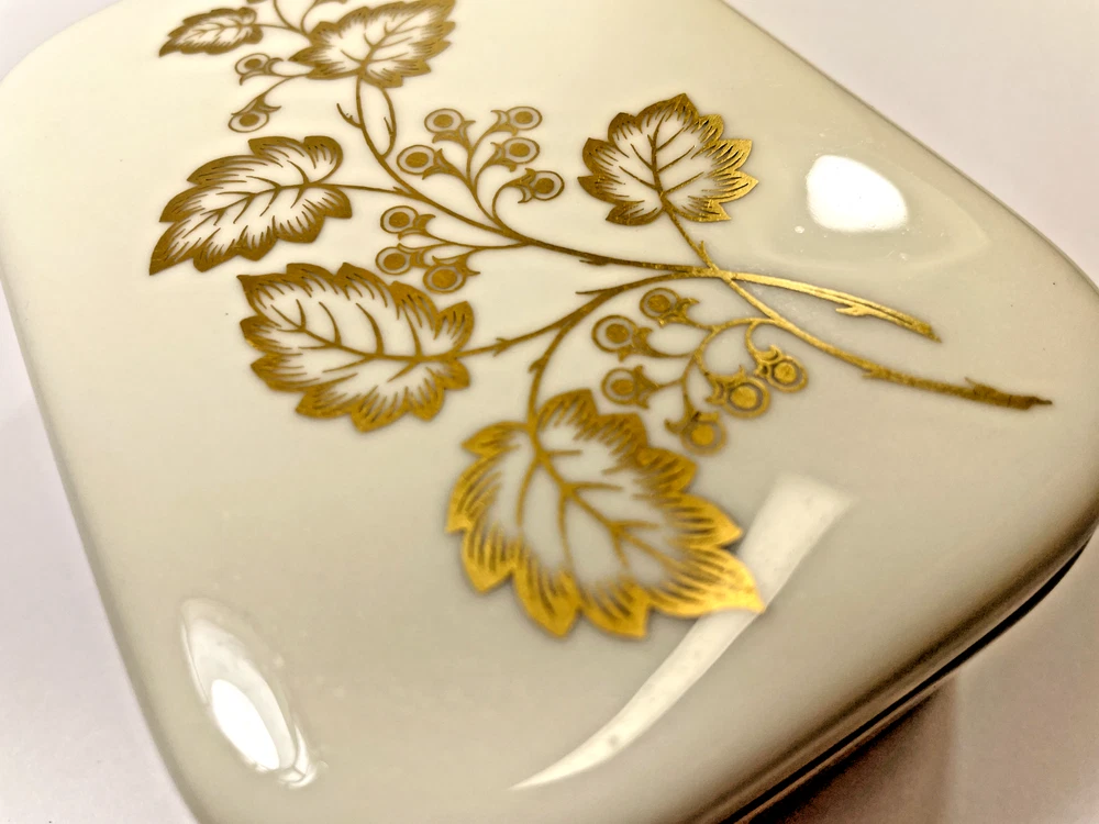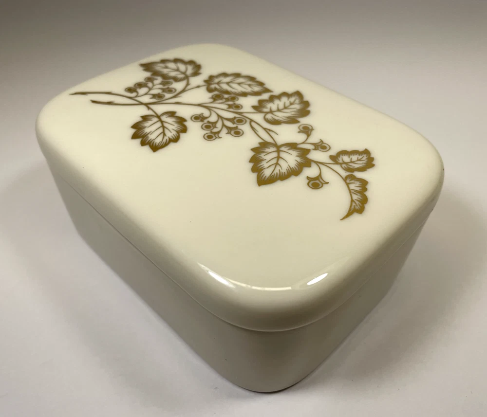 This vintage Celeste Lenox cigarette box doubles as a trinket, sugar, or jewelry box, featuring a rectangular shape with a removable lid adorned with intricate gold leaves and buds on a cream-colored porcelain/ceramic material. The box, part of the Keepsake Boxes collection, exudes a mid-20th-century charm with its glossy finish and gold floral theme. Made in the United States, this original piece from the 1940s-1970s era is a unique and elegant addition to any room, perfect for storing small items or as a decorative collectible.