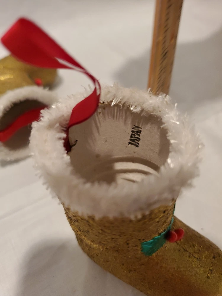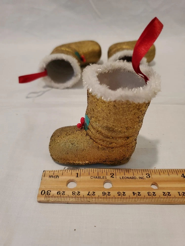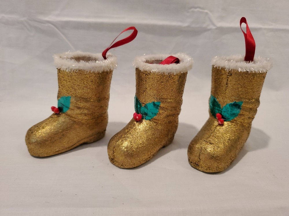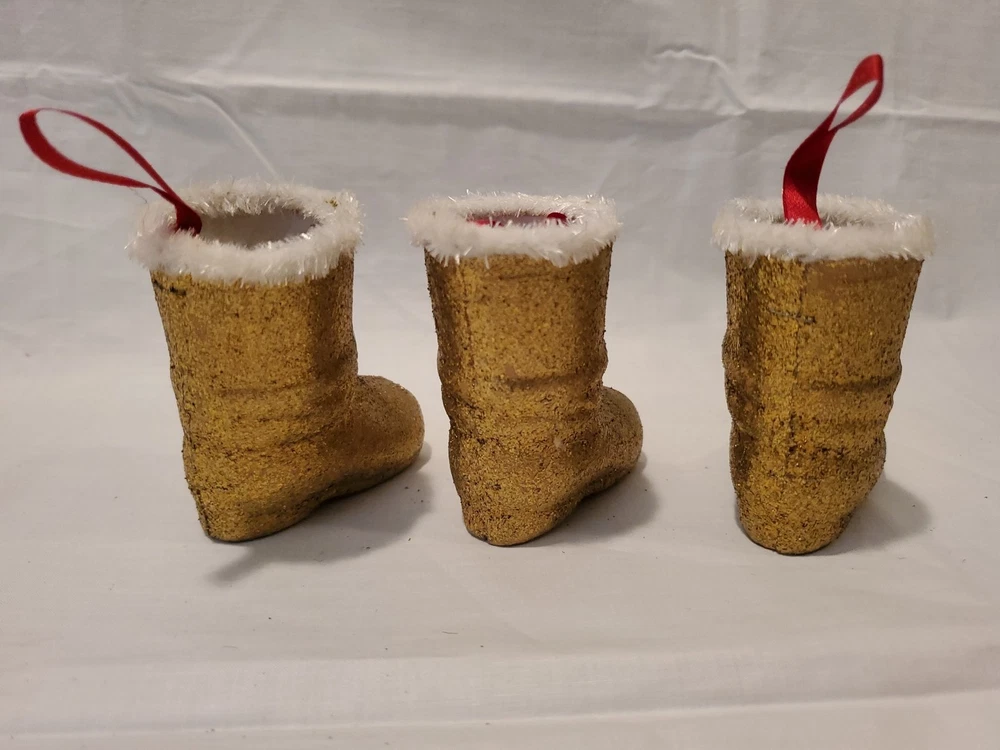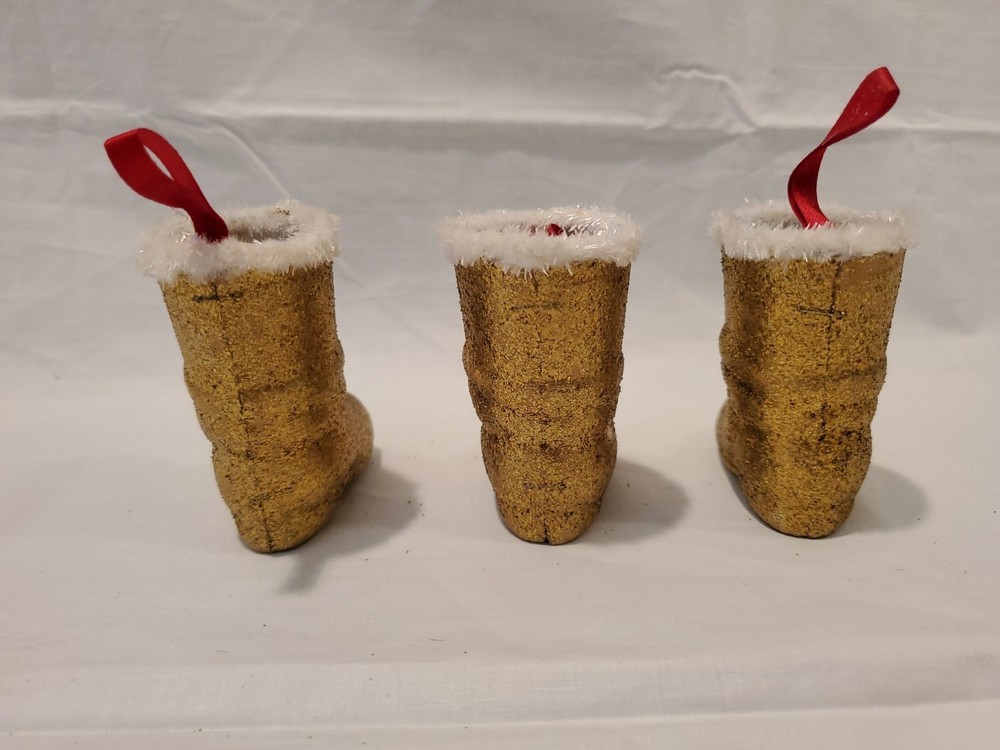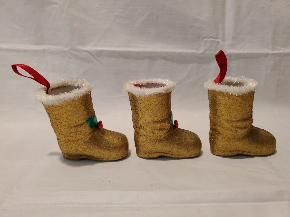 You are looking at a Set of 3 Vintage Chenille trimmed Santa Claus Cardboard Boots. They were made in Japan. They are in nice condition. Be sure to look at all the photos as they help show their condition and description and measurements. We think they are a Great Find!
