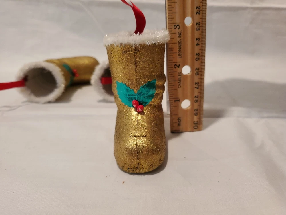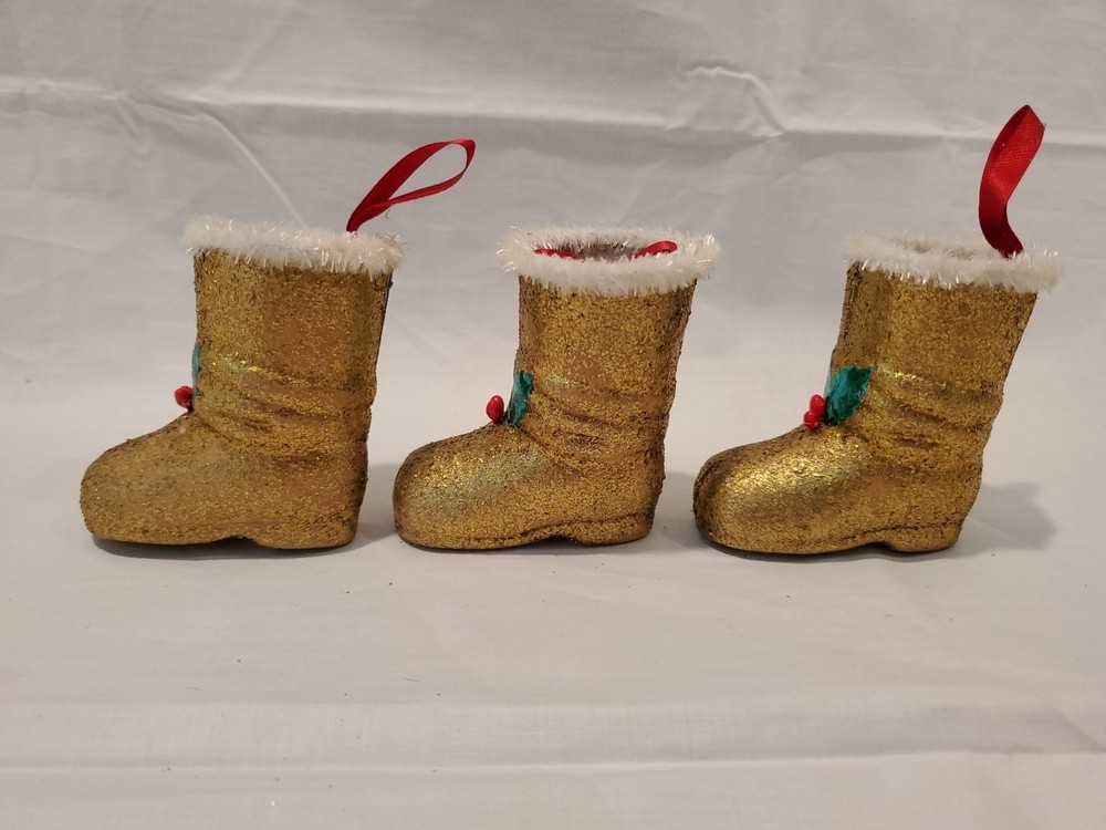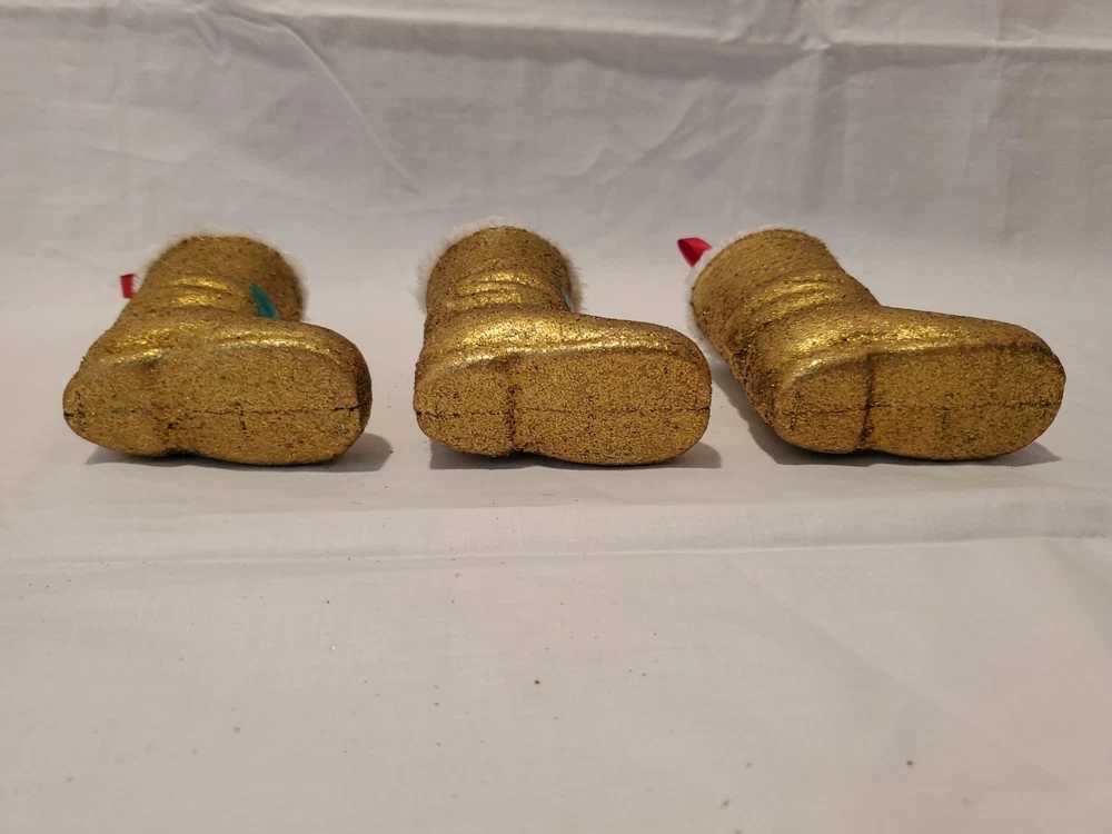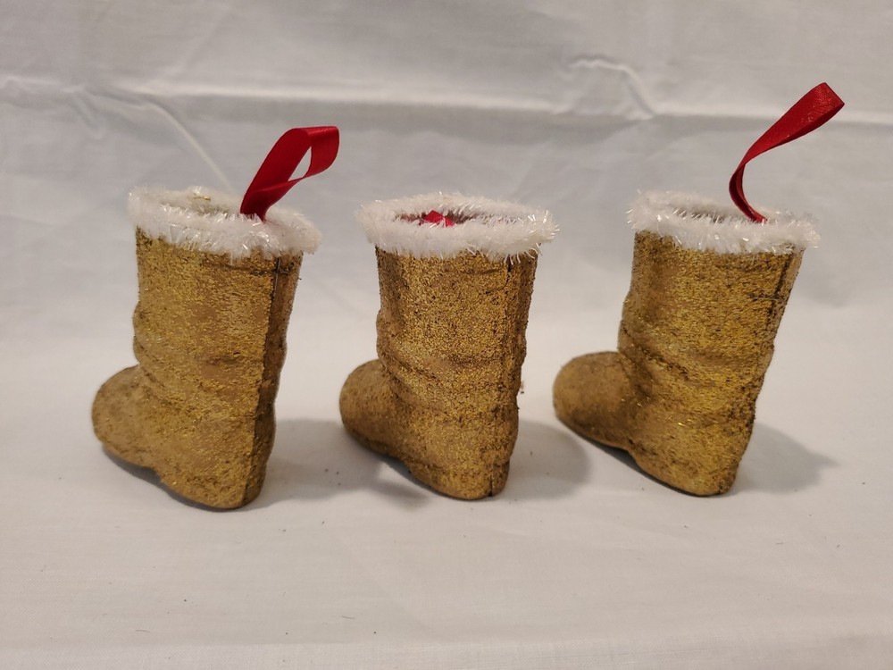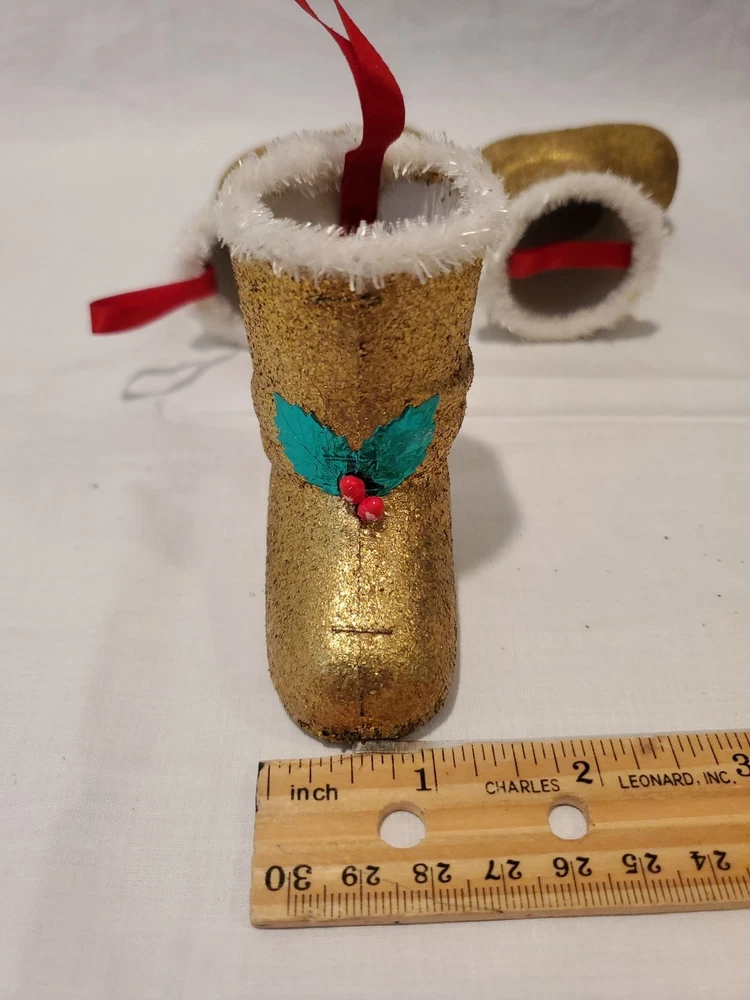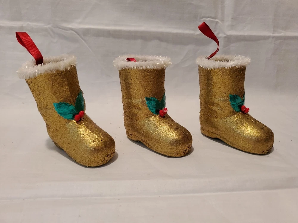 You are looking at a Set of 3 Vintage Chenille trimmed Santa Claus Cardboard Boots. They were made in Japan. They are in nice condition. Be sure to look at all the photos as they help show their condition and description and measurements. We think they are a Great Find!