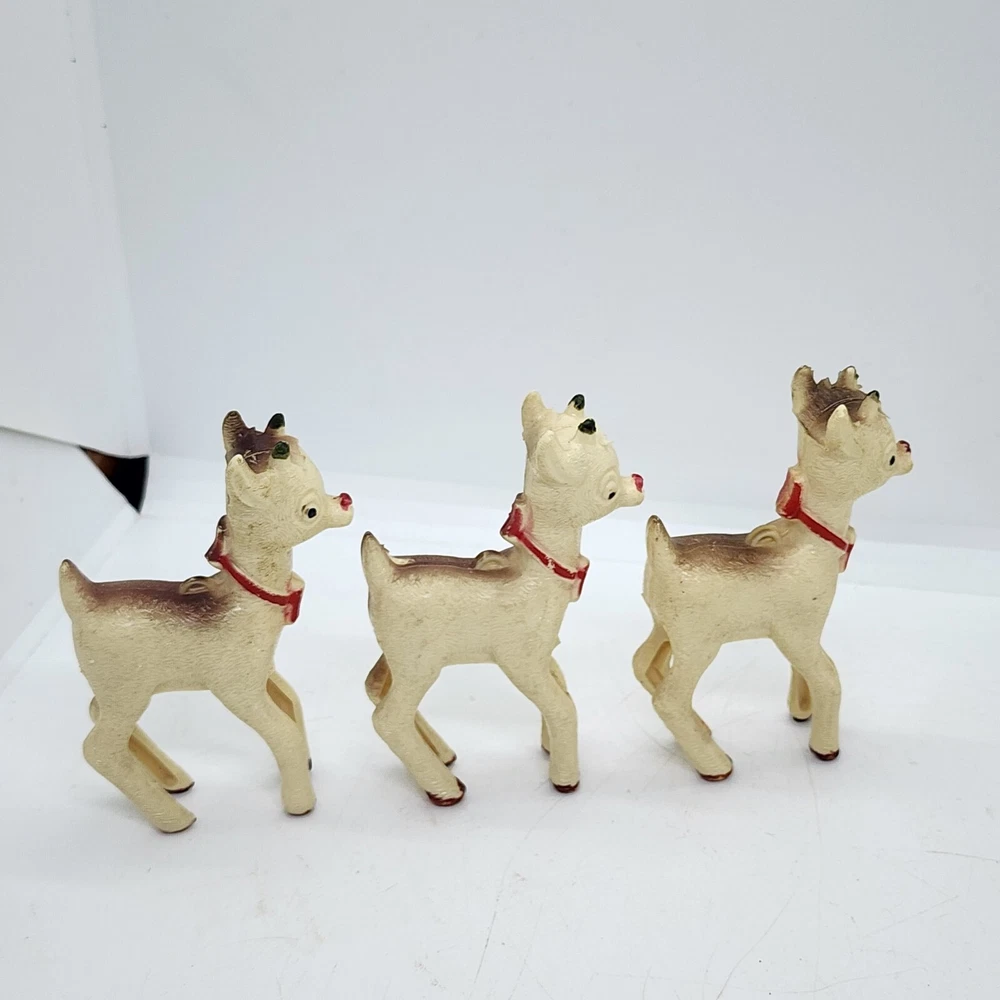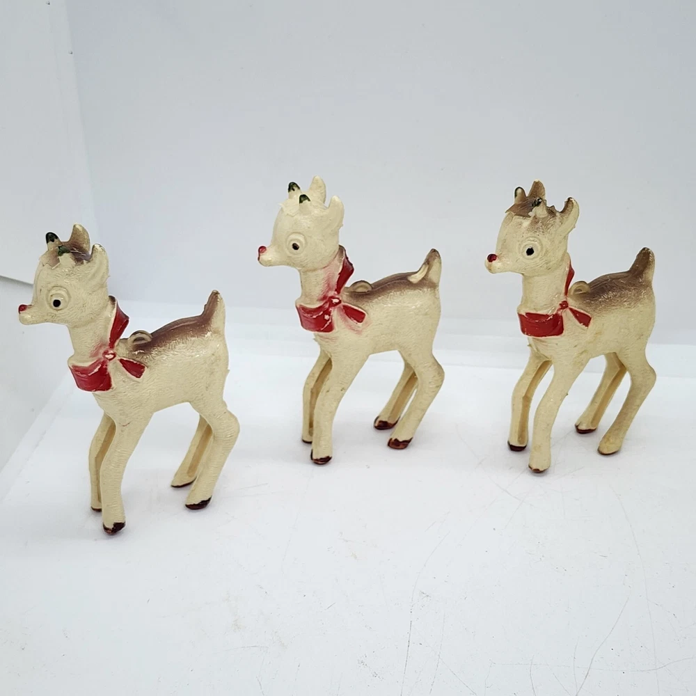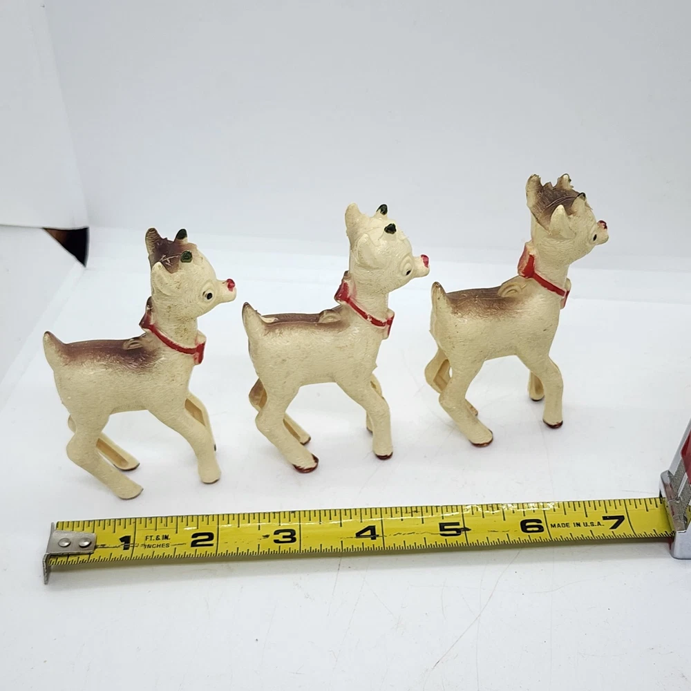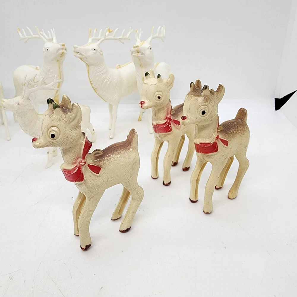 Vtg Christmas 8pcs Celluloid Hard Plastic Reindeer RUDOLPH Red Nose 1950s MCM