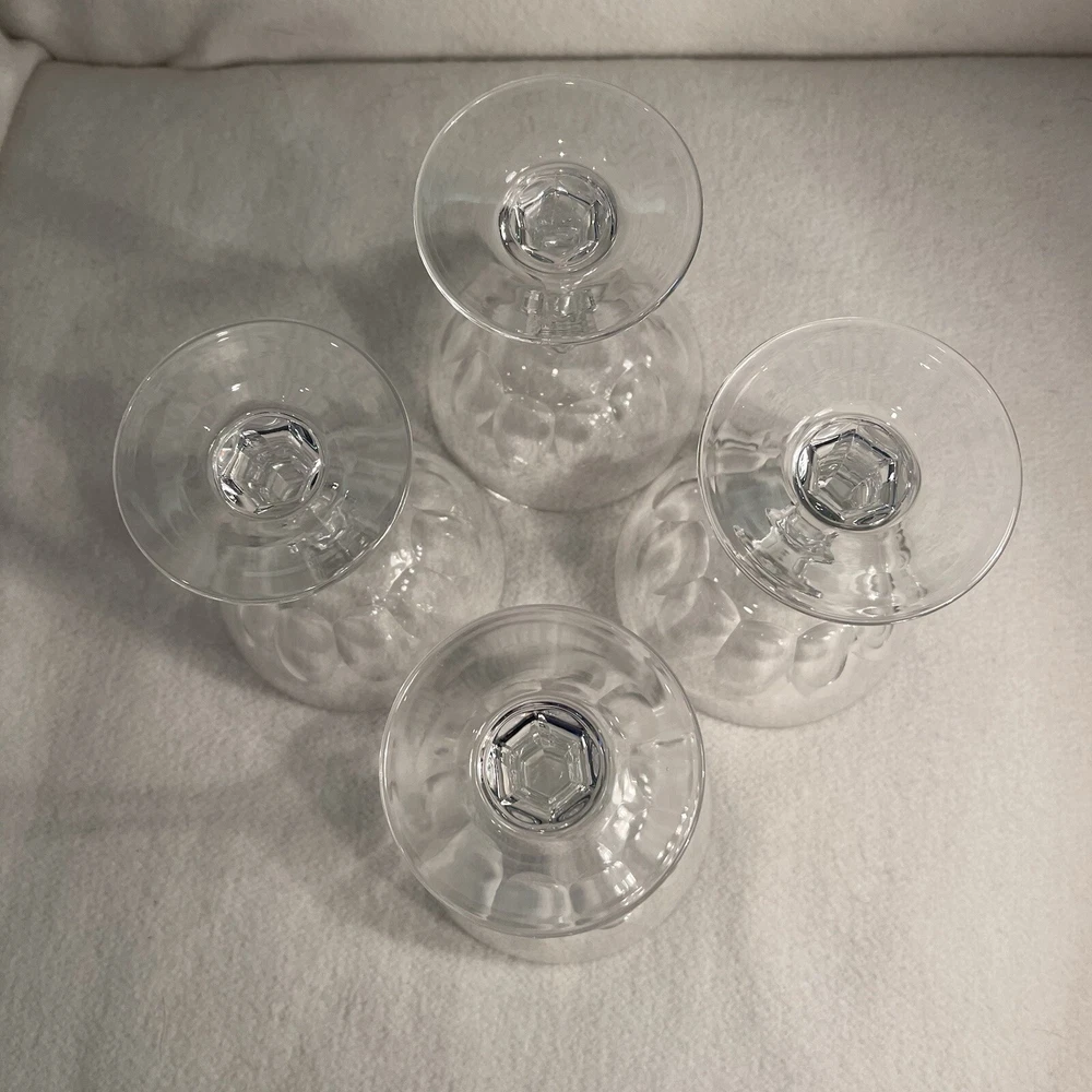 This set includes four vintage clear crystal champagne or sherbet glasses with a large thumbprint pattern. The round glasses are 4 inches in diameter and 5.5 inches in height, weighing a total of 1.13 lbs. They feature a mid-century modern style and are decorative in design, suitable for all occasions. The brand is Crystal Clear, and they are original pieces made of crystal, adding a touch of elegance to any tabletop setting. Excellent condition. No chips or cracks.