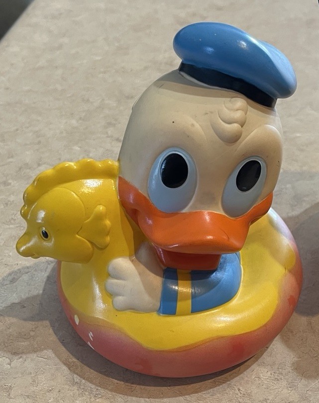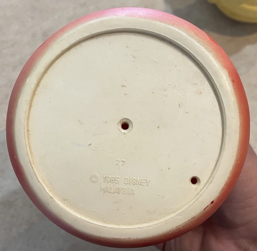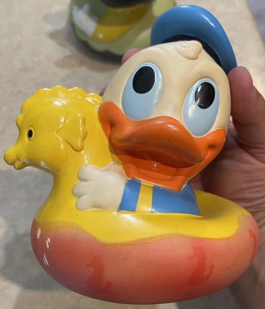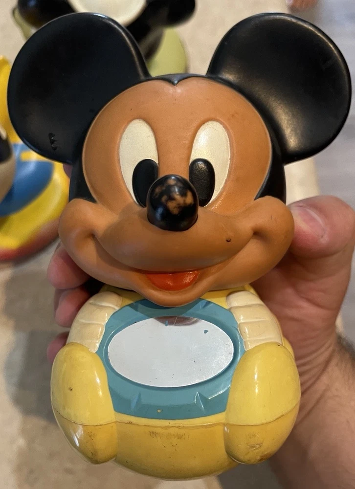 This product is a vintage 1984 Disney 7" Mickey Mouse Roly Poly toy, featuring characters from the Disney franchise. Made in Malaysia, this collectible item includes three bath toys of Mickey Mouse and Donald Duck. Perfect for Disney collectors or fans of classic Disney characters, this nostalgic set is sure to bring smiles to both children and adults alike. These three toys are in preowned used condition, and show some heavy signs of wear. Please see ALL photos for a better idea on condition, any measurements, or details to the toys.