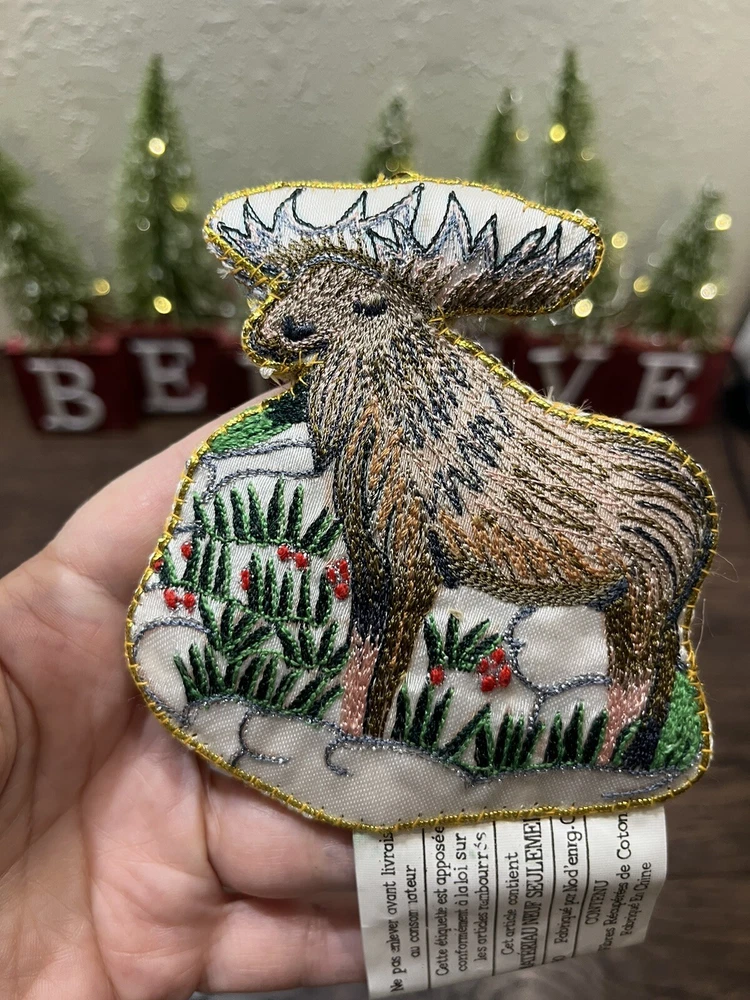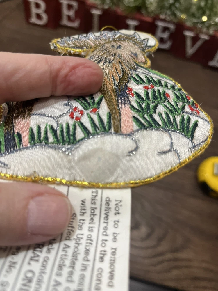 This vintage EATON embroidered reindeer Christmas ornament from 1994 is a must-have for any collector. The intricate details on the boxing-themed ornament make it a unique addition to your collection. The ornament measures 4.25 inches and comes in its original box. The set includes one ornament and is an original, licensed reproduction. The reindeer's shape and the embroidered features make it a perfect addition to your holiday and seasonal ornament collection. This collectible item is a great way to add a touch of vintage charm to your decor. Preowned in good condition other than a few loose strings along the edge and also some light discoloration of the white satin base. Could be from handling, but there’s also a spot where the glue has soaked through the material. Basically in great condition for its age. Please see close-up pictures for details.