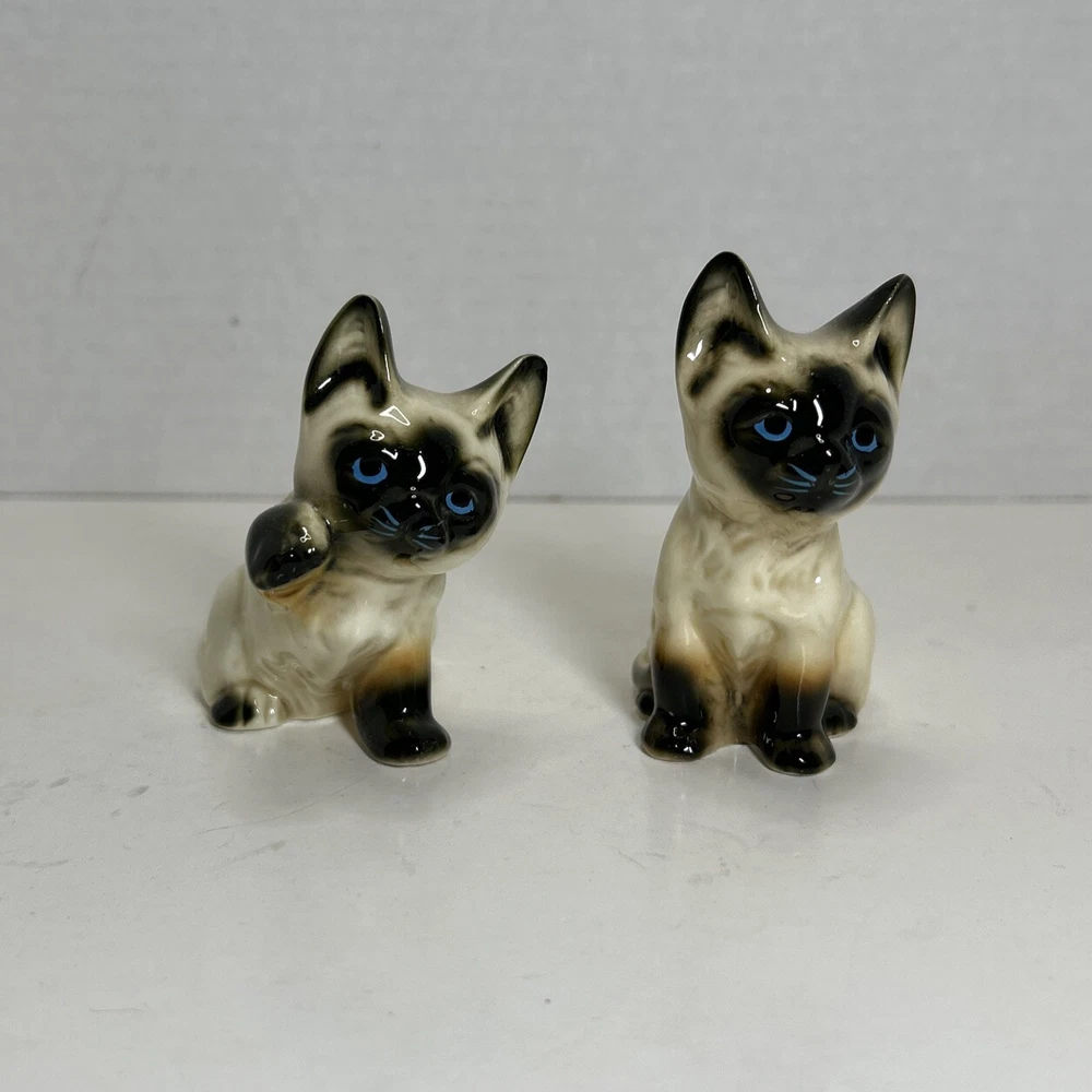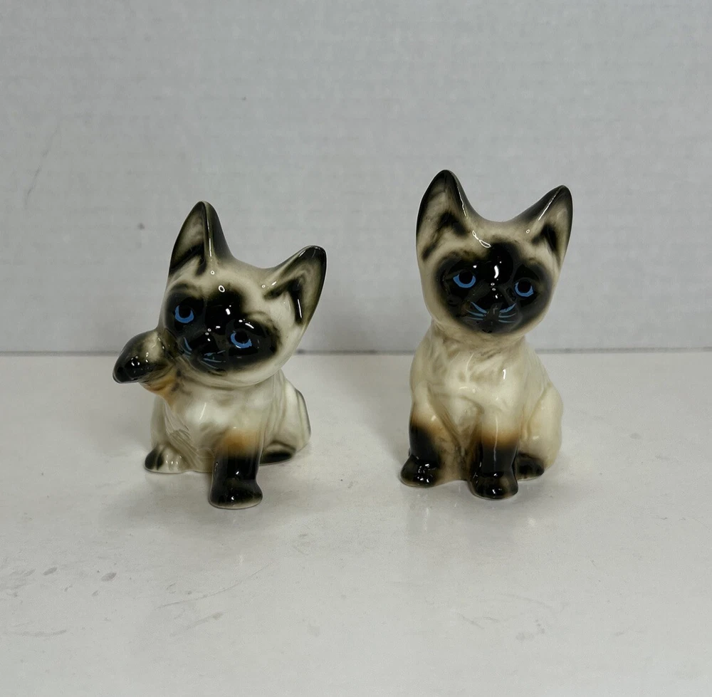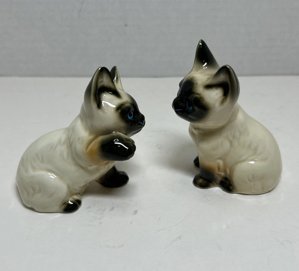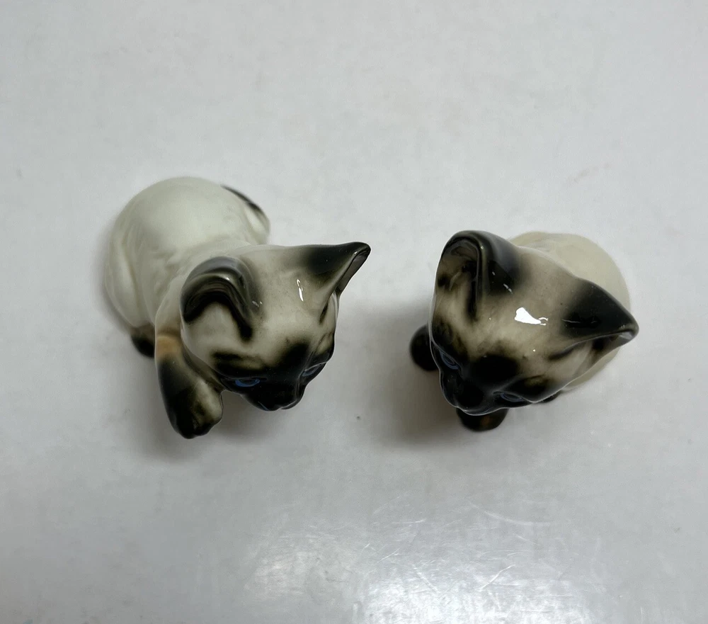 Set of 2 Enesco Siamese blue eyes kittens cats bone chine porcelain. Glossy finish cold painted eyes and blue whiskers Each is about 3 inches tall and about 2 inches in length and about 2 inches wide No chips and no cracks