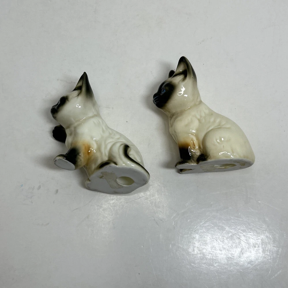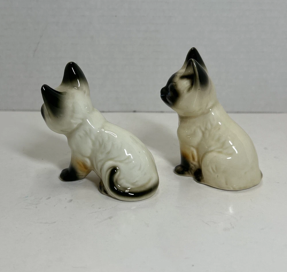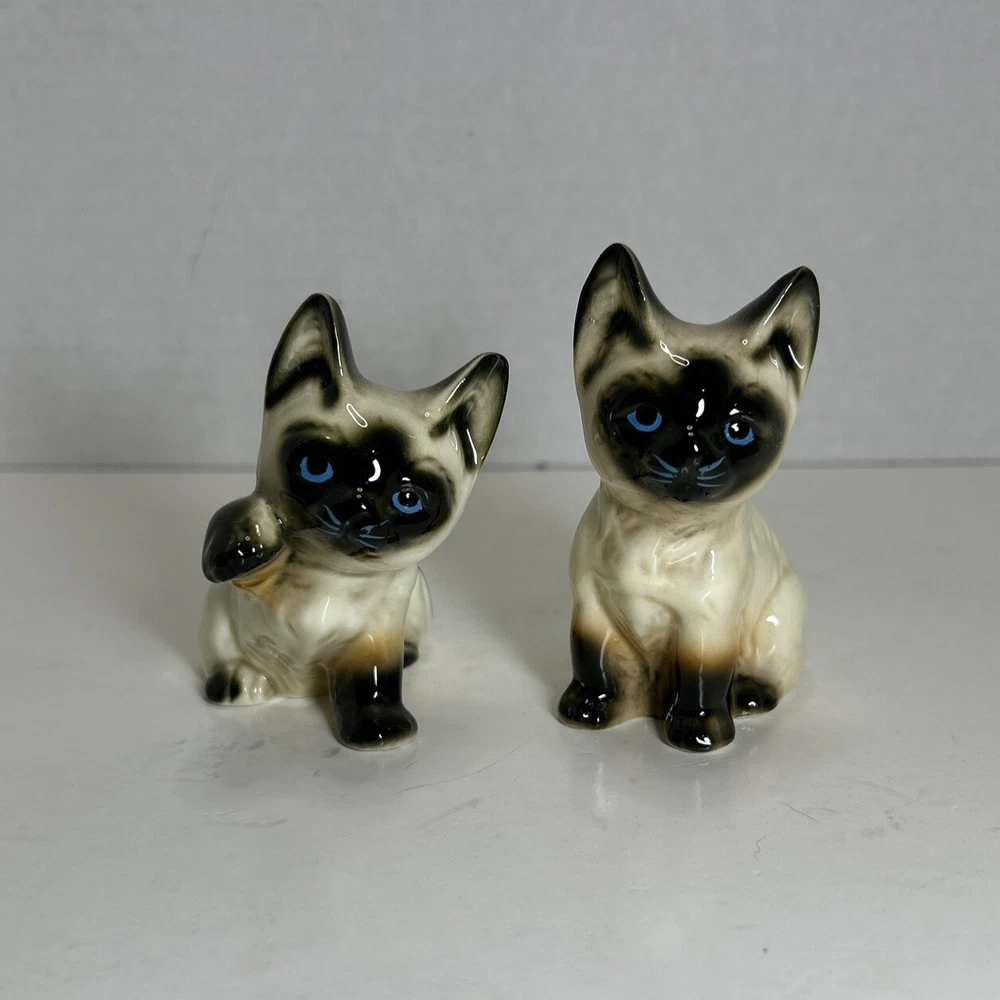 Set of 2 Enesco Siamese blue eyes kittens cats bone chine porcelain. Glossy finish cold painted eyes and blue whiskers Each is about 3 inches tall and about 2 inches in length and about 2 inches wide No chips and no cracks