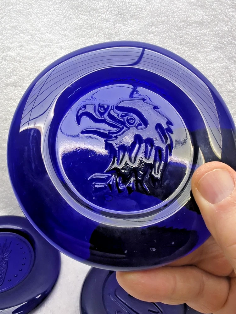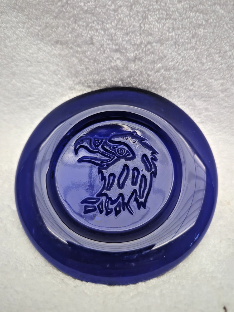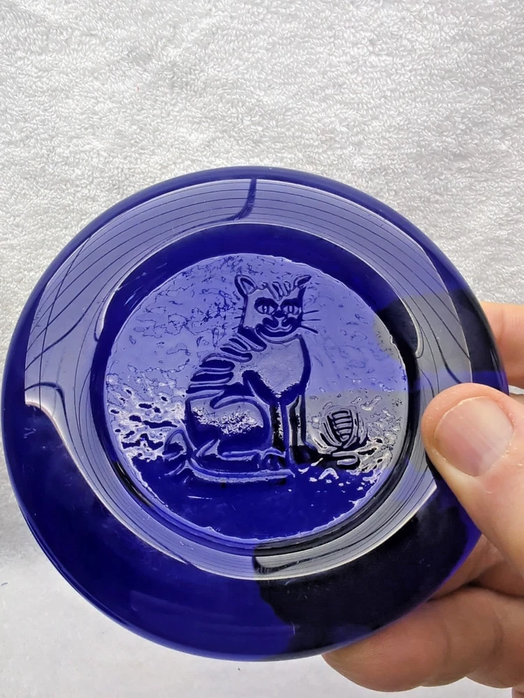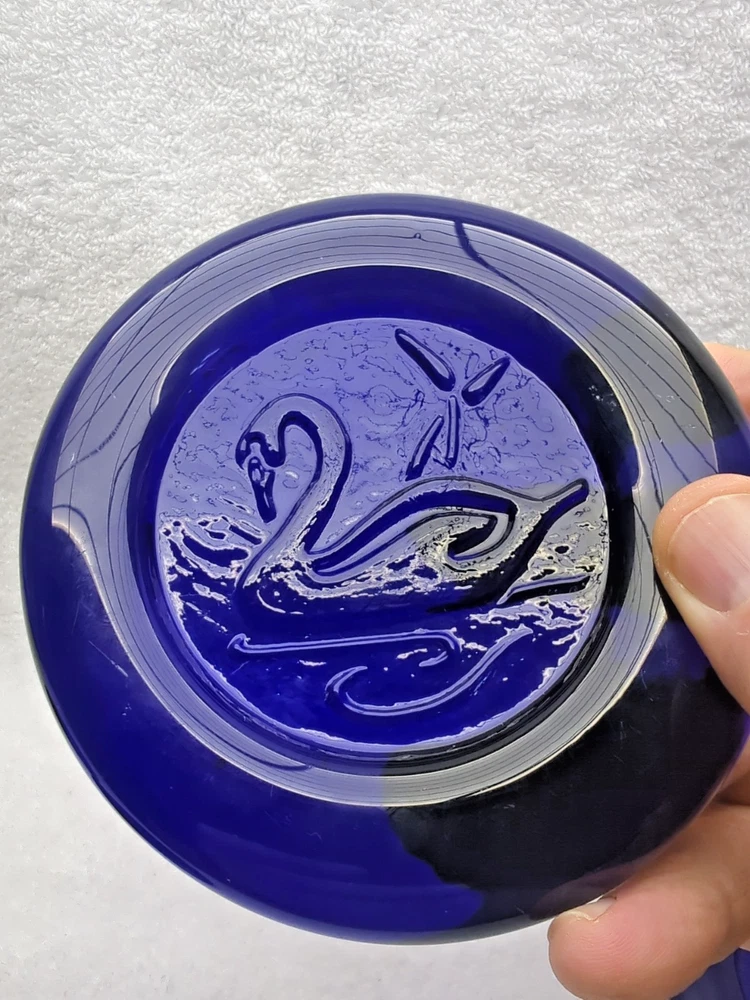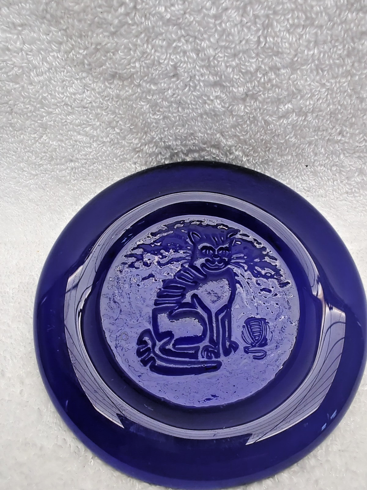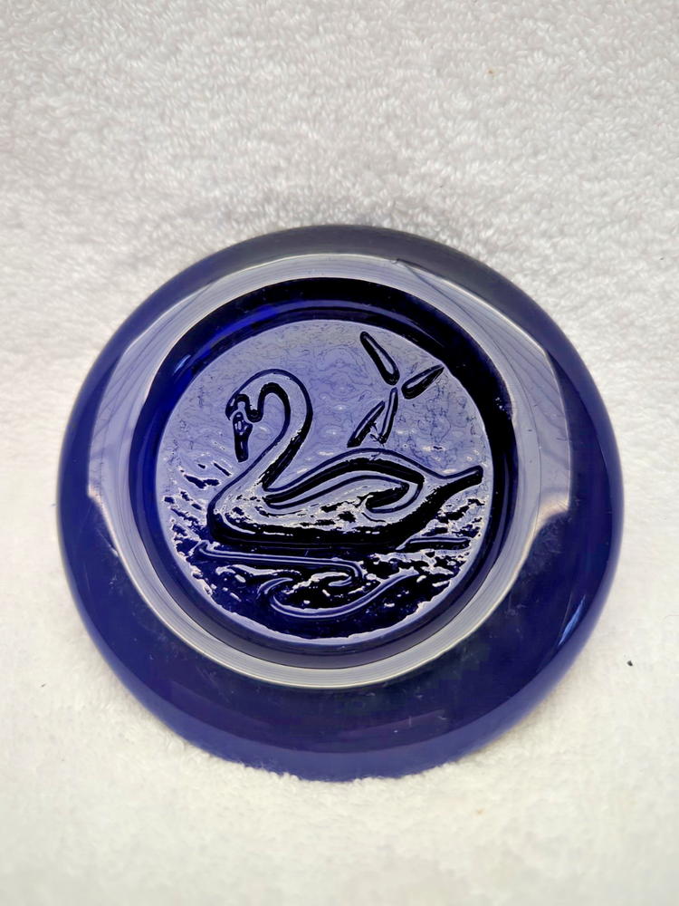 These vintage Erik Hoglund Kosta Boda glass ashtray/ paperweight features a unique cobalt blue color and a round shape with a diameter of 4 inches. Handmade in Sweden during the 1960s, this art glass piece is a part of the animal product line by Kosta Boda, known for its Mid-Century Modern style. These ashtray/ paperweights are decorated with four different designs, showcasing the craftsmanship and originality of Swedish glassmaking tradition. Cat/Swan/Pineapple/Eagle Head.