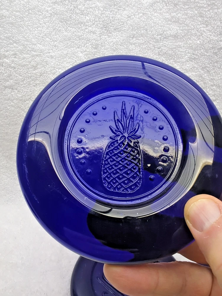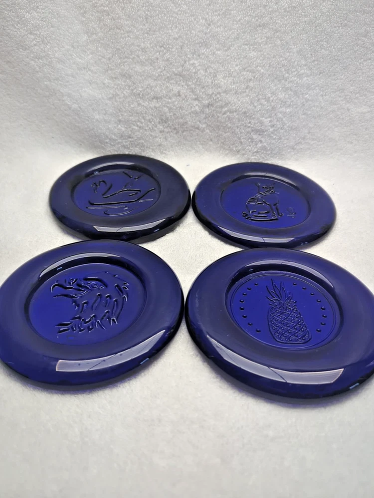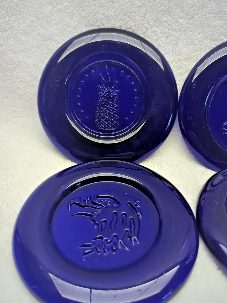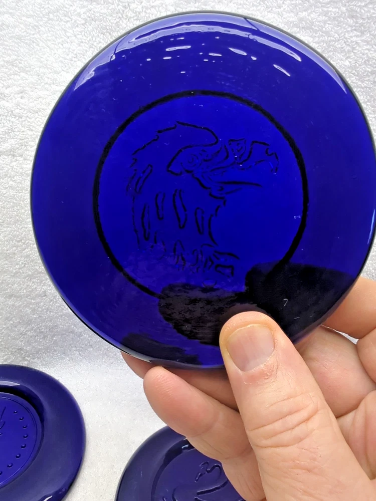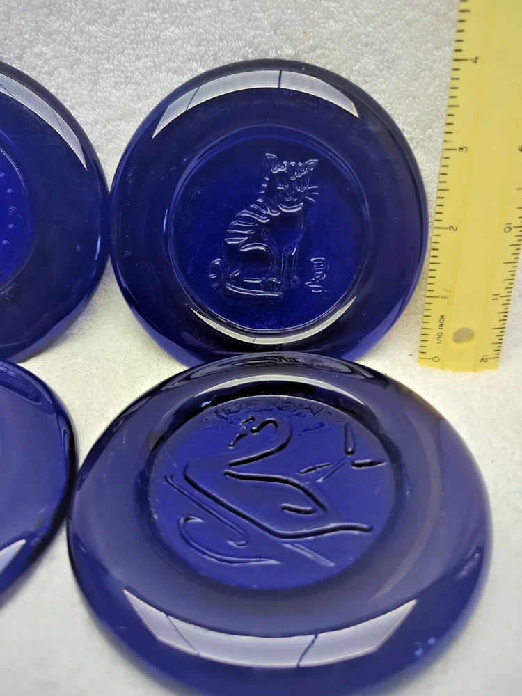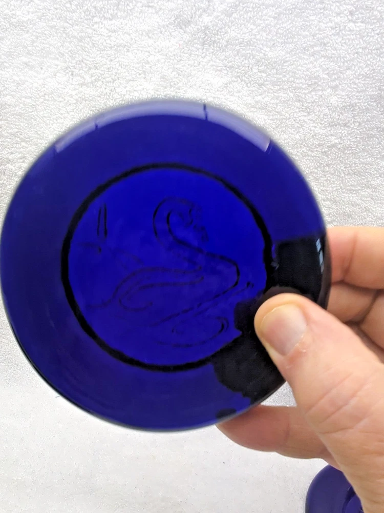 These vintage Erik Hoglund Kosta Boda glass ashtray/ paperweight features a unique cobalt blue color and a round shape with a diameter of 4 inches. Handmade in Sweden during the 1960s, this art glass piece is a part of the animal product line by Kosta Boda, known for its Mid-Century Modern style. These ashtray/ paperweights are decorated with four different designs, showcasing the craftsmanship and originality of Swedish glassmaking tradition. Cat/Swan/Pineapple/Eagle Head.