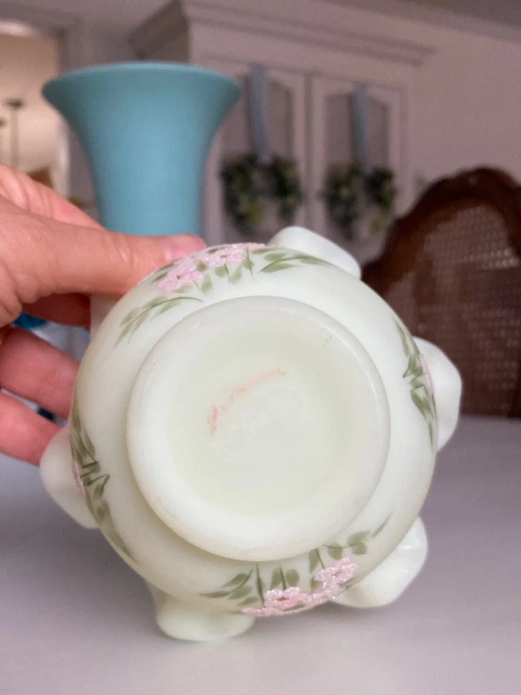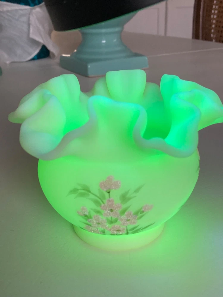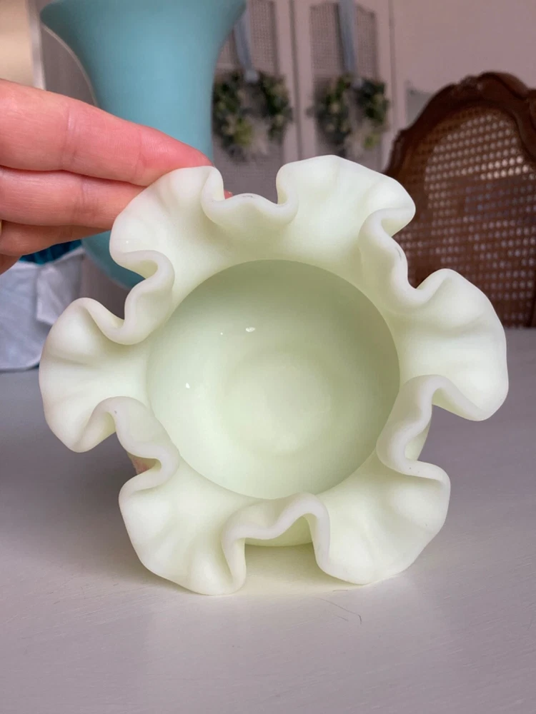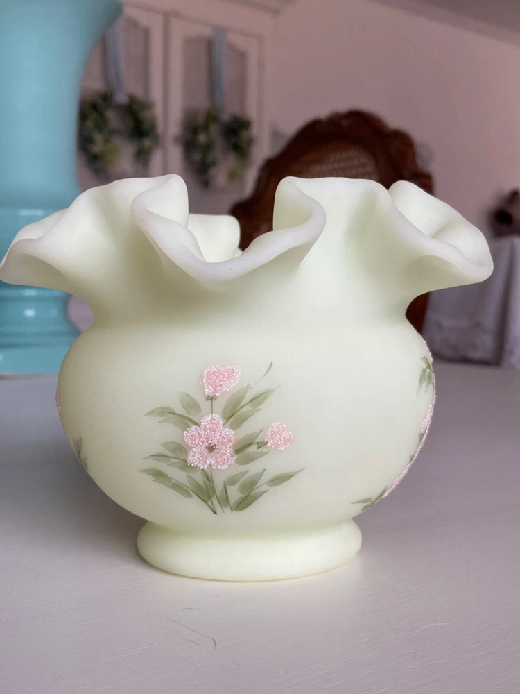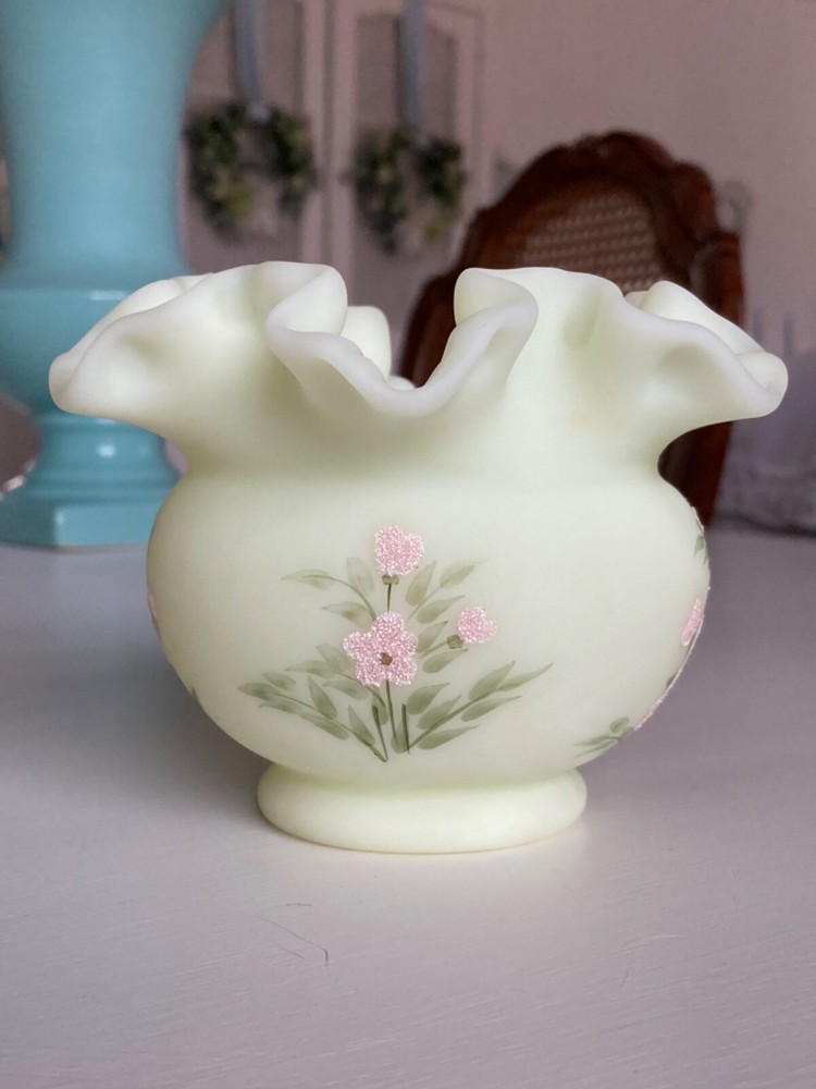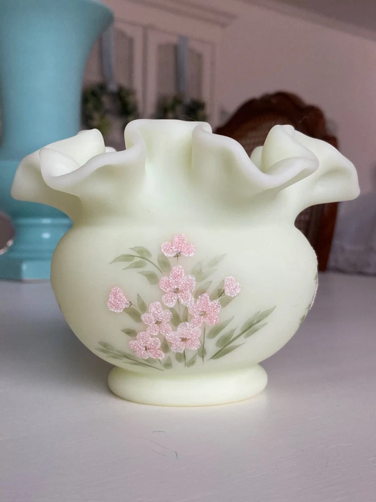 Vintage Fenton uranium custard glass in a very soft yellow with delicate hand painted pink blossoms that look “sugared” :-) It is a ruffled rose bowl with a faint embossed oval Fenton stamp on the bottom along with a signature of what looks like J Chapman. Such a pretty vase! Please email us with any questions and please check our Ebay store, Hooked-On-Vintage, for more great vintage items. We combine ship!