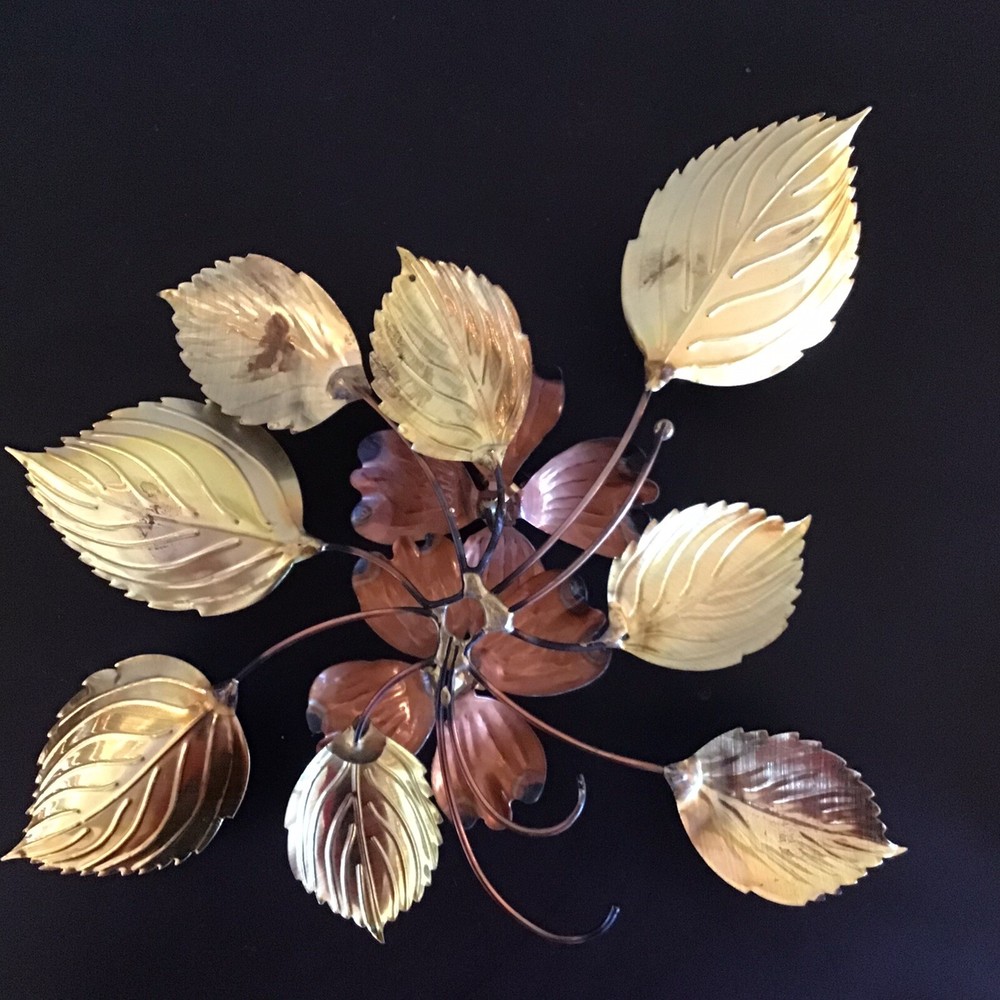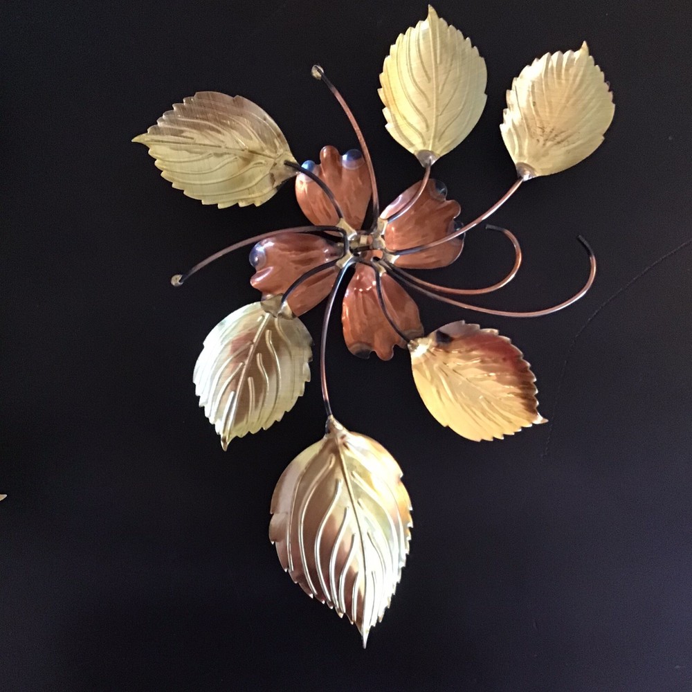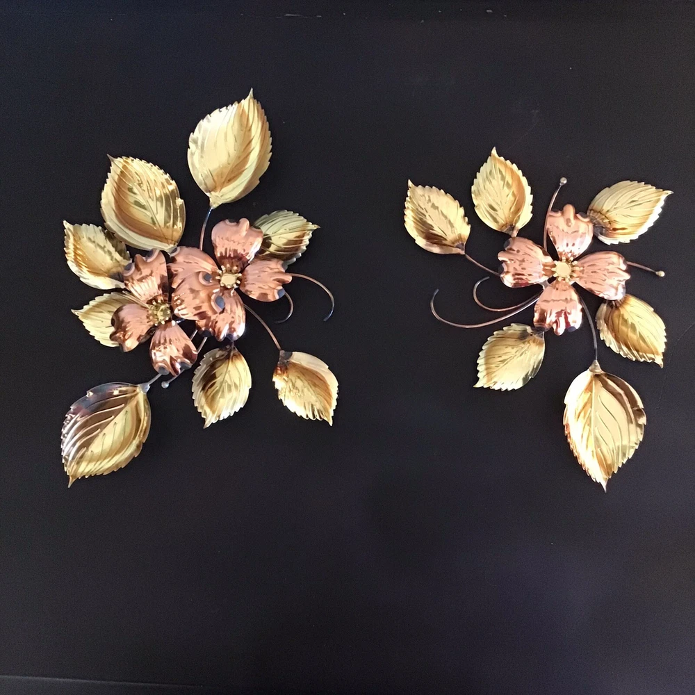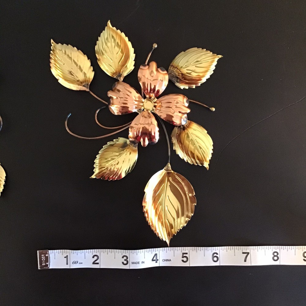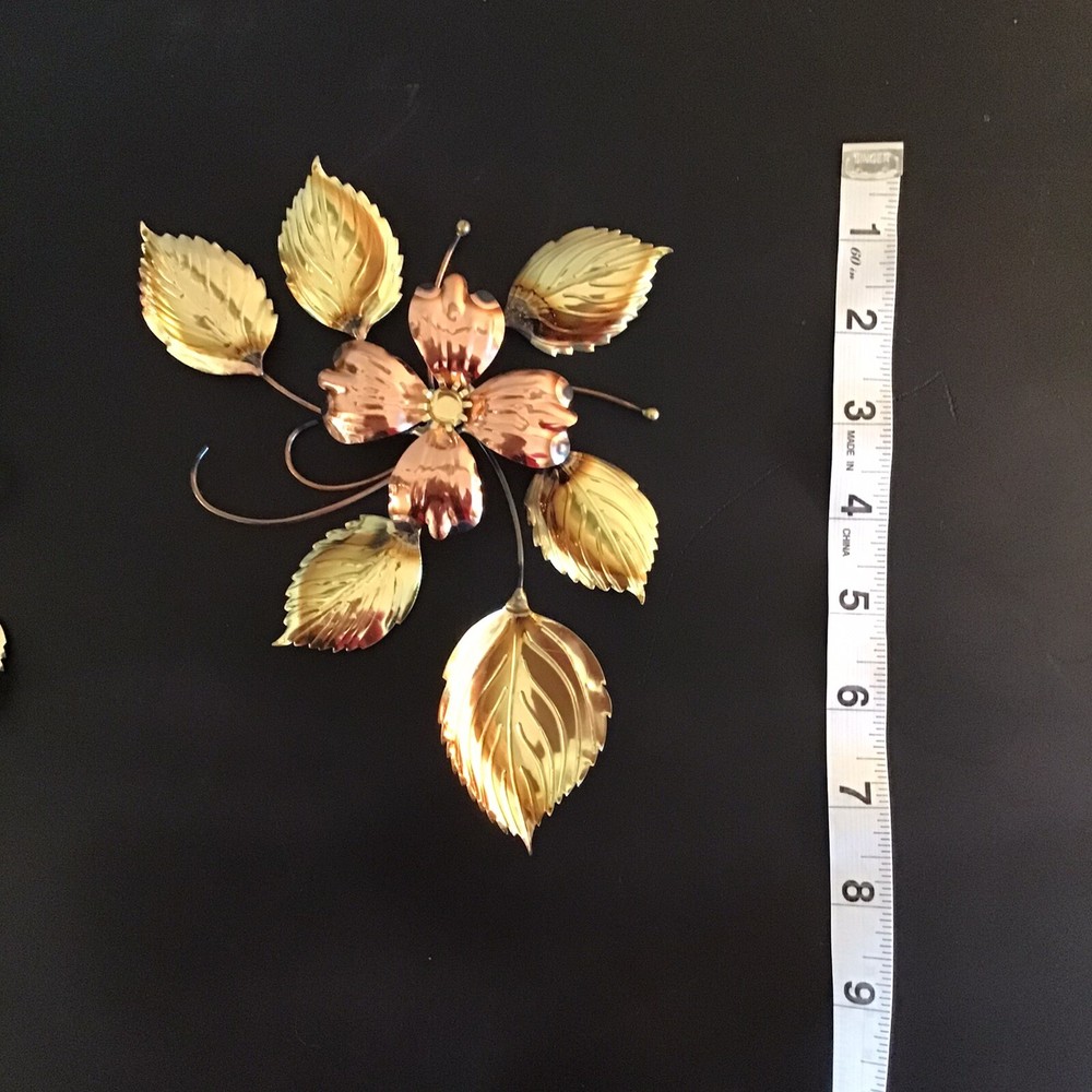 This vintage brass and copper wall decor set features a mid-century modern design of dogwood flowers and leaves. The medium-sized pieces are crafted from brass and copper, showcasing a combination of mixed metals that add a touch of elegance to any room. The wall-mounted art by Homco does not require any additional parts and can be easily cleaned with a damp cloth, making it a low-maintenance yet stylish addition to your home decor.