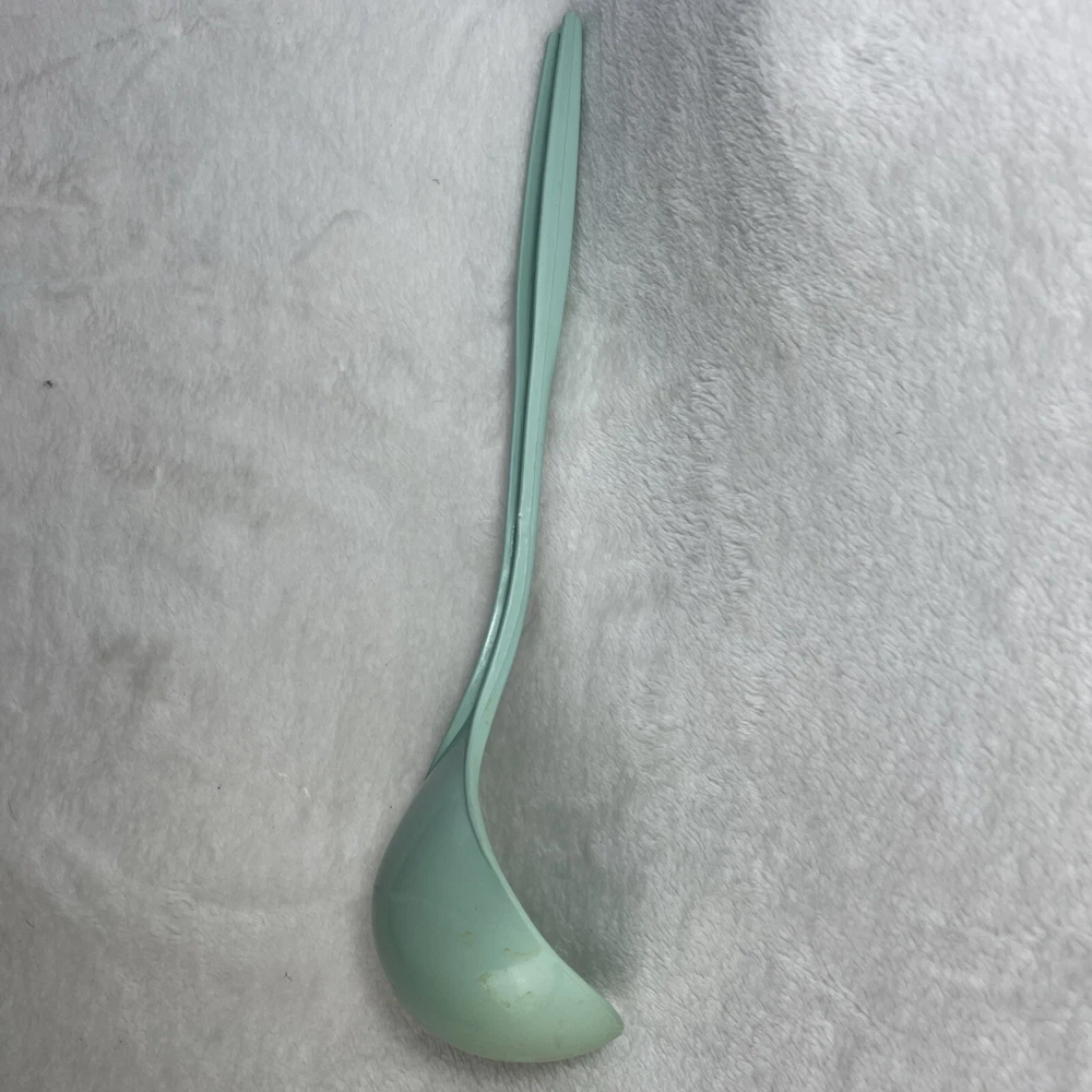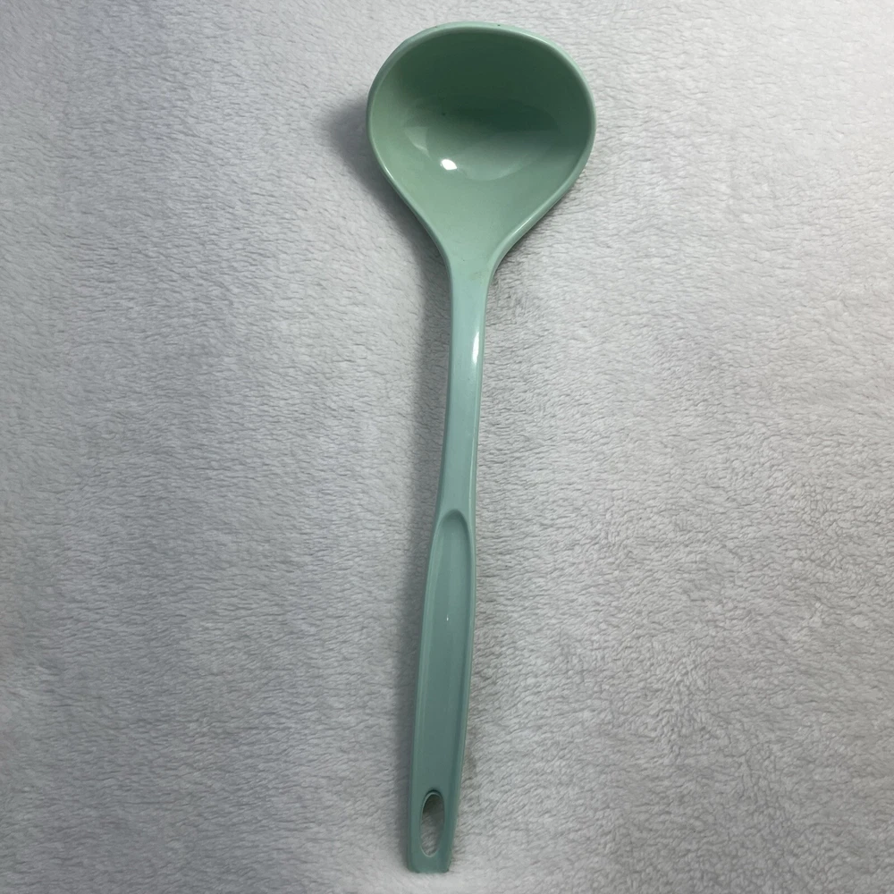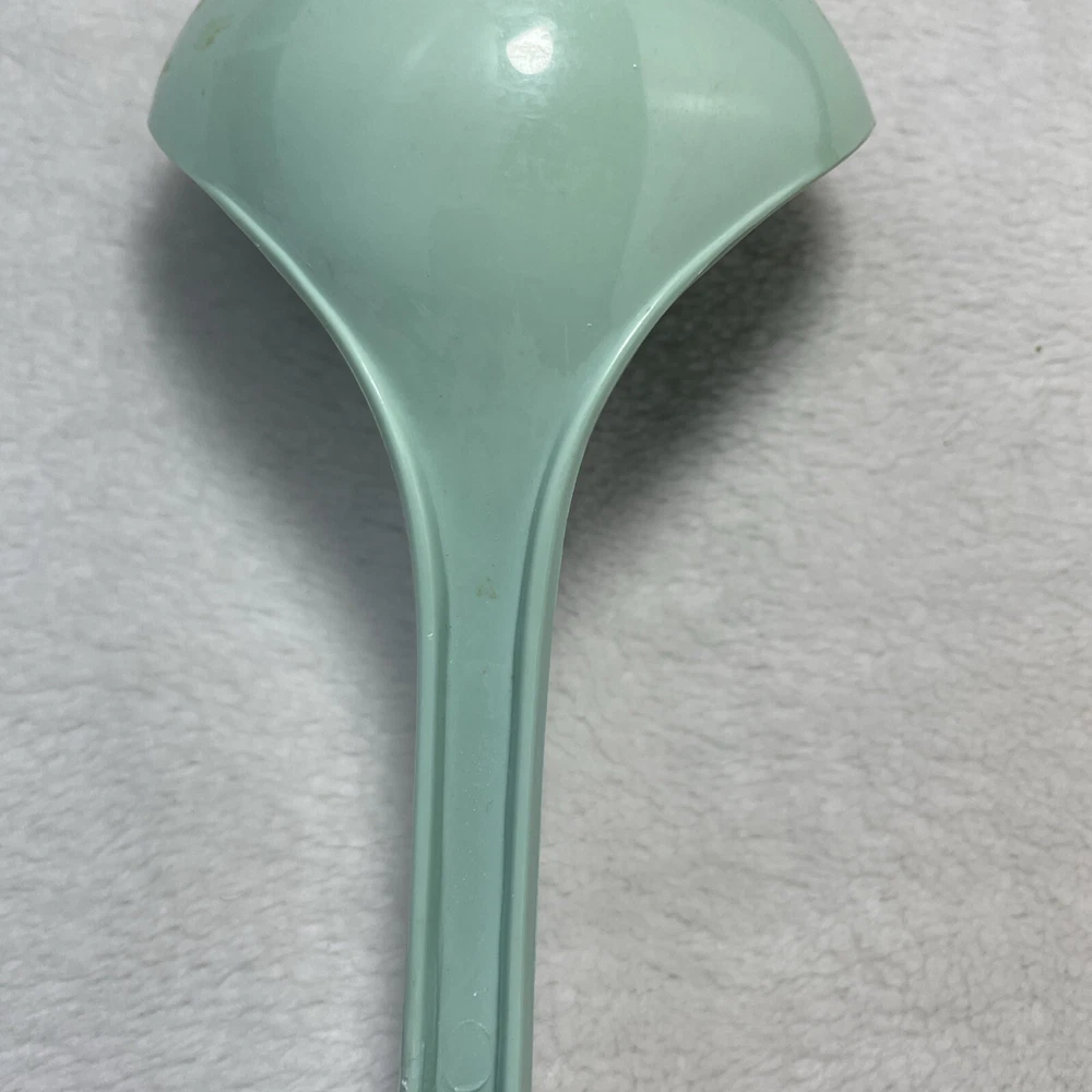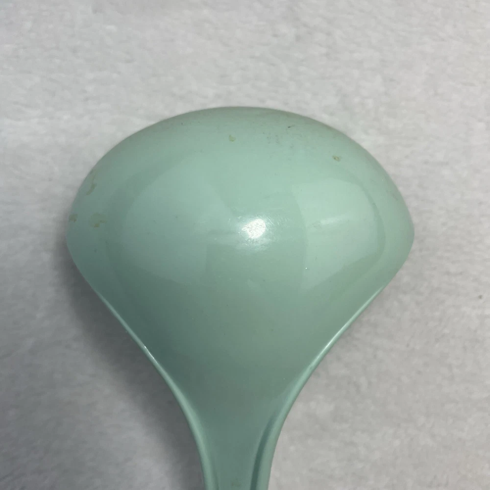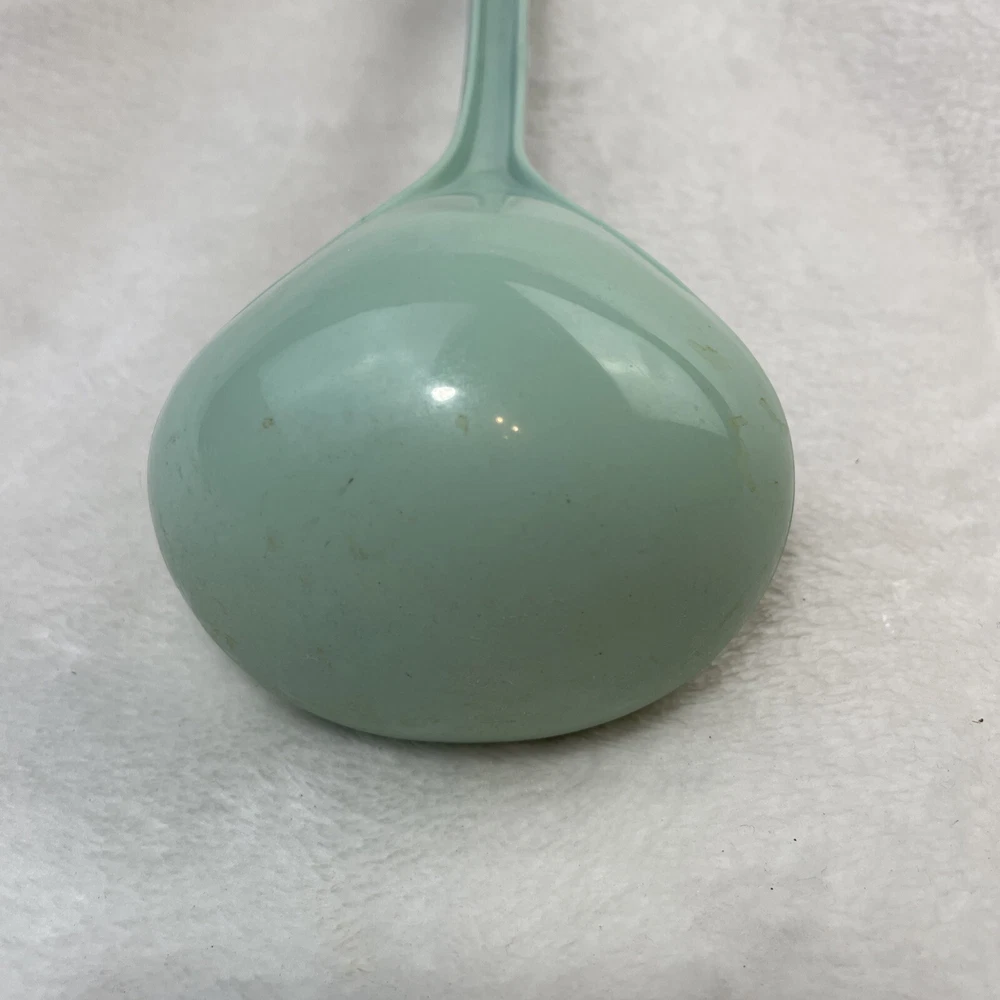 This vintage Foley nylon serving ladle is a must-have for any retro kitchen. The ladle comes in a beautiful green solid color and is made of durable plastic material. The ladle features a unique design with a curved lip and a solid pattern that makes it stand out from other ladles. The Foley nylon serving ladle is perfect for cooking and serving food. It is ideal for those who are looking for a retro-themed kitchen utensil that is both functional and stylish. The ladle is made in the United States and comes with a set that includes a ladle and a cooking spoon. The handle of the ladle is also made of plastic, making it easy to hold and use.