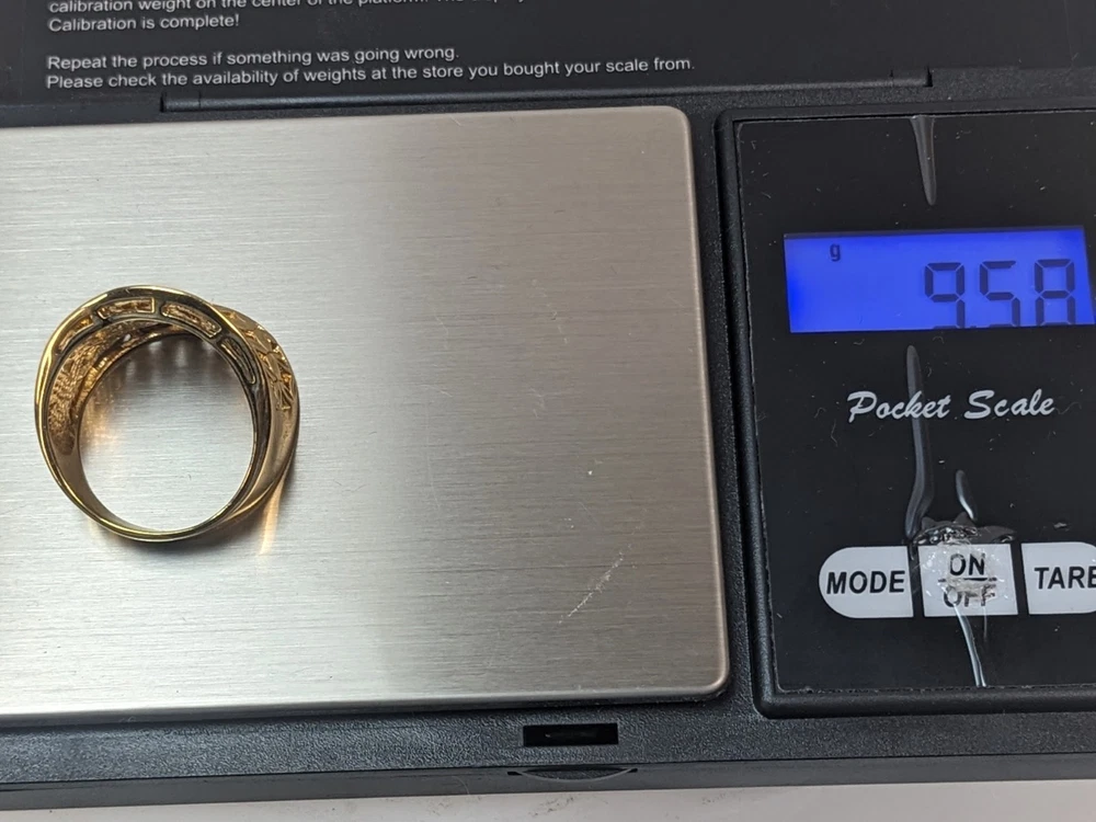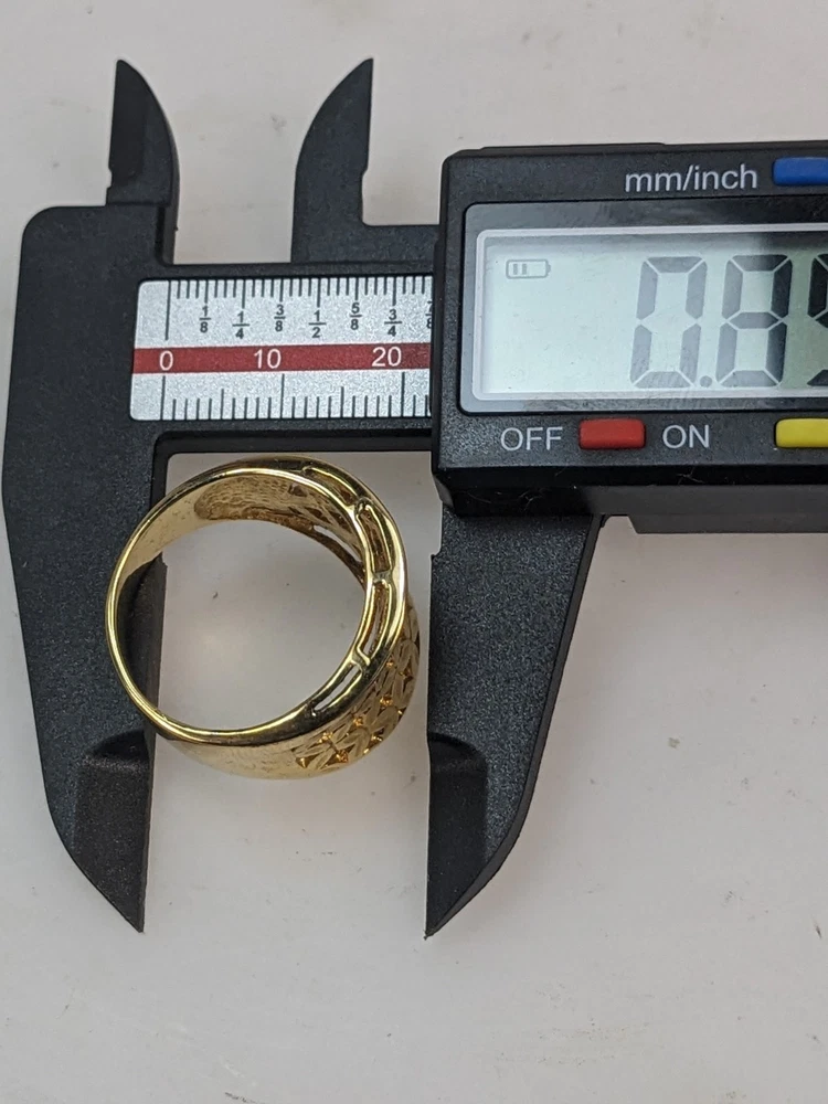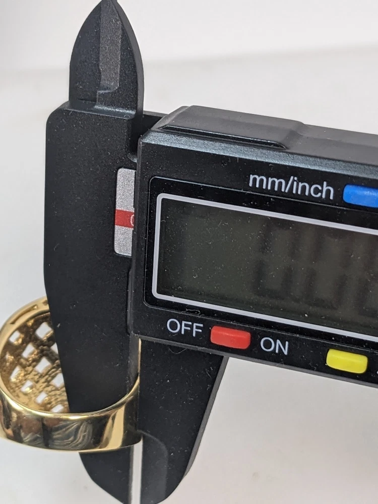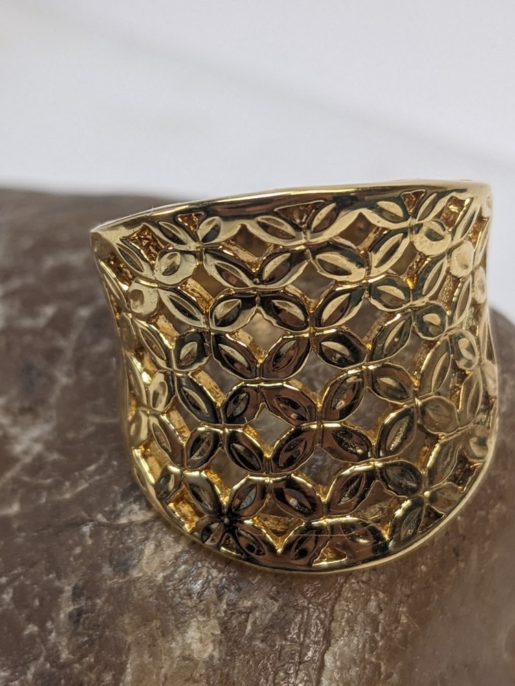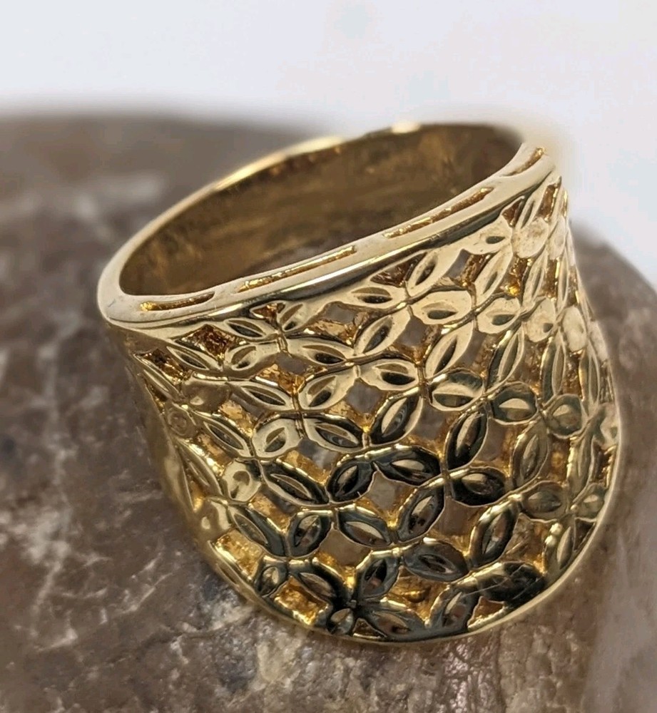 Vintage gold vermeil 925 woven concave cigar band ring featuring an intricate floral design. This bold statement piece has a wide, sculpted face and rich golden finish, offering substantial presence and a luxe, vintage look. Openwork lattice of small, petal‑shaped elements arranged to resemble stylized flowers across the front panel. Highly polished surfaces catch the light, while the recessed areas create contrast and emphasize the woven floral pattern. The design evokes a mix of modern and vintage aesthetics, making it versatile for both casual and dressy wear. Crafted in sterling silver with a gold vermeil finish, combining durability with a warm golden appearance. Interior of the band is stamped “CANADA” and “925,” indicating Canadian origin and sterling silver content. Solid construction with a smoothly finished inner shank for comfortable wear despite the ring’s bold width. Ring size 10, ideal as a substantial everyday band or statement piece on the index, middle, or ring finger depending on hand size. Weight is approximately 9.58 grams, giving the ring a noticeable, quality feel without being overly heavy. Wide concave front offers generous finger coverage and a flattering wraparound effect. Good used condition with light surface wear consistent with gentle vintage use. Gold vermeil retains attractive shine, and the floral lattice pattern remains crisp and well‑defined. No major damage noted, making it suitable for continued wear or addition to a vintage jewelry collection.