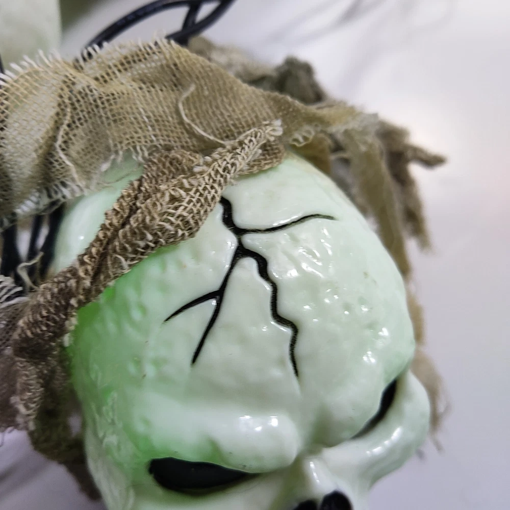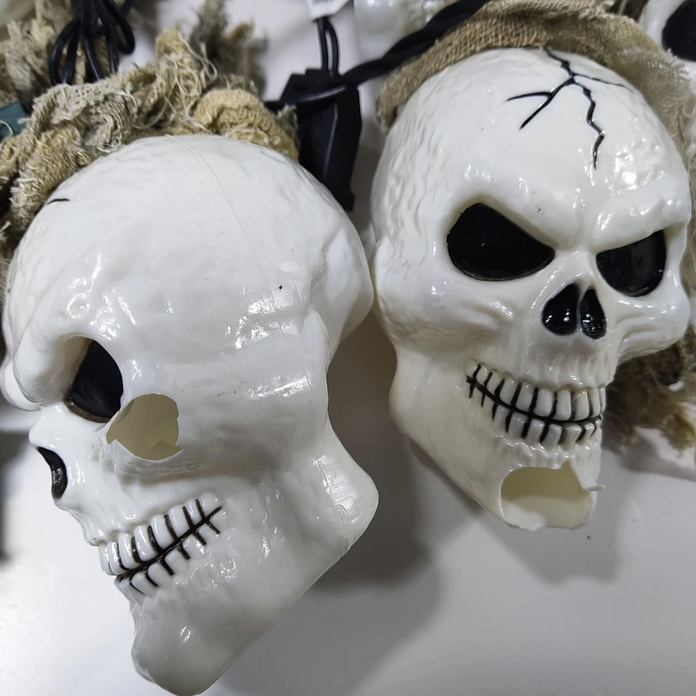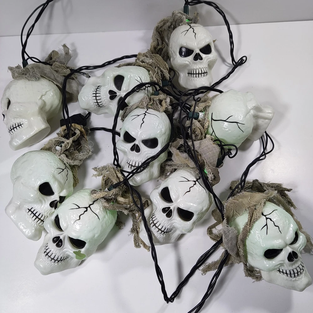 - Halloween string lights w' 9 blow mold white skulls - each embellished w' spooky gauze material - green lights, green cord - each skull is 4.5" tall - light string is 160" long CONDITION: All lights in working condition. NOTE: one skull is missing & 2 have damage. Pls. see provided pics. SHIPPING : Tracked and insured shipping. US orders ship via USPS