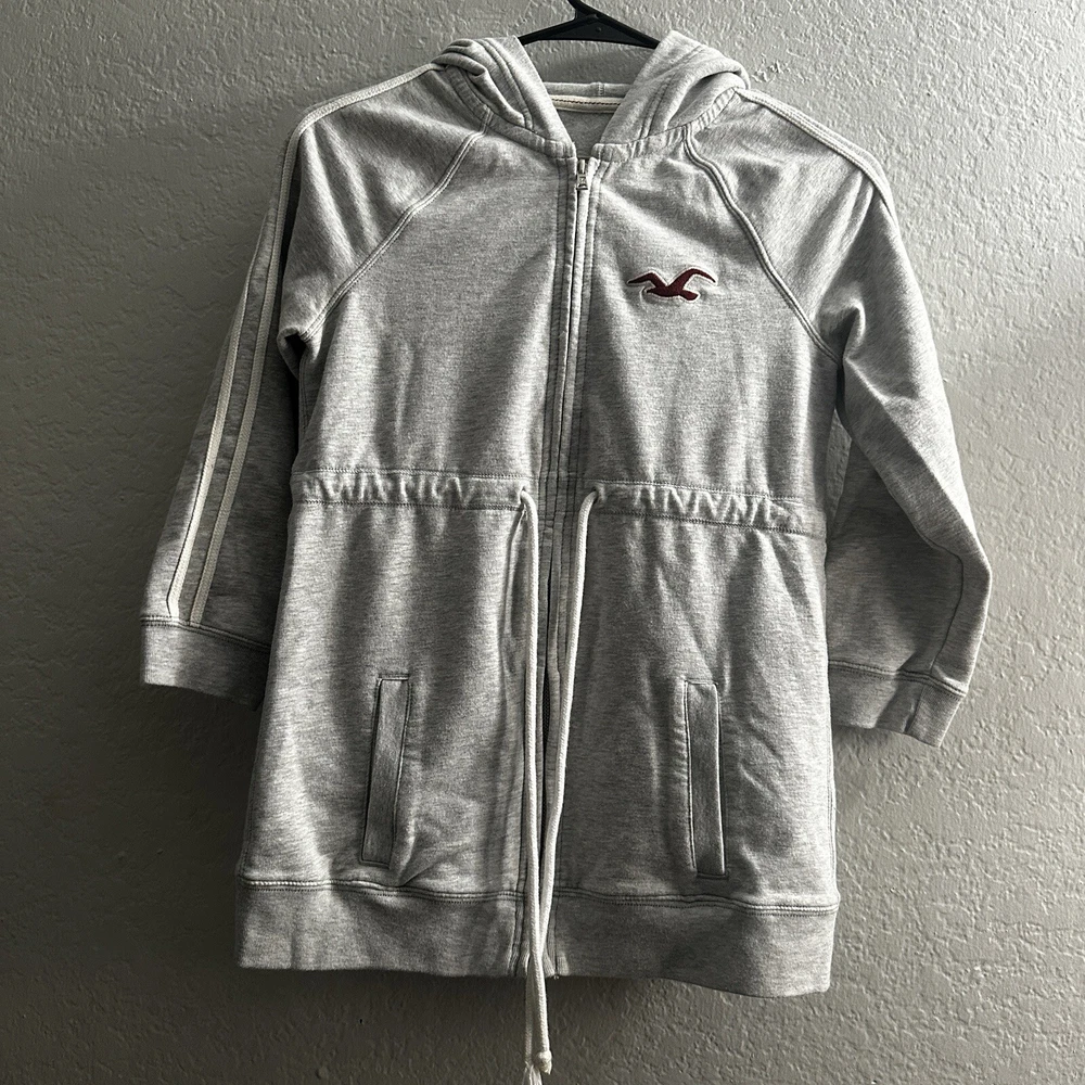 Occasion: Activewear Material: Cotton Blend Color: Gray Fabric Type: Blended Fabric Size: M Department: Women Closure: Drawstring Product Line: Hollister Features: Hooded, Pockets Style: Full Zip Type: Sweatshirt Brand: Hollister Theme: Y2K Vintage: Yes Sleeve Length: 3/4 Sleeve Size Type: Regular Pattern: Solid