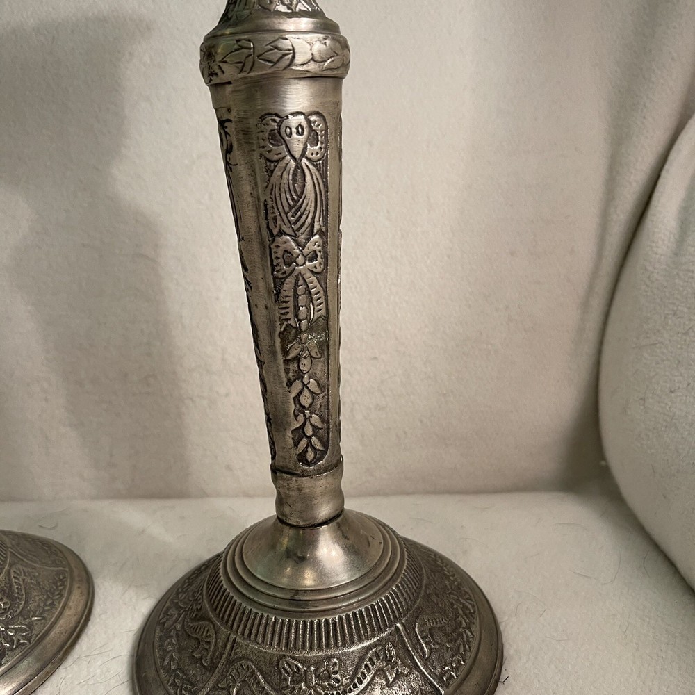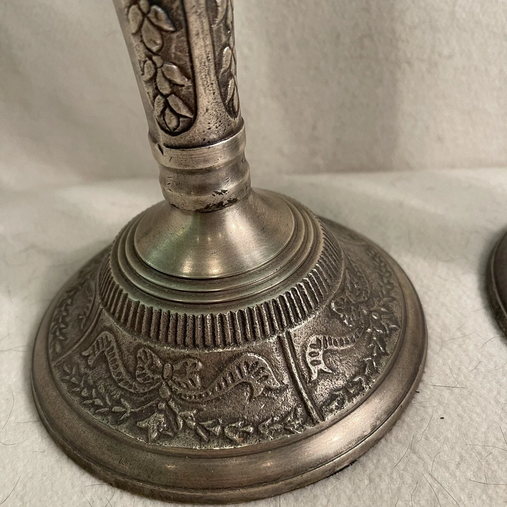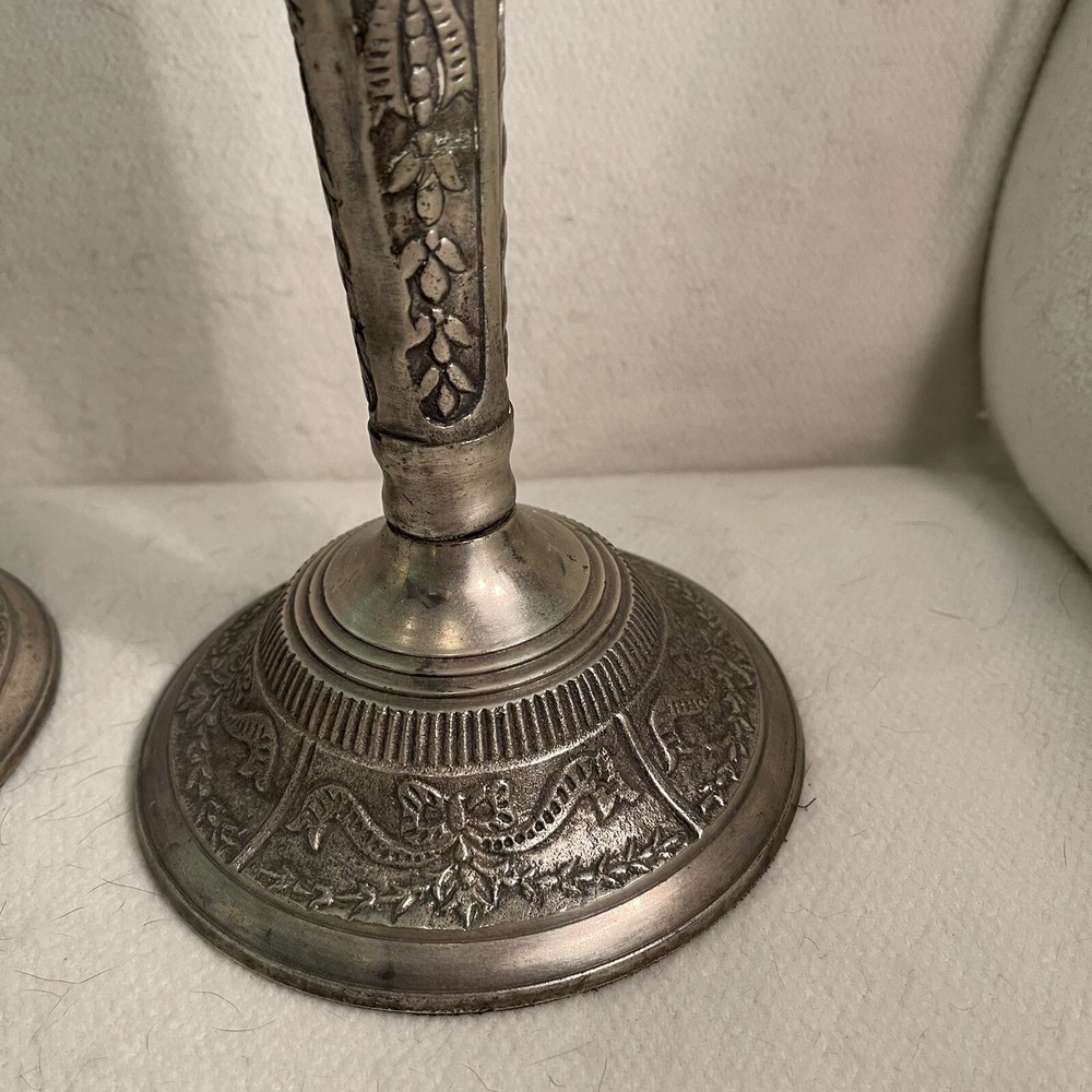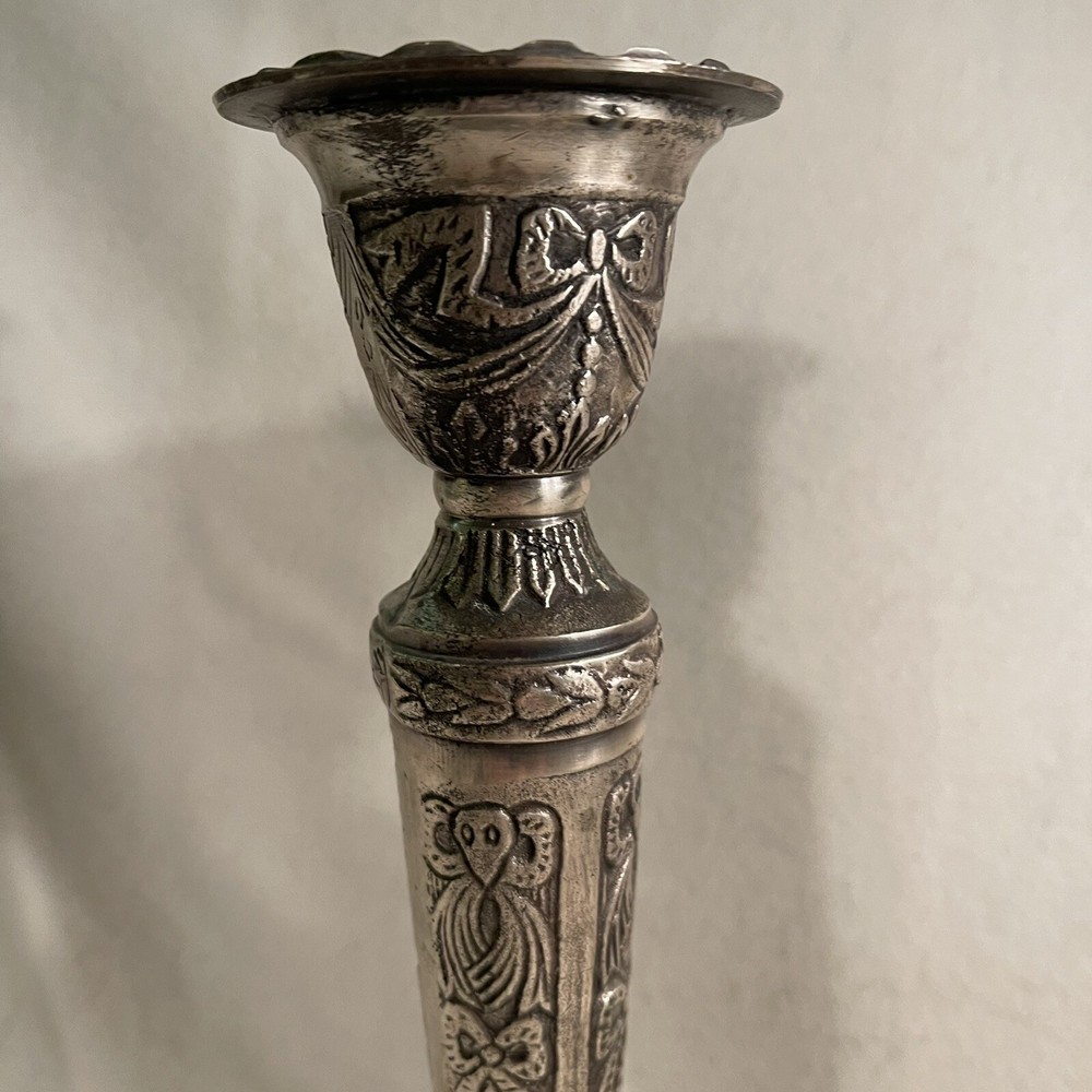 Add a touch of Baroque/Rococo style to your home decor with this vintage set of two large ornate candlestick holders. These handcrafted metal candle holders are perfect for tapers and come in a round shape with a textured finish. The pattern is all-over and the color is silver, making them a great addition to any collection. The candle holders are 11.25" tall and have a top width of 3" and a bottom width of 5". They weigh 3.2 lbs and are suitable for any room in your home. These candlestick holders are a must-have for anyone who loves to decorate their living space with unique and beautiful items. Excellent vintage condition.