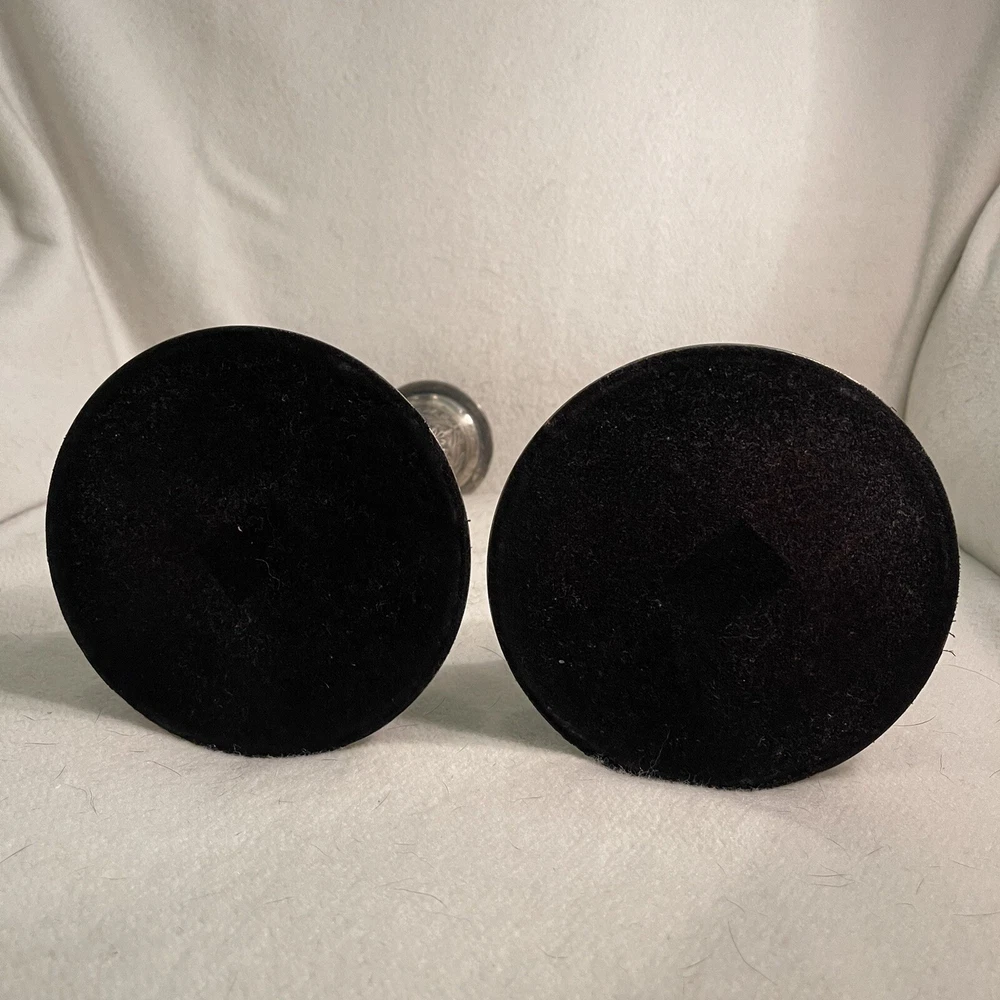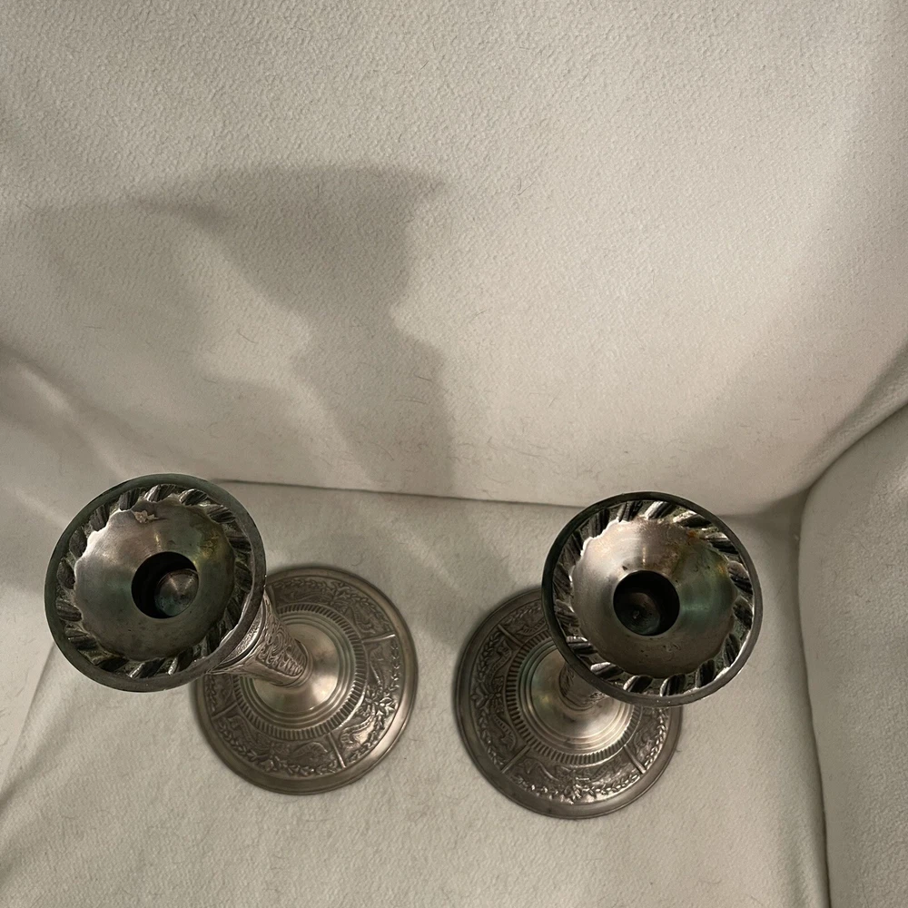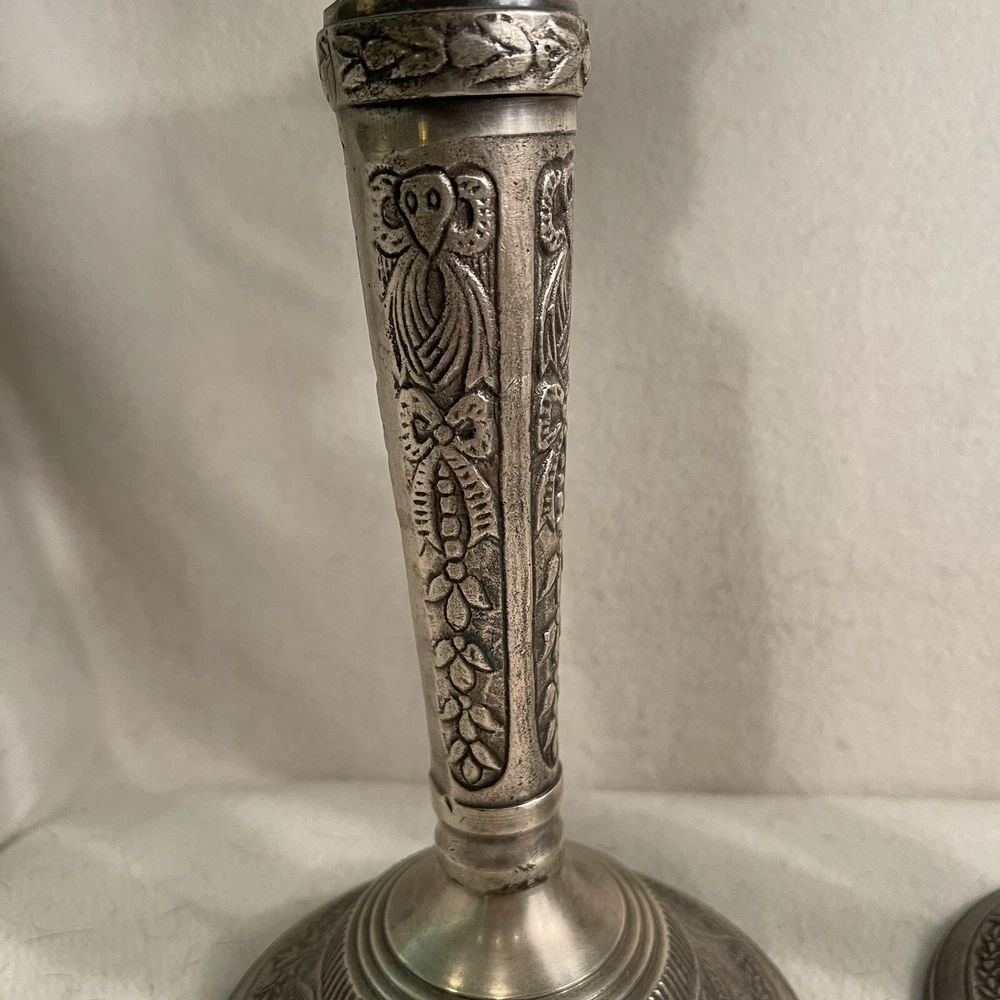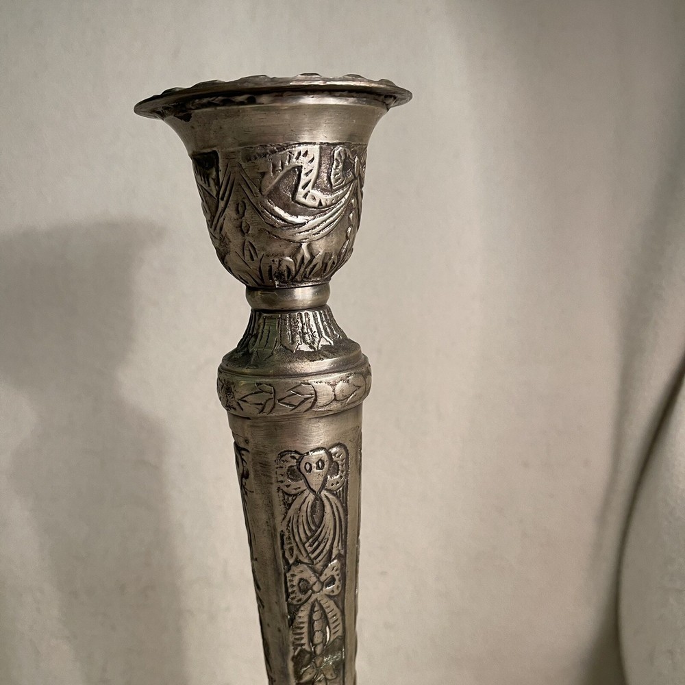 Add a touch of Baroque/Rococo style to your home decor with this vintage set of two large ornate candlestick holders. These handcrafted metal candle holders are perfect for tapers and come in a round shape with a textured finish. The pattern is all-over and the color is silver, making them a great addition to any collection. The candle holders are 11.25" tall and have a top width of 3" and a bottom width of 5". They weigh 3.2 lbs and are suitable for any room in your home. These candlestick holders are a must-have for anyone who loves to decorate their living space with unique and beautiful items. Excellent vintage condition.