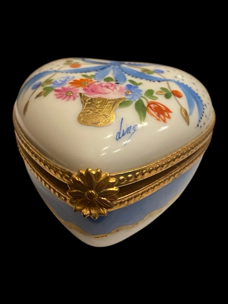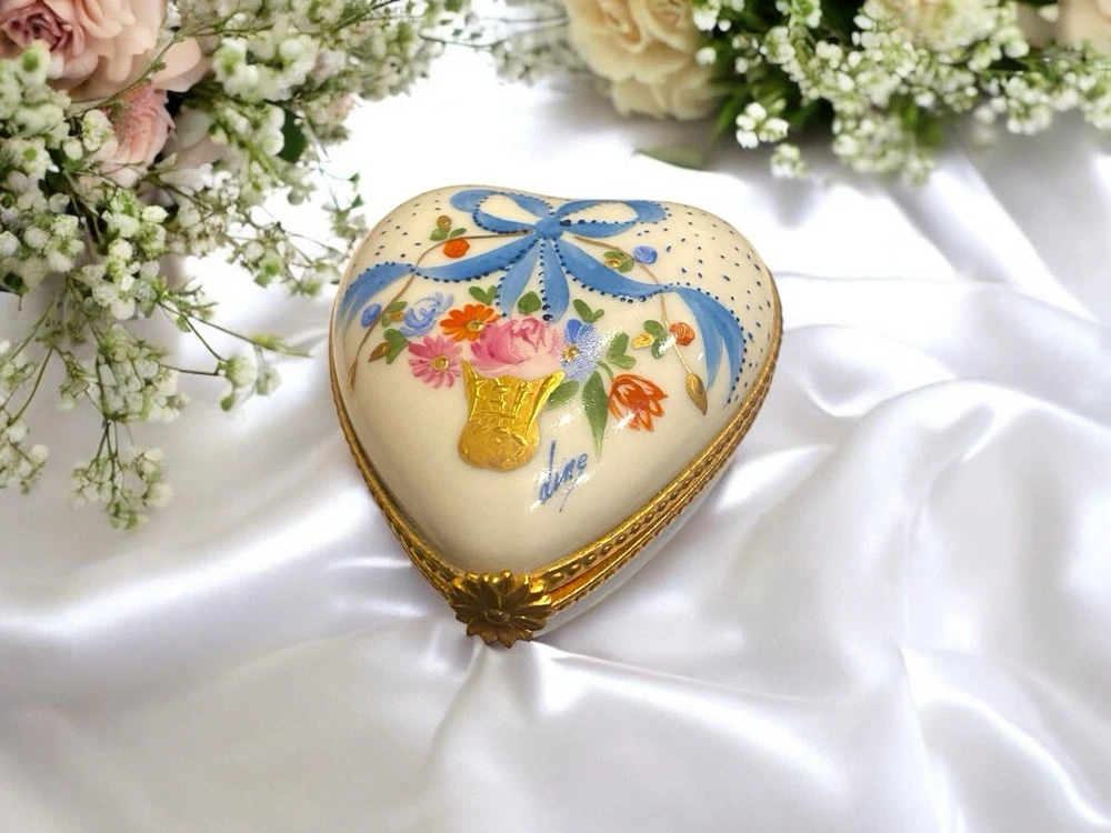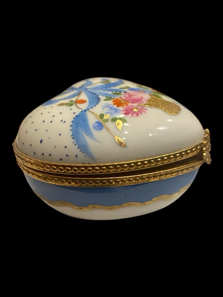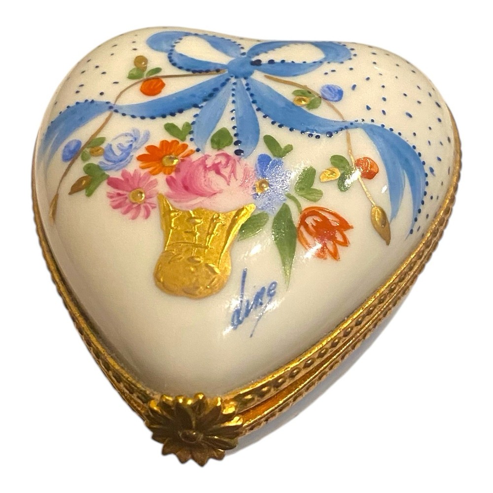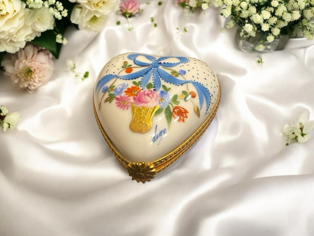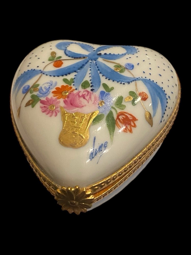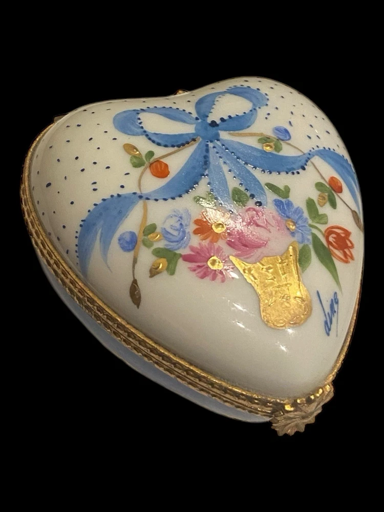 Vintage Limoges France Porcelain HEART SHAPED Trinket Box with Flower Basket and Large Blue Ribbon This beautiful Limoges porcelain trinket box is the perfect addition to any collection. With a heart shape and a floral pattern, it is a great gift for any occasion. The multicolor design and blue ribbon make it a charming and unique piece. It is small in size, measuring 2.5 inches in length, has a metal gold trim and snap gold flower shaped closure. This keepsake box is an original French piece and is perfect for any room. This trinket box makes a great Christmas, Mother's Day, birthday, or Valentine's Day gift for that special someone. Signed on back “Limoges France - Porcelaine de coree a la main - Paris Style” It’s in excellent vintage condition without chips, cracks or other damage and measures 2-1/2” long x 2” wide. Please see all the photos for all the details as they are a large part of our description. STORE POLICY: Condition is “New Old Stock” without retail box. Trinket box is 100 percent authentic and made in France. Sold as is, as found and as pictured. We aim to provide accurate and honest descriptions. All photos are an accurate representation of the item(s) you would be purchasing. Please zoom into the photos closely and judge the size, condition and content for yourself as our photos are a large part of our description. Please read descriptions carefully as we try to describe everything in as much detail as possible. Any concerns about the item’s condition, please address these concerns before purchasing. Most orders ship within 3-5 business days (Business days Mon-Fri) with USPS GROUND ADVANTAGE. *Expedited Shipping Option available at Checkout. Due to export limitations and restrictions, items listed in the Health & Beauty category CANNOT be shipped with eBay International Shipping. *Please check items included in eBay's hazardous, restricted or regulated materials policy. To ensure a positive shopping experience for all of our customers, returns ARE accepted. Items can be returned in their original condition for a full refund within 30 days of receipt; however, if an item is damaged or defaced by the customer, or if a new item is returned opened, used or without the tag(s) attached, the refund amount will be reduced by up to 50% as allowed by eBay. By purchasing this item(s), you are agreeing to this store policy. All returns must go through eBay Returns Center. If for any reason you no longer want to keep your item(s), please open a return request through eBay - We will provide a return label free of charge. We abide by eBay's rules and regulations for returns, if they are met, you will be refunded. If you have any further questions about the return policy, please contact an eBay customer service agent. If there is an issue with your purchase, PLEASE do not leave negative feedback before you have contacted us to resolve any issues. If you have any questions or concerns, please contact us directly by selecting the 'CONTACT SELLER' option. We will work with you quickly to resolve any questions or concerns. If any of our national network of stores identify unreasonable, problematic transactions, we reserve the right to block any buyer from future purchases at our discretion. Buy with confidence and rest assured that you are dealing with an experienced store whose #1 priority is customer satisfaction. We list new items continuously, so add us to your favorites list and check back often as you never know what you'll find here. Look around in our store as we have a huge selection of fragrances, skincare, makeup and other beauty products as well as vintage and hard to find items. THANK YOU for shopping with us! We want you to be happy with your purchase! PLEASE don't forget to leave positive feedback and give 5 stars in Seller's Rating. The information provided here is strictly to be used for informational purposes only. We do not represent or warrant the product details, ingredients, nutritional value, or any other product information to be accurate or complete. Manufacturers improve or change their product formulas, update labels, and change their packaging. It is recommended that you do not solely rely on the information described in this listing. For any specific product information or concerns, it is recommended that you contact the manufacturer directly. If there are healthcare concerns or questions, please contact your licensed healthcare professional for advice. Attention VeRO members: We are not affiliated or endorsed by the companies mentioned in this listing. All trademarks and copyrights are acknowledged, they are only used for informative description of the items offered for sale. All items are authentic as evidenced in our photos, legally acquired and owned, and hence; covered under First Sale Doctrine. Unlawful VeRO removal of this listing WILL constitute perjury and result in legal action.