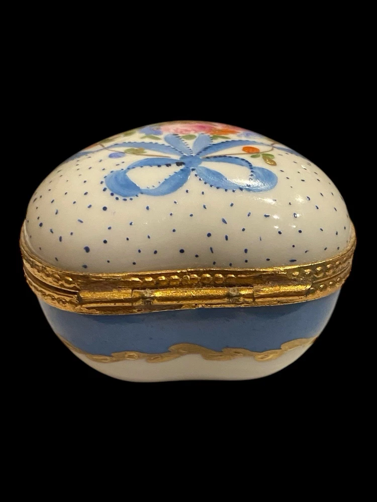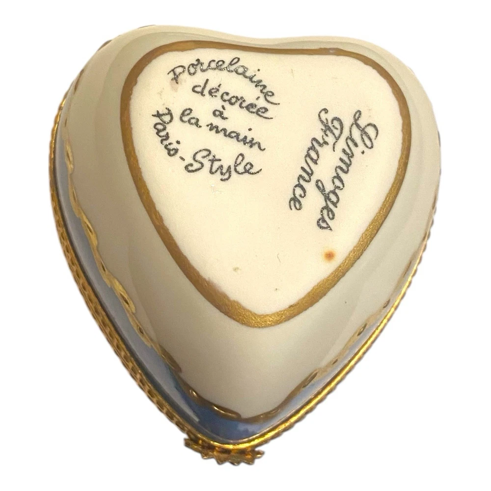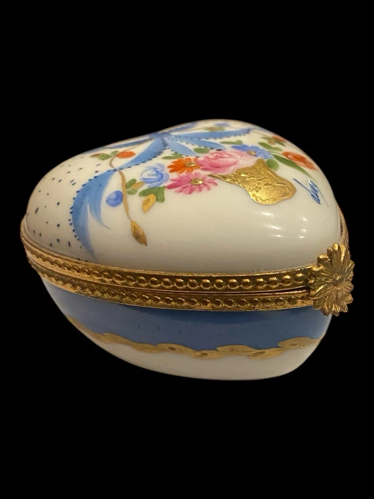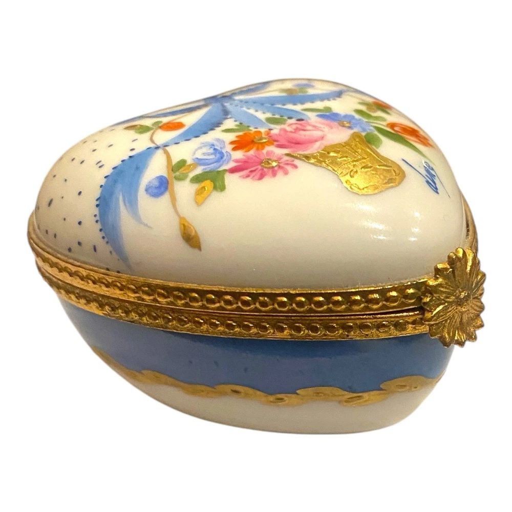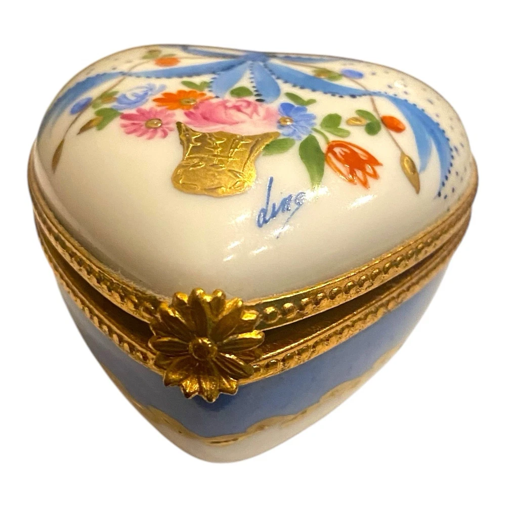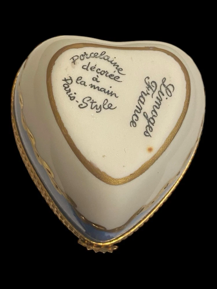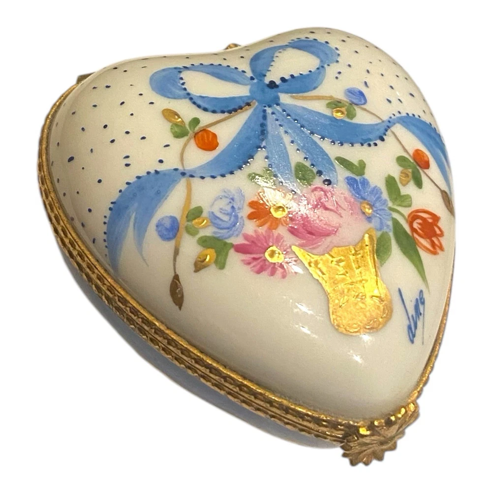Vintage Limoges France Porcelain HEART SHAPED Trinket Box with Flower Basket and Large Blue Ribbon This beautiful Limoges porcelain trinket box is the perfect addition to any collection. With a heart shape and a floral pattern, it is a great gift for any occasion. The multicolor design and blue ribbon make it a charming and unique piece. It is small in size, measuring 2.5 inches in length, has a metal gold trim and snap gold flower shaped closure. This keepsake box is an original French piece and is perfect for any room. This trinket box makes a great Christmas, Mother's Day, birthday, or Valentine's Day gift for that special someone. Signed on back “Limoges France - Porcelaine de coree a la main - Paris Style” It’s in excellent vintage condition without chips, cracks or other damage and measures 2-1/2” long x 2” wide. Please see all the photos for all the details as they are a large part of our description. STORE POLICY: Condition is “New Old Stock” without retail box. Trinket box is 100 percent authentic and made in France. Sold as is, as found and as pictured. We aim to provide accurate and honest descriptions. All photos are an accurate representation of the item(s) you would be purchasing. Please zoom into the photos closely and judge the size, condition and content for yourself as our photos are a large part of our description. Please read descriptions carefully as we try to describe everything in as much detail as possible. Any concerns about the item’s condition, please address these concerns before purchasing. Most orders ship within 3-5 business days (Business days Mon-Fri) with USPS GROUND ADVANTAGE. *Expedited Shipping Option available at Checkout. Due to export limitations and restrictions, items listed in the Health & Beauty category CANNOT be shipped with eBay International Shipping. *Please check items included in eBay's hazardous, restricted or regulated materials policy. To ensure a positive shopping experience for all of our customers, returns ARE accepted. Items can be returned in their original condition for a full refund within 30 days of receipt; however, if an item is damaged or defaced by the customer, or if a new item is returned opened, used or without the tag(s) attached, the refund amount will be reduced by up to 50% as allowed by eBay. By purchasing this item(s), you are agreeing to this store policy. All returns must go through eBay Returns Center. If for any reason you no longer want to keep your item(s), please open a return request through eBay - We will provide a return label free of charge. We abide by eBay's rules and regulations for returns, if they are met, you will be refunded. If you have any further questions about the return policy, please contact an eBay customer service agent. If there is an issue with your purchase, PLEASE do not leave negative feedback before you have contacted us to resolve any issues. If you have any questions or concerns, please contact us directly by selecting the 'CONTACT SELLER' option. We will work with you quickly to resolve any questions or concerns. If any of our national network of stores identify unreasonable, problematic transactions, we reserve the right to block any buyer from future purchases at our discretion. Buy with confidence and rest assured that you are dealing with an experienced store whose #1 priority is customer satisfaction. We list new items continuously, so add us to your favorites list and check back often as you never know what you'll find here. Look around in our store as we have a huge selection of fragrances, skincare, makeup and other beauty products as well as vintage and hard to find items. THANK YOU for shopping with us! We want you to be happy with your purchase! PLEASE don't forget to leave positive feedback and give 5 stars in Seller's Rating. The information provided here is strictly to be used for informational purposes only. We do not represent or warrant the product details, ingredients, nutritional value, or any other product information to be accurate or complete. Manufacturers improve or change their product formulas, update labels, and change their packaging. It is recommended that you do not solely rely on the information described in this listing. For any specific product information or concerns, it is recommended that you contact the manufacturer directly. If there are healthcare concerns or questions, please contact your licensed healthcare professional for advice. Attention VeRO members: We are not affiliated or endorsed by the companies mentioned in this listing. All trademarks and copyrights are acknowledged, they are only used for informative description of the items offered for sale. All items are authentic as evidenced in our photos, legally acquired and owned, and hence; covered under First Sale Doctrine. Unlawful VeRO removal of this listing WILL constitute perjury and result in legal action.