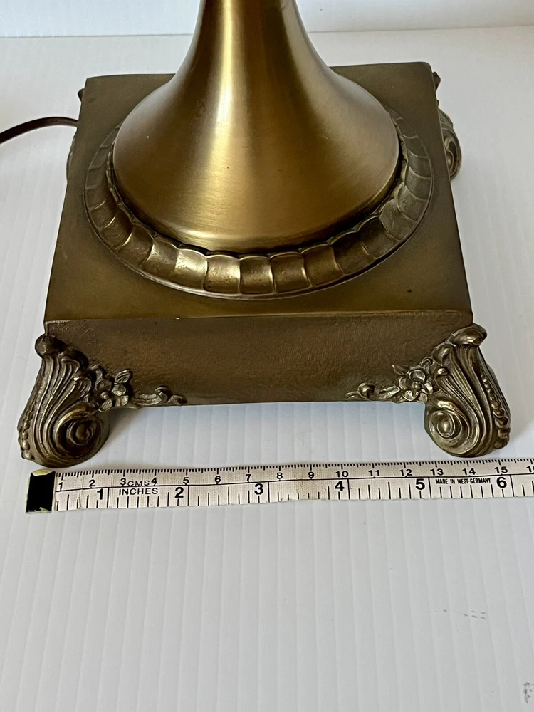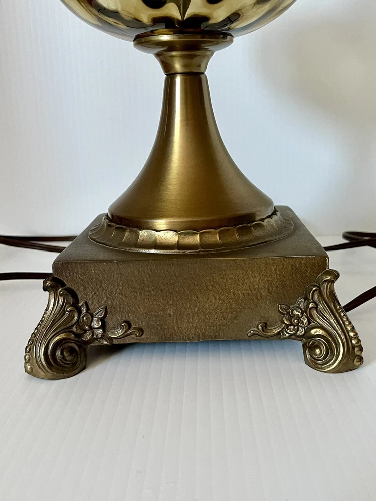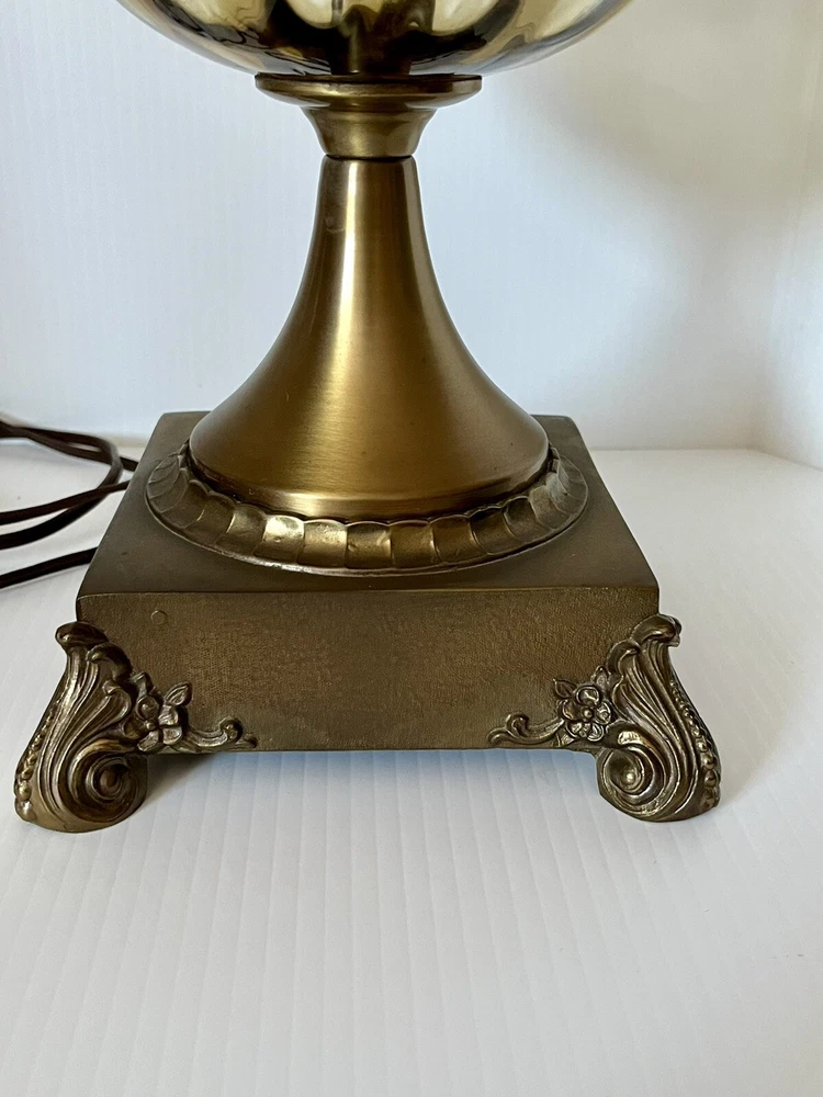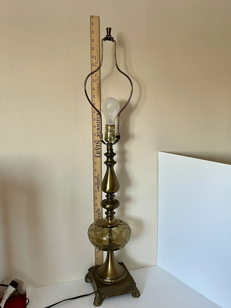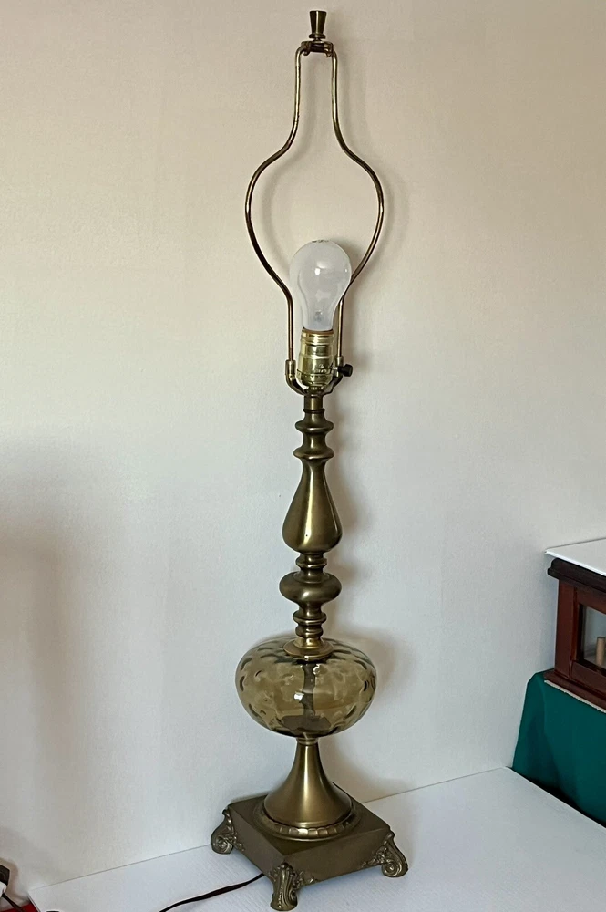 Power Source: Corded Theme: Art, Periods & Styles Item Height: 34 inches Brand: Unbranded Cord Color: Brown Type: Table Lamp Design: Empire Original/Reproduction: Original Country/Region of Manufacture: United States Color: Brown Features: 3-way Switch Material: Brass, Glass Shade Shape: N/A Control Style: Knob Control Time Period Manufactured: 1950-1959 Lighting Technology: Incandescent Style: Hollywood Regency Size: Large Vintage: Yes Era: 1950s