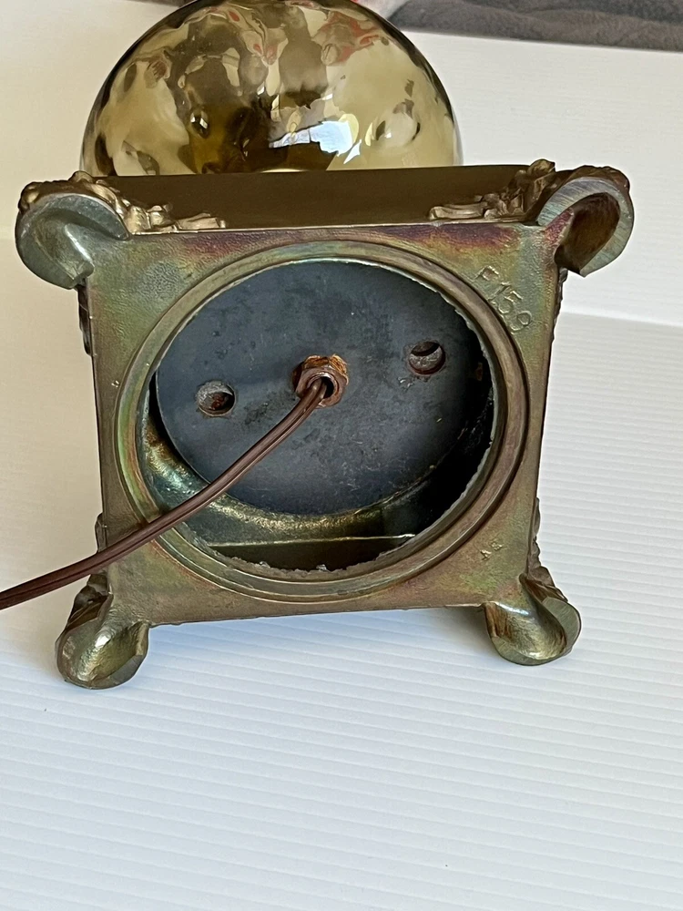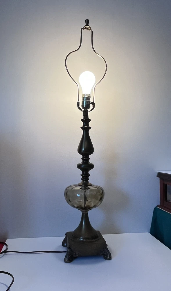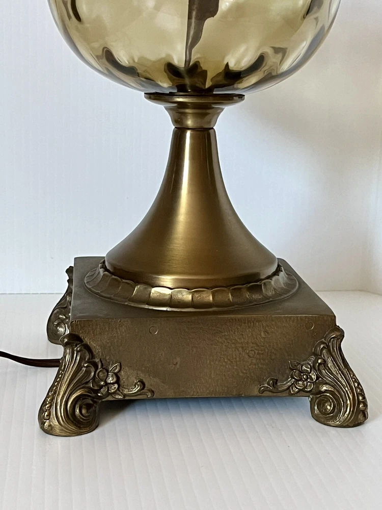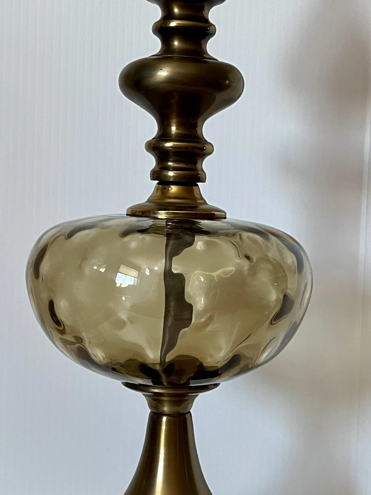 Vintage Brass table lamp with transparent brown art glass globe Original harp finial and cord. Three- way switch/ working Lamp 24” base to socket total = 34” tall w harp & finial weight 5 lbs 8 oz Brass shows patina signs of aging otherwise there are not any dents chips bending looseness or damage original owner estate find See photos Thank you