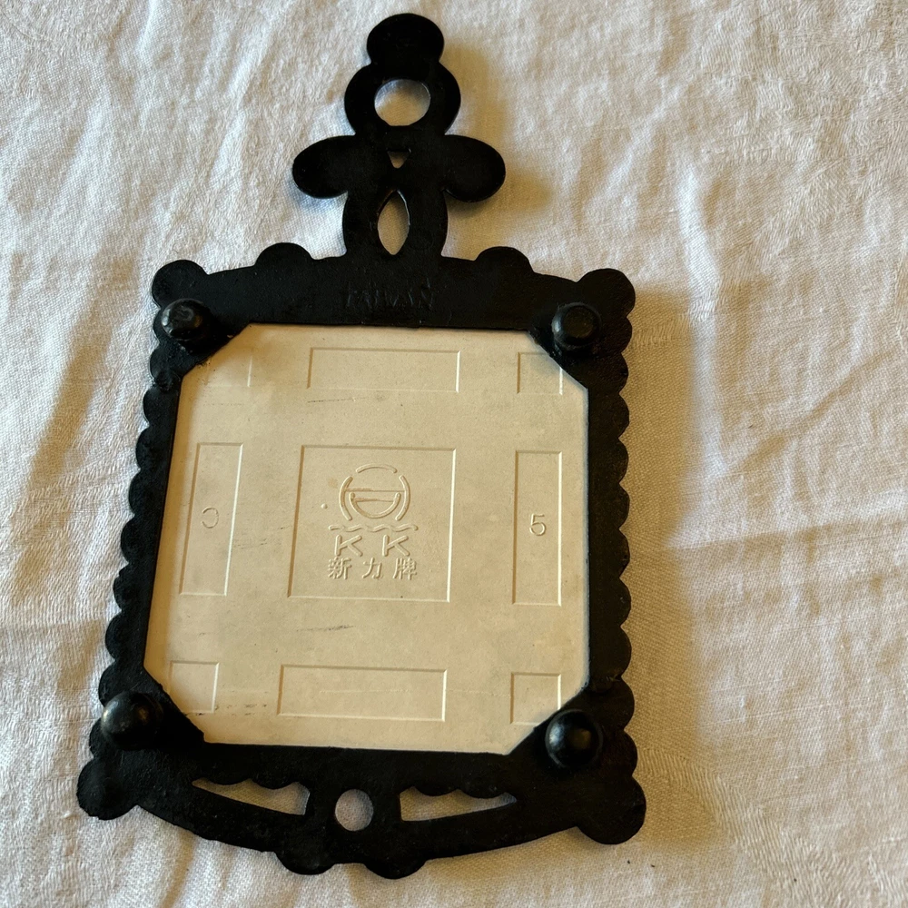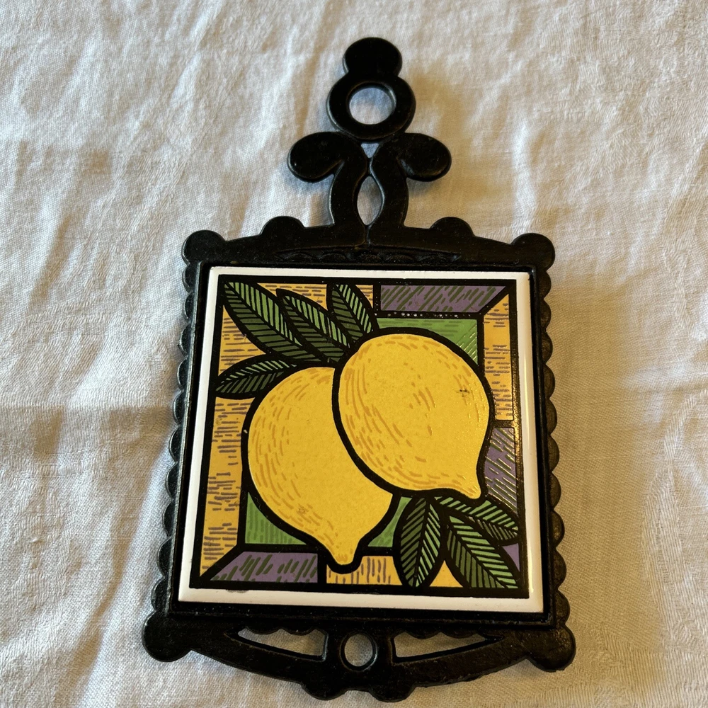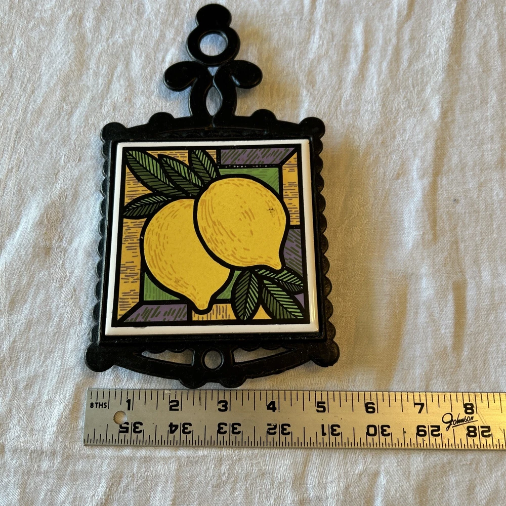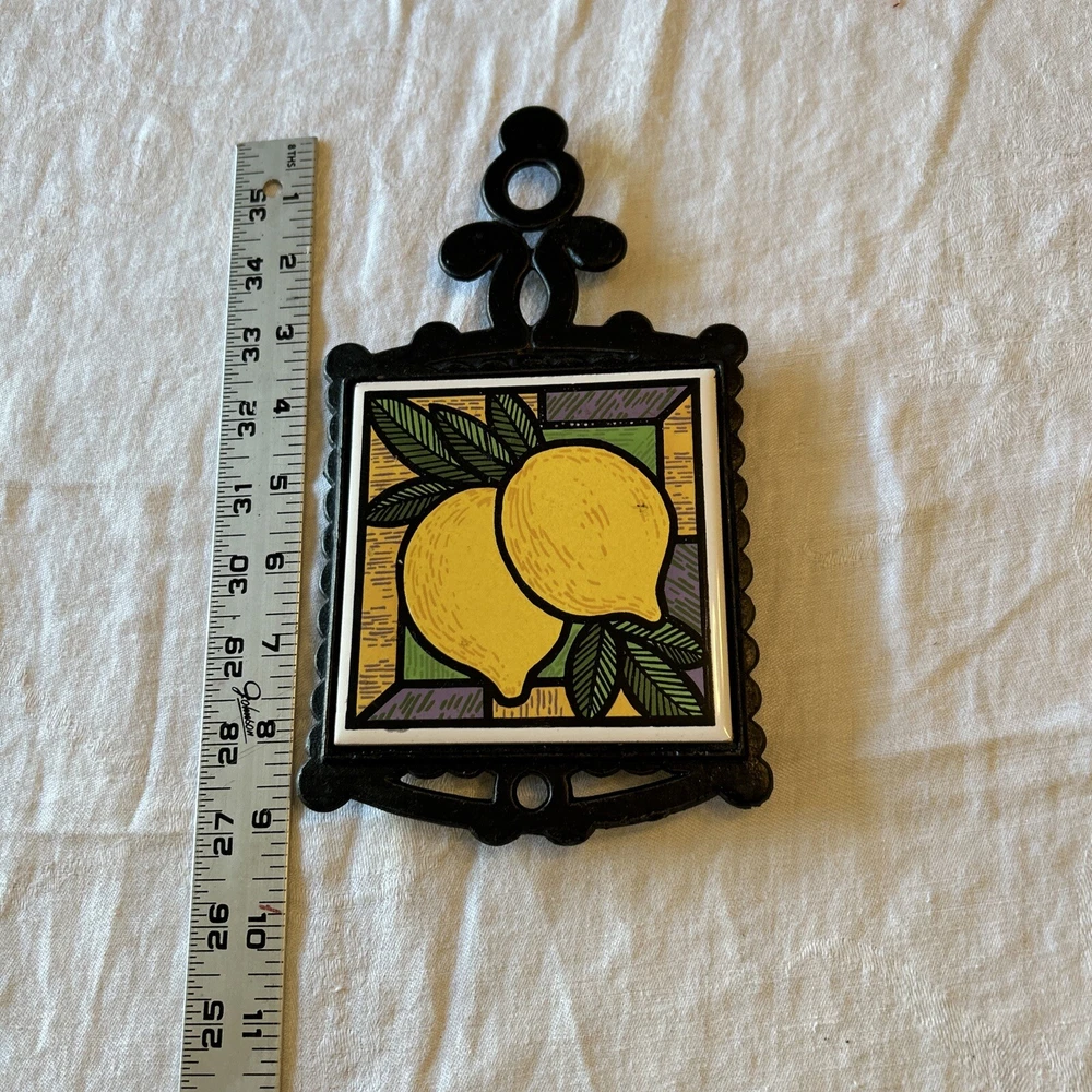 Vtg MCM Cast Iron Black Framed Tile Trivet Lemon 70s Cottagecore Farmhouse This vintage mid-century modern trivet features a black framed tile design with a lemon pattern. The small square shape measures 5 inches in width and 9.5 inches in height, with a sturdy handle for easy use. Made of cast iron and ceramic materials, this original piece is perfect for any collector of kitchen tools and gadgets. The trivet is ideal for protecting hot pots and pans, and its retro style adds a touch of farmhouse charm to any kitchen.