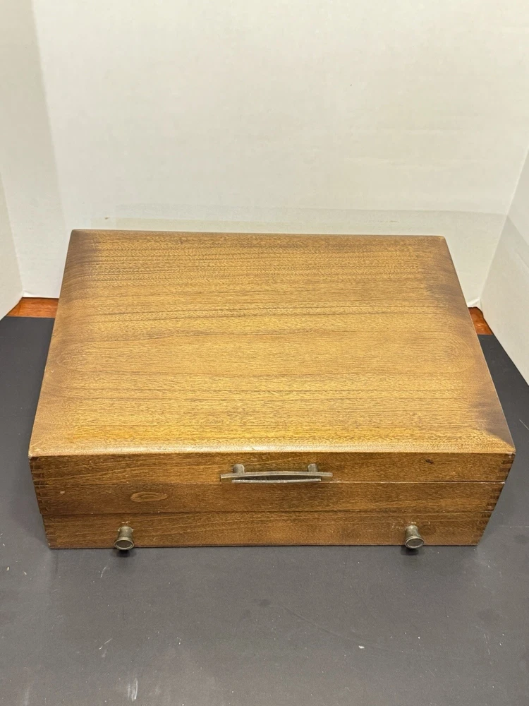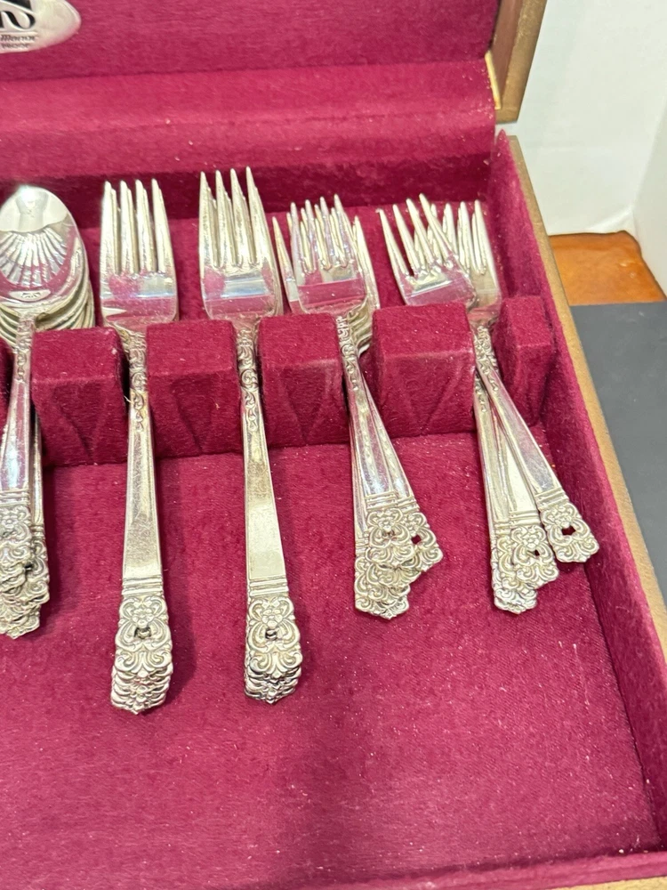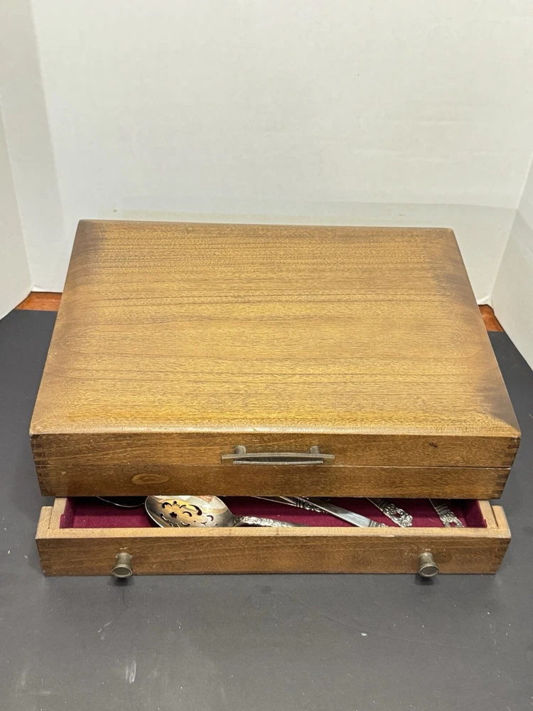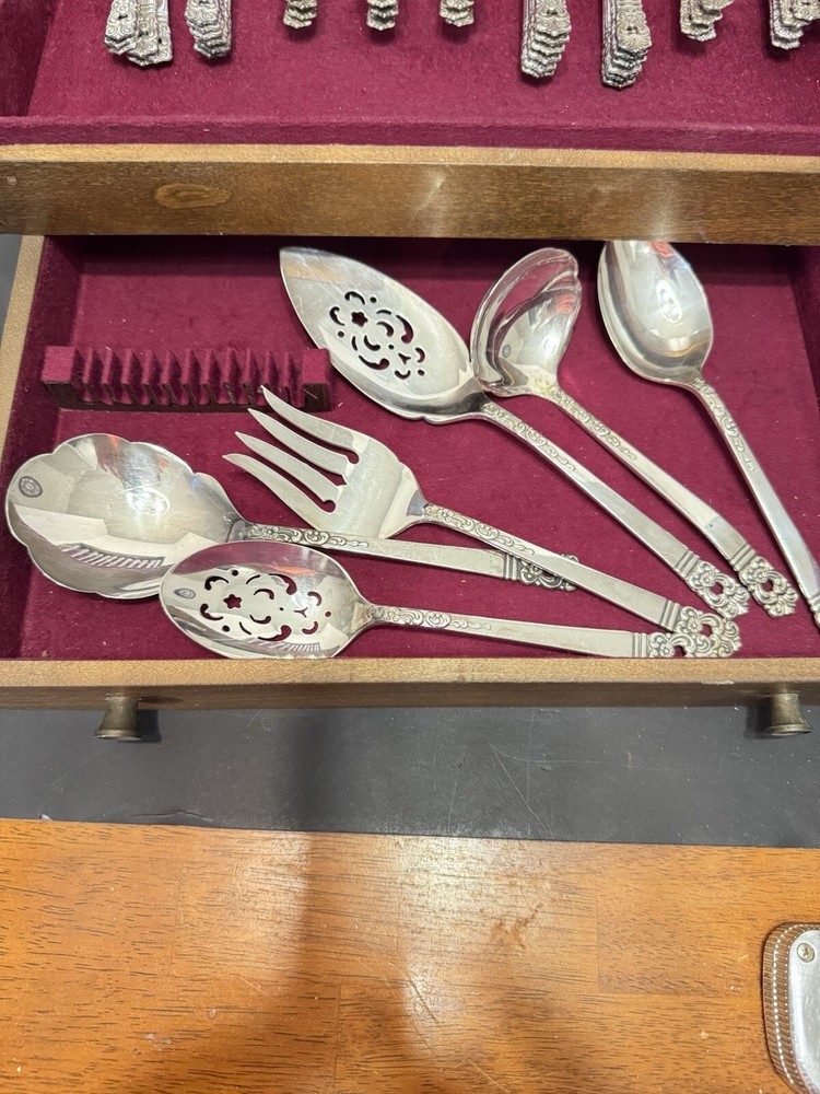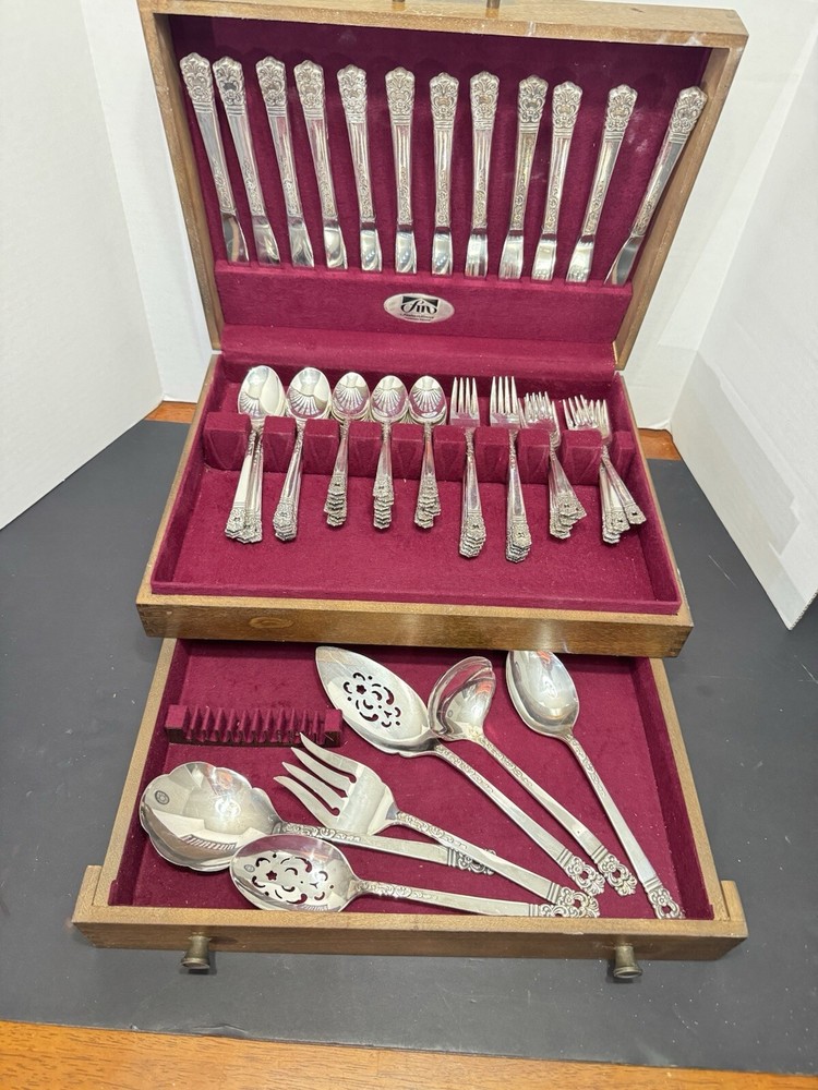Department: Adults Features: Dishwasher Safe Type: Set with Case or Tray Set Includes: Cake/Pie Slice, Fork, Knife, Serving Set, Serving Spoon, Spoon, Oval Soup Spoon Brand: ONEIDA Model: Oneida Community Material: Silver Plated Country/Region of Manufacture: United States Handle Pattern: Scandanavia Style: Mid Century Modern Danish Look Wood Tone: Walnut Handle Material: Silver Plated Service For: 12, Less 1 Salad Fork Number of Items in Set: 77 Color: Silver Occasion: Any Finish: Glossy