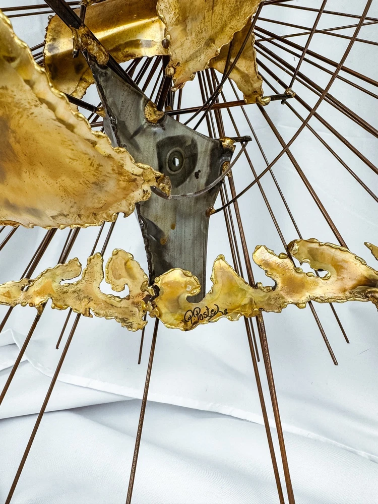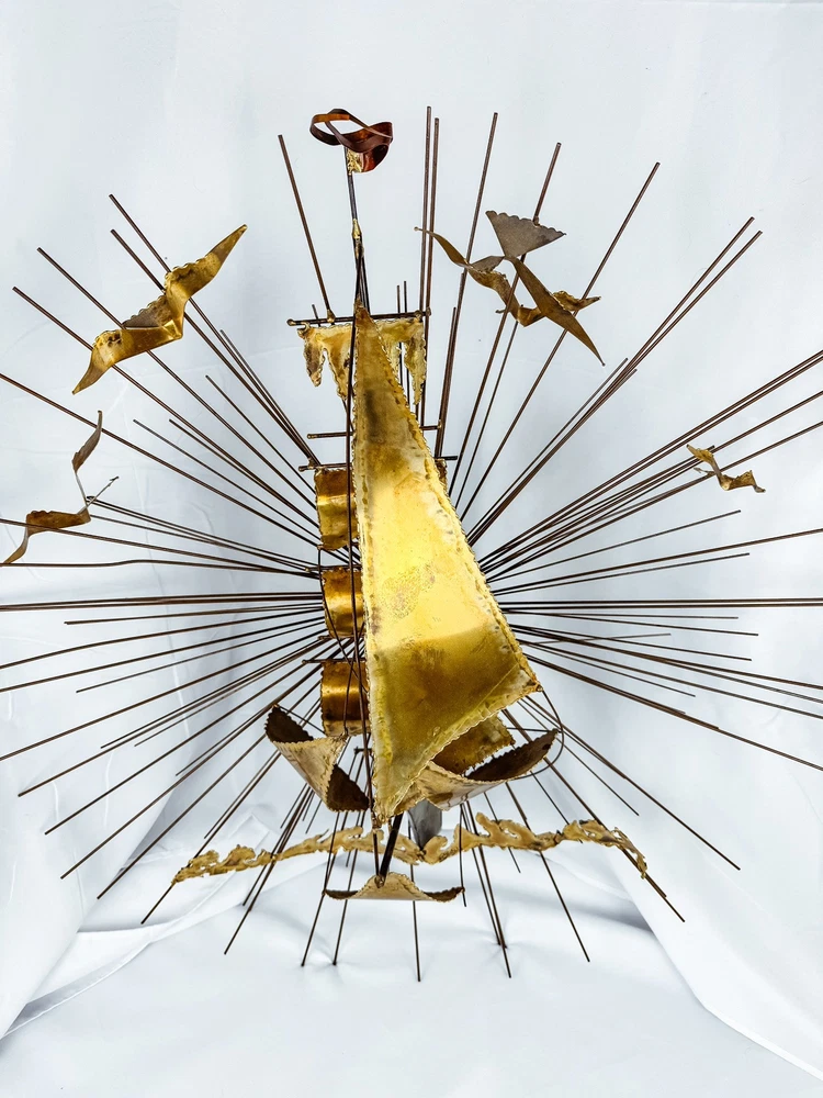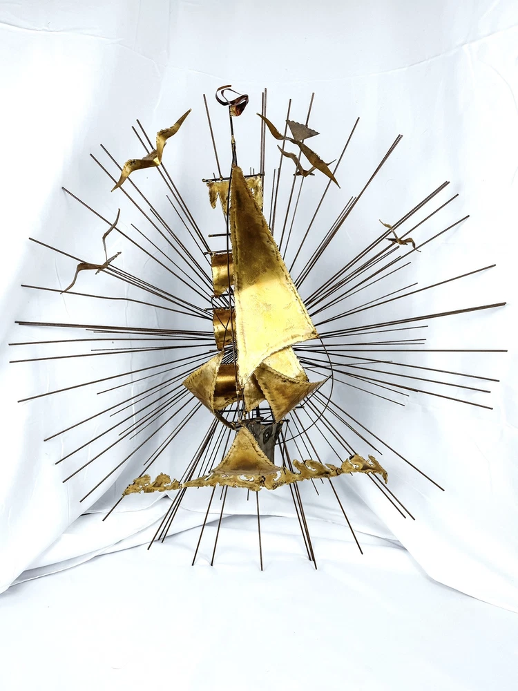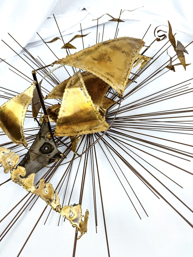 Material:MetalType:SculptureTheme:Art, NatureSubject:Ships, SunburstOriginal/Licensed Reproduction:OriginalSize:Largegtin13:Does not applyProduction Technique:MetalworkYear of Production:1978Artist:UnknownItem Length:30 inTime Period Produced:1970-1979Item Width:9 inFormat:Wall ArtHandmade:YesSigned:YesUPC:Does not applyStyle:ModernismCountry/Region of Manufacture:United StatesItem Height:30 inPeriod:Post-War (1940-1970)
