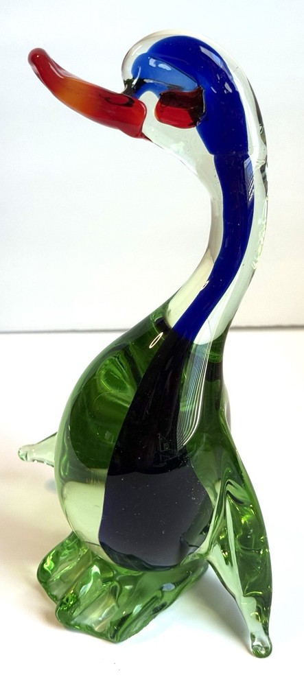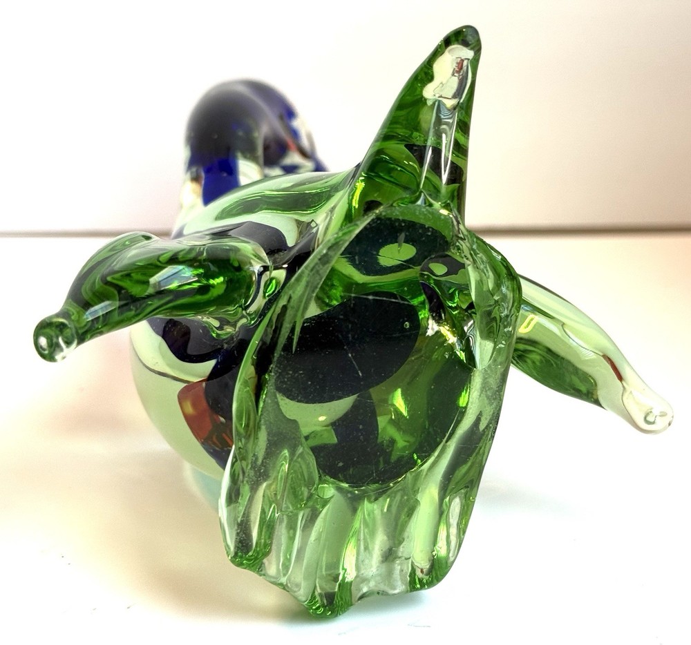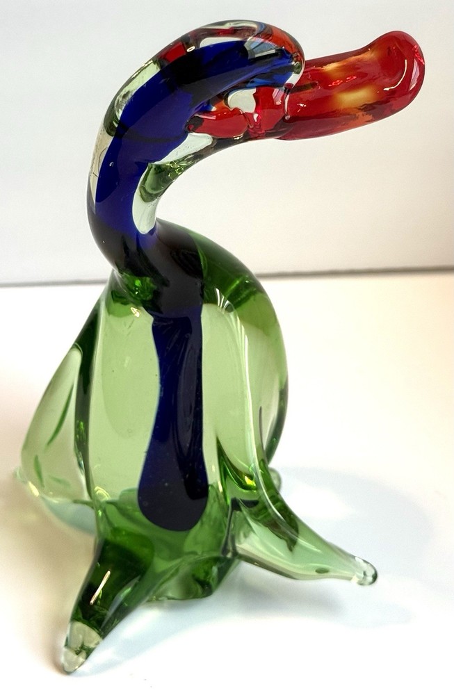 This vintage Murano glass duck figurine showcases the intricate craftsmanship of hand-blown glassmaking in Italy. Standing at 7.5 inches tall, this unique piece features a stunning blend of green, blue, and red colors known as sommerso technique. The duck figurine captures the essence of mid-century design with its delicate details and vibrant hues, making it a beautiful decorative piece for any space. Made in the renowned glassmaking city of Murano, this figurine is a timeless treasure that reflects the artistry and tradition of Venetian glassmaking.