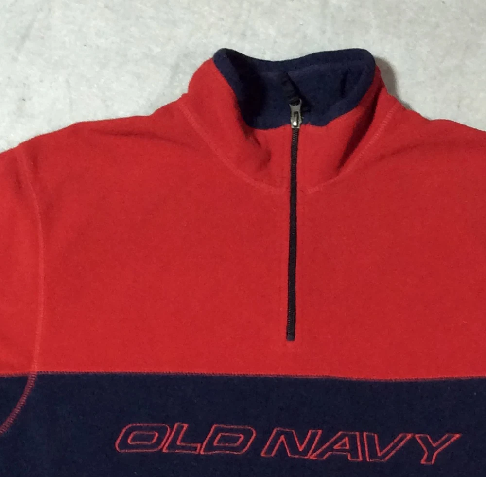 Up For Sale: Vtg Old Navy Fleece Pullover Men's Sz XL Red 1/4 Zip Sweatshirt Logo Spelled Out Size: Adult Men's Sz XL - Size XL Please see photos above for all measurements I will ship this item out USPS Priority or USPS Ground Advantage with tracking number for confirmation. I ship items out daily so quick delivery can be expected. Please feel free to ask any questions or make an offer. Thanks!