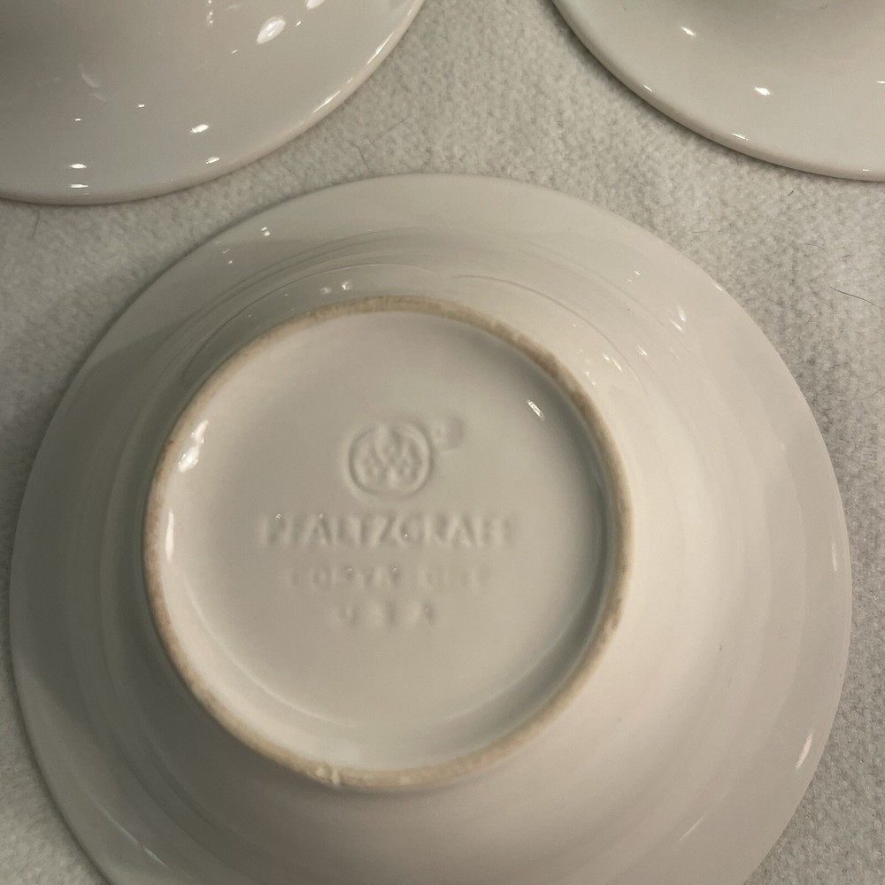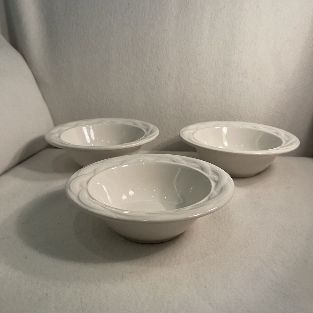 This vintage Pfaltzgraff Acadia soup bowl set includes 3 bowls made of white stoneware with a basket weave pattern. Each bowl has a diameter of 6.5 inches and a height of 2 inches, weighing a total of 2.6 lbs. The bowls are microwave and dishwasher safe, making them convenient for everyday use. Produced in the 1990s using art pottery techniques, these soup bowls add a touch of vintage charm to your tableware collection. Excellent condition. No chips or cracks.