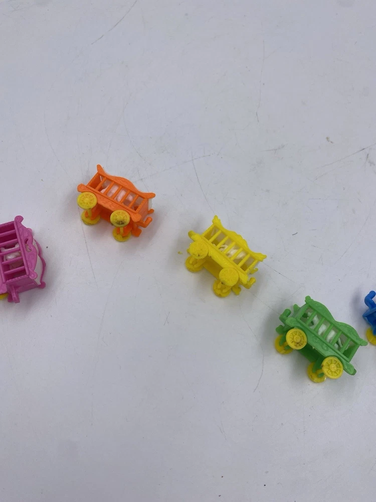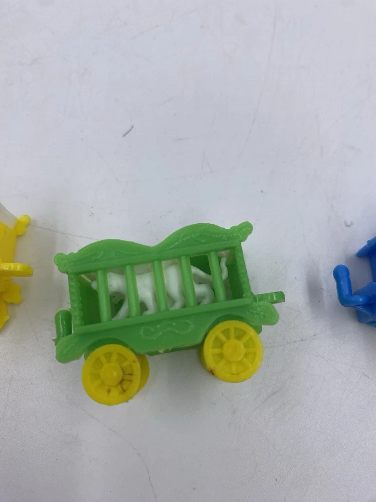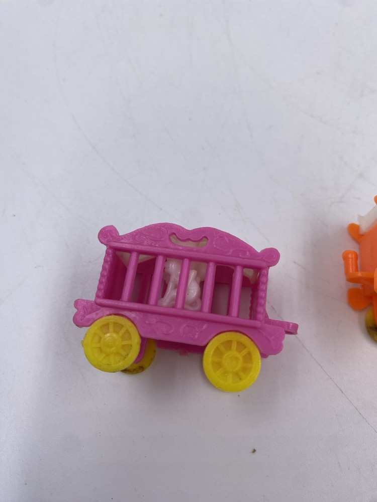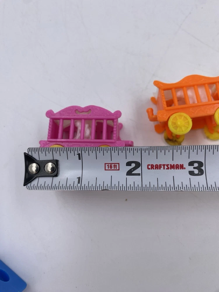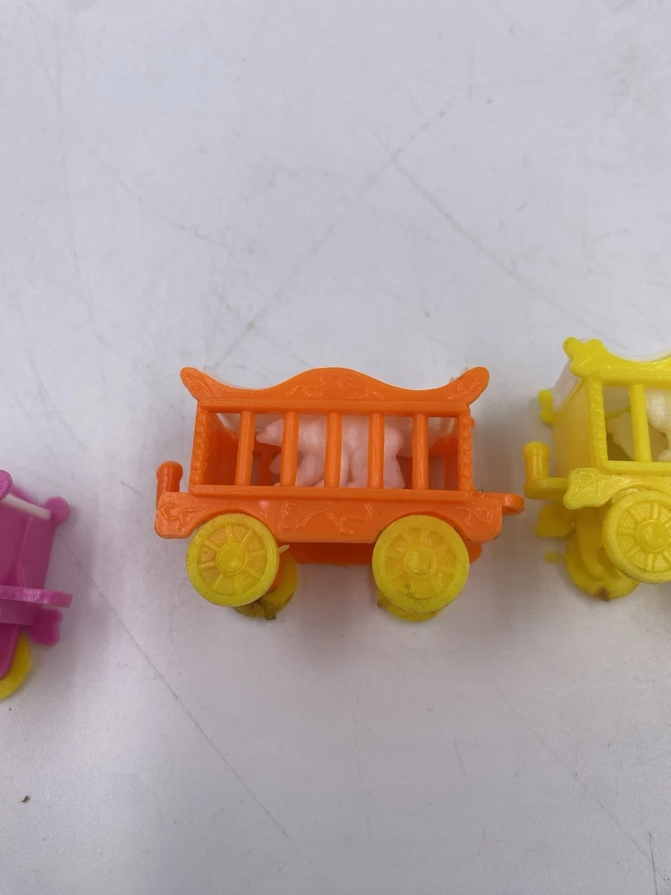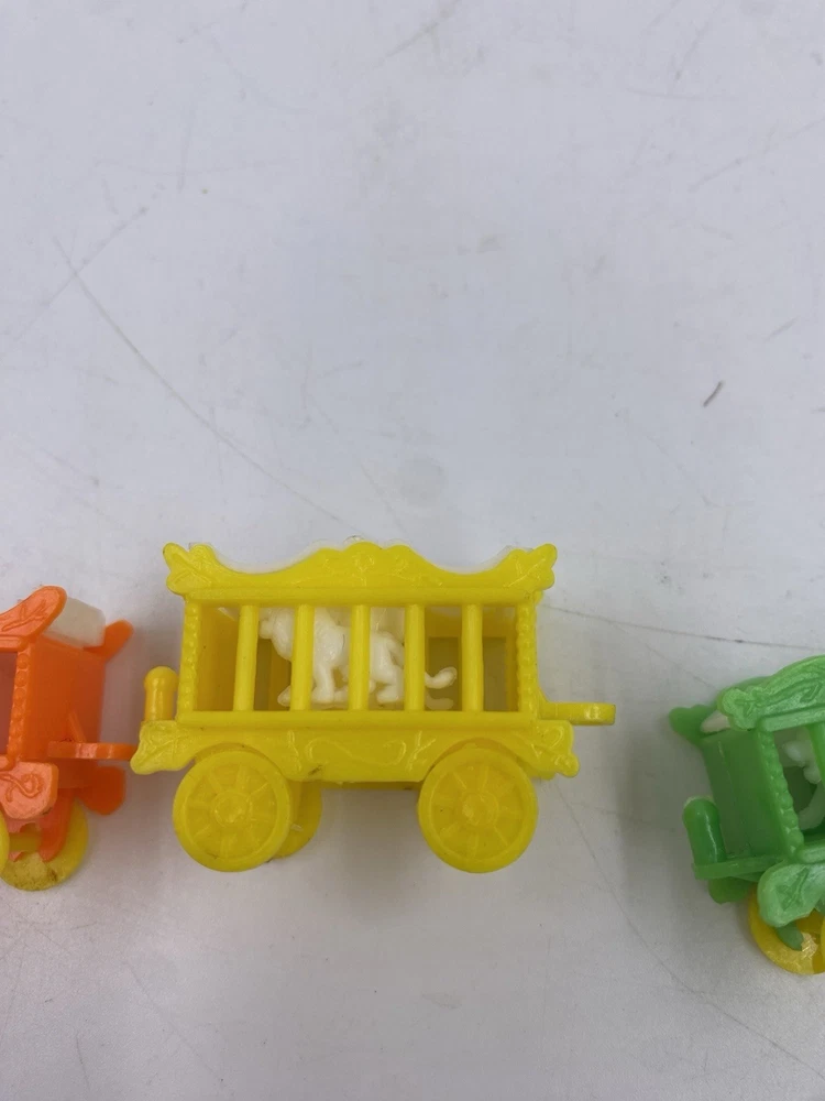 This is a 6 piece vintage plastic circus train cake topper set. These are used and the Pink train has a broken tab on the tongue as shown. That piece is actually stuck in the blue train. These are in good used condition but they do have signs of age and use. They has some discoloration on the wheels as shown. You get the actual items pictured so please look at all photos and ask any questions before purchase.