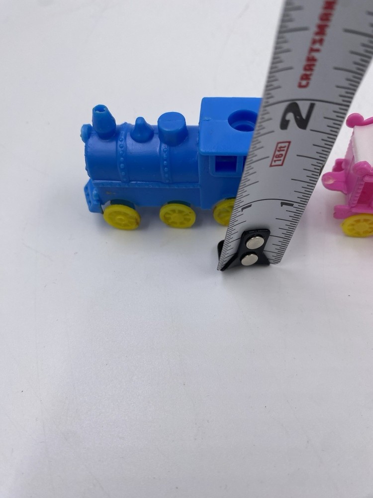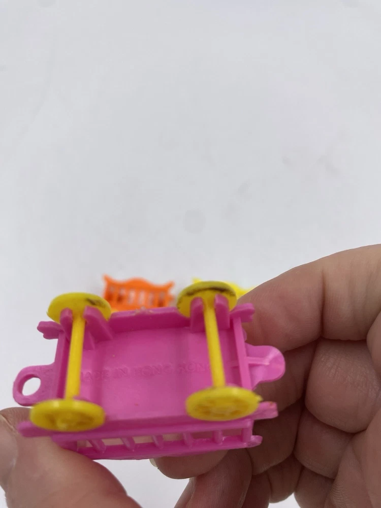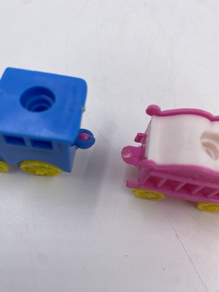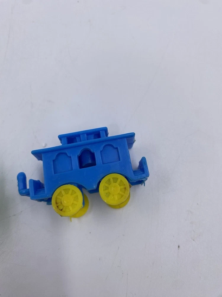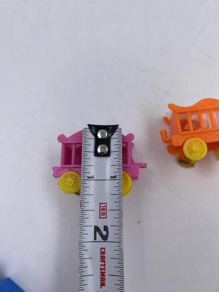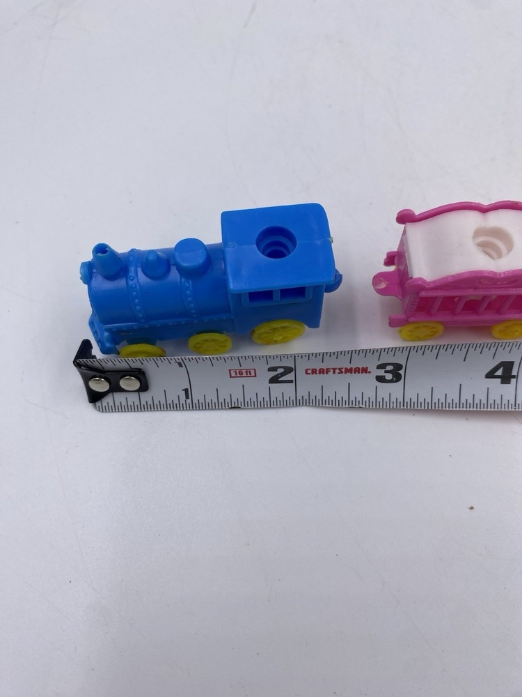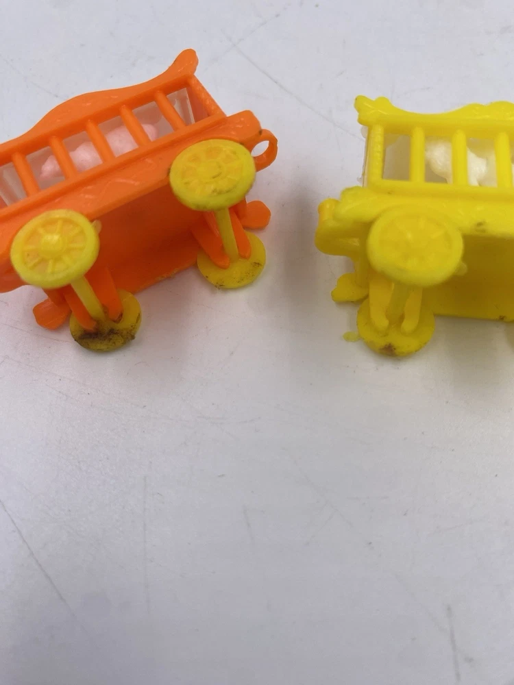 This is a 6 piece vintage plastic circus train cake topper set. These are used and the Pink train has a broken tab on the tongue as shown. That piece is actually stuck in the blue train. These are in good used condition but they do have signs of age and use. They has some discoloration on the wheels as shown. You get the actual items pictured so please look at all photos and ask any questions before purchase.